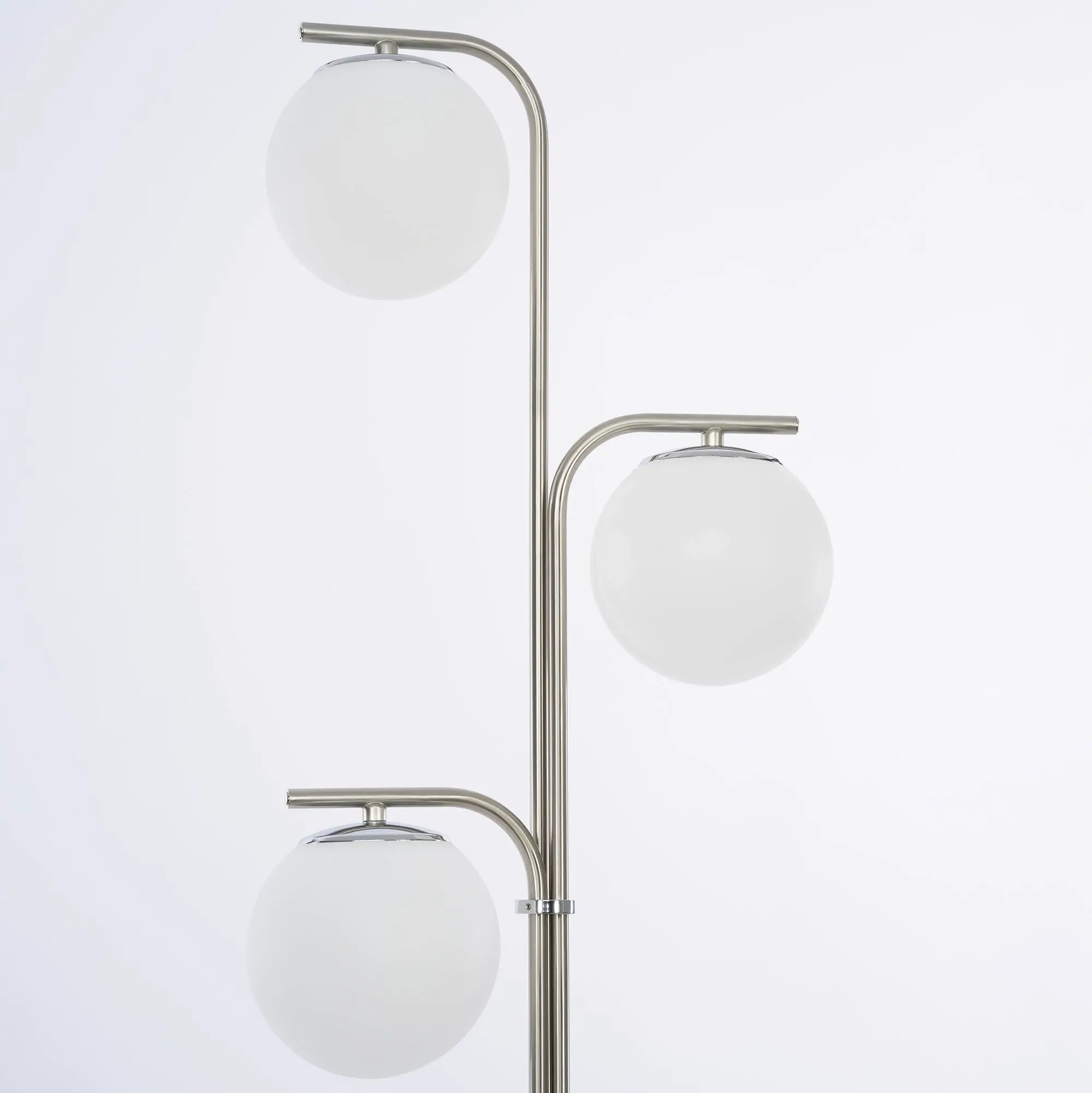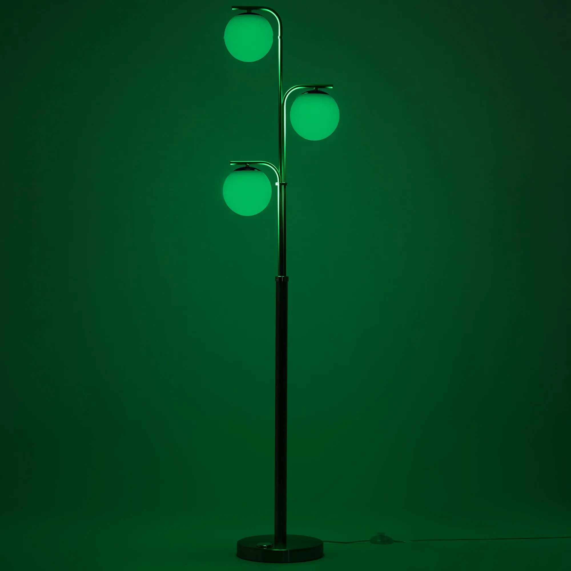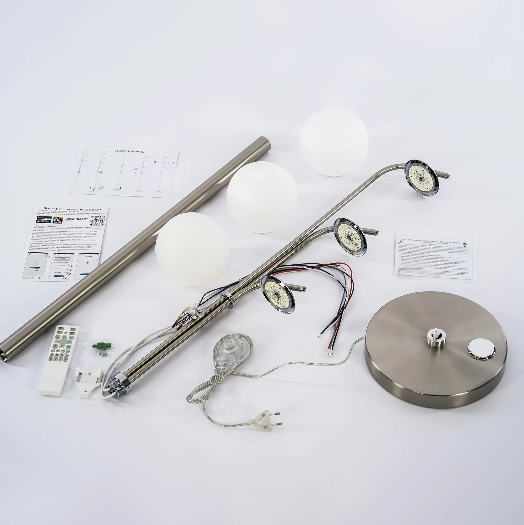 Корпус светильника металлический, цвет матовый хром. Основание устойчивое круглой формы, на стойке три плафона в форме шара из белого оптического полимера. Внутри каждого плафона расположена уникальная светодиодная панель, обеспечивающая яркое основное освещение или красочную RGB подсветку, с плавной регулировкой яркости во всех режимах света.