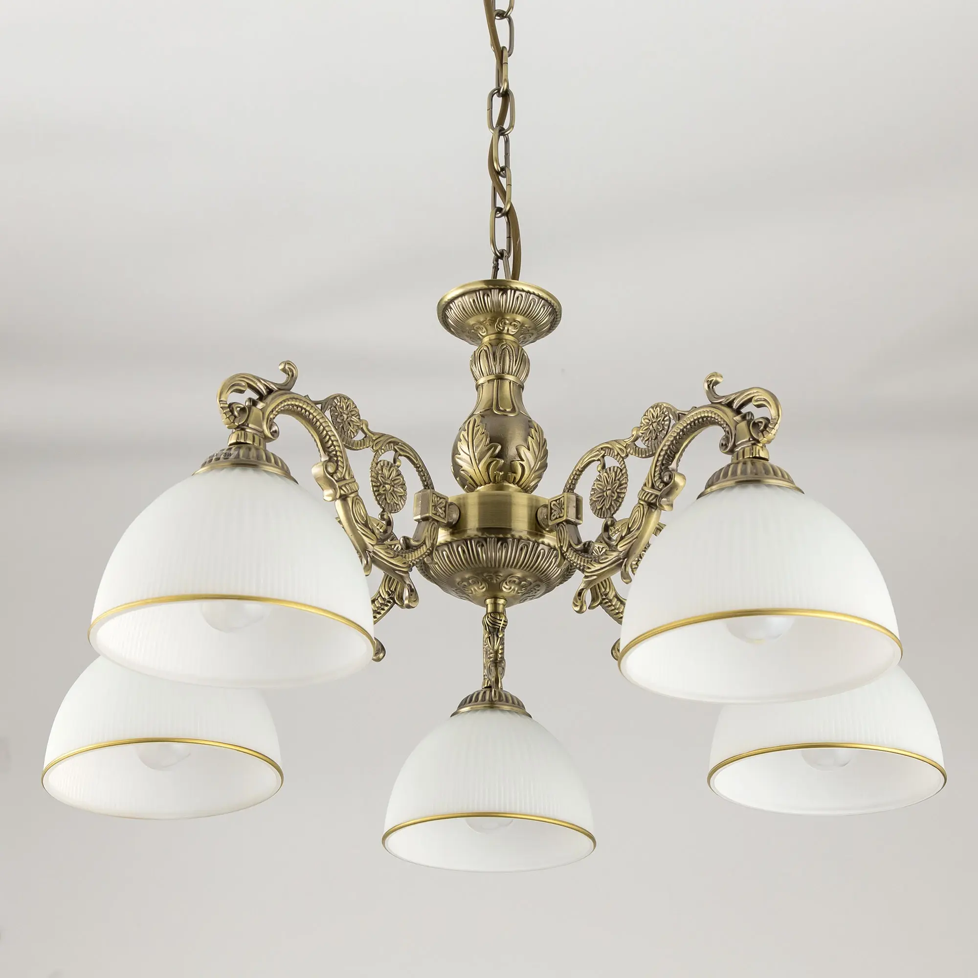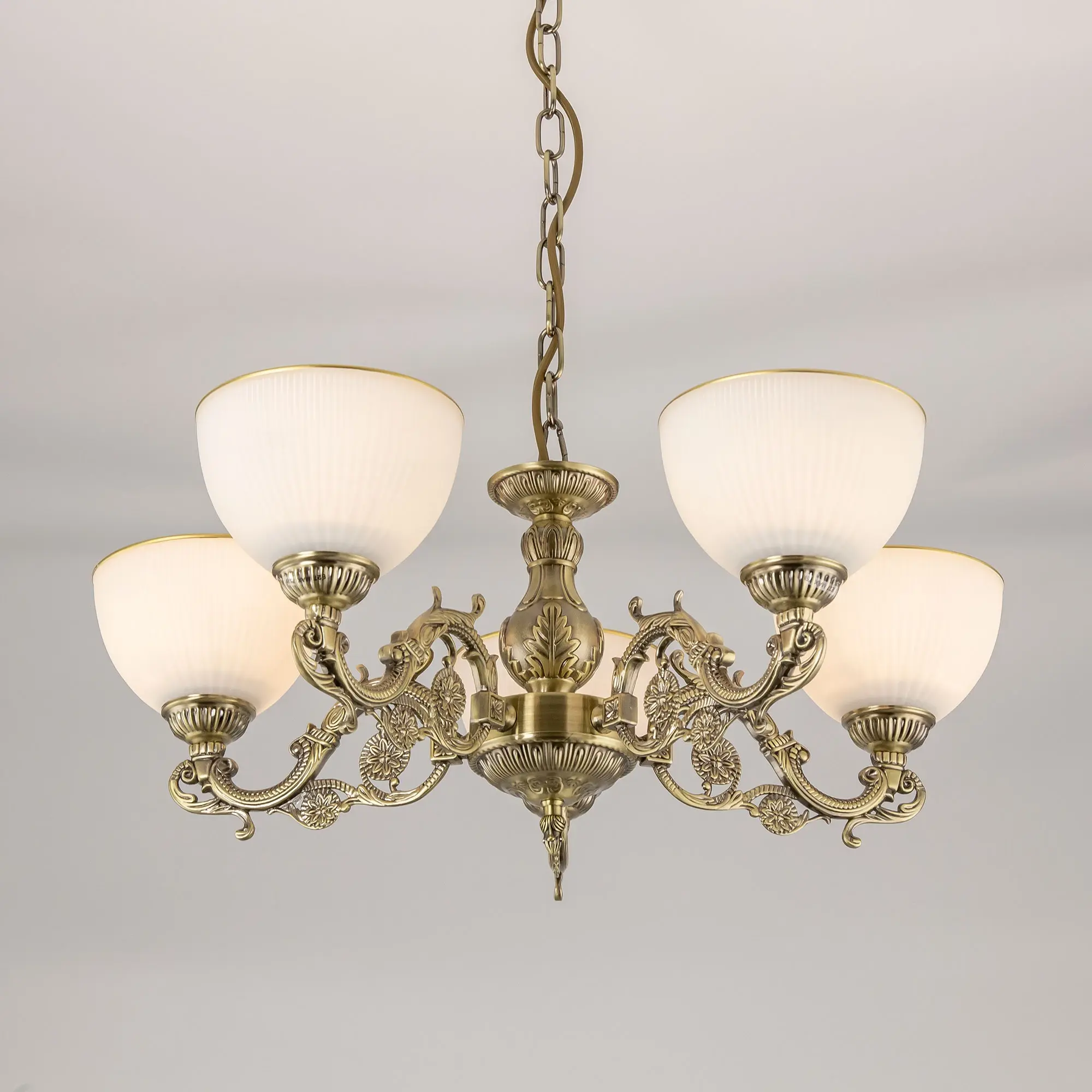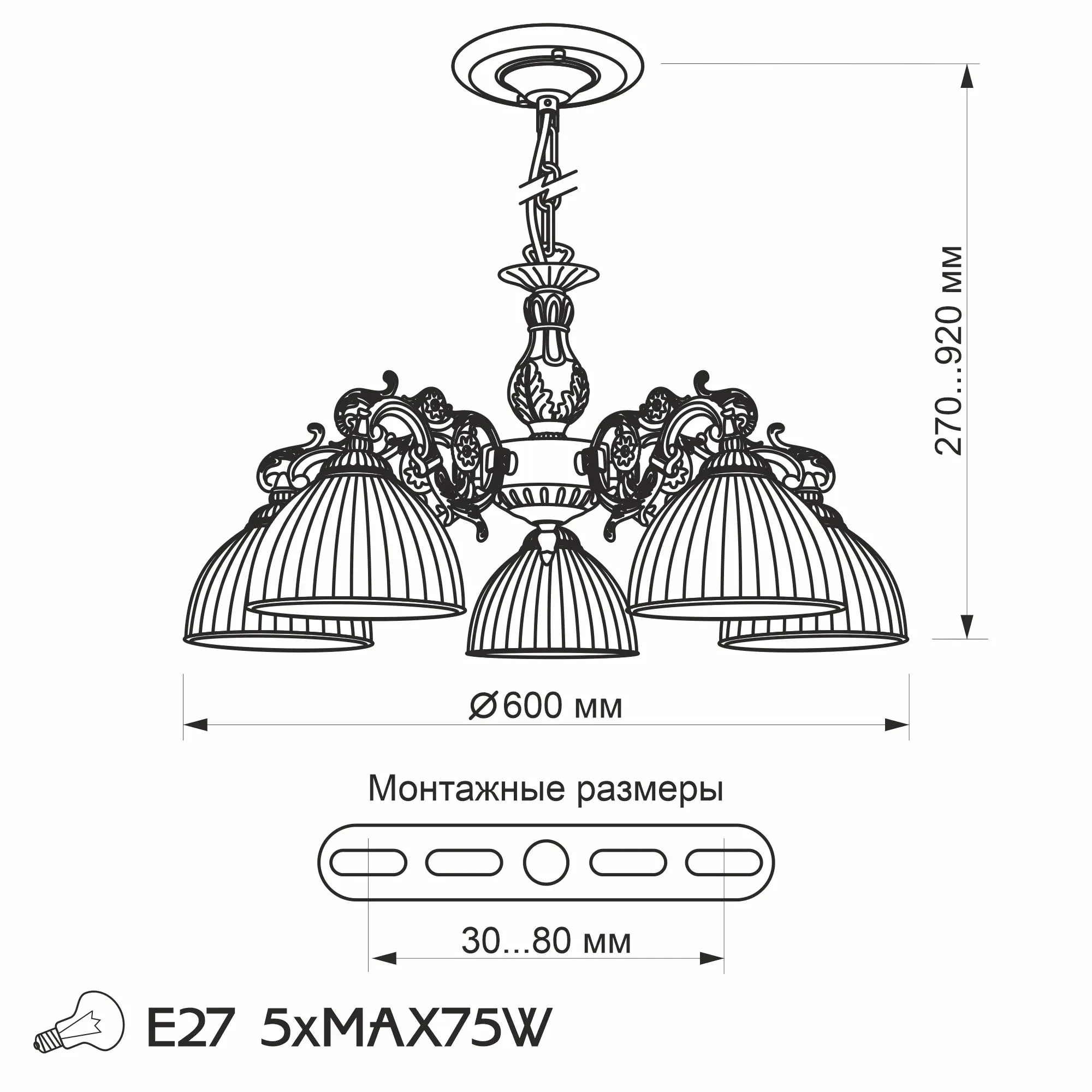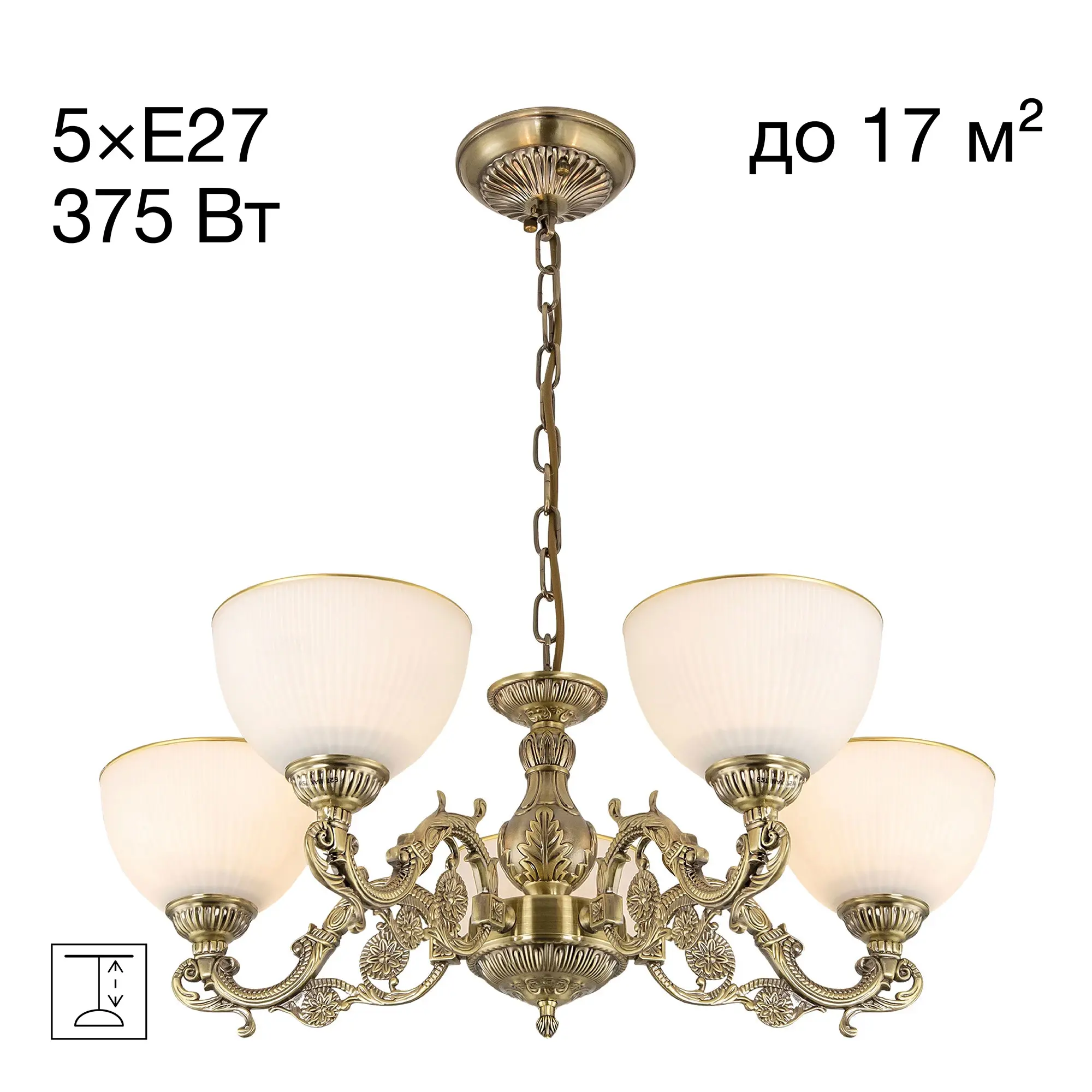 Люстра подвесная Ситилюкс CL405253 пятирожковая, выполнена в классическом стиле. Корпус модели металлический, с литыми рожками, цвет бронза. Плафоны стеклянные, матовые, рифленые с благородной золотистой окантовкой. Люстра поставляется в виде комплекта для самостоятельной сборки, с подробной инструкцией. Из данного комплекта, можно “сделать” подвесную люстру с плафонами, направленными вверх, дающую мягкий отраженный свет или более яркий вариант с плафонами вниз. Такой вариант подойдет для высоких потолков. При этом высоту люстры в 75 см можно уменьшить, сократив количество звеньев цепи с помощью удобного карабина. Если в помещении низкие потолки, люстру можно собрать вообще без элементов цепи, как потолочную, высотою всего 30 см. Более того, на стадии сборки Вы можете скоммутировать люстру для работы, как с одноклавишным, так и с двухклавишным выключателем. В модели используются лампы с цоколем Е27 и максимальной мощностью для ламп накаливания 75Вт. Суммарная мощность 375 Вт. Светодиодные лампы можно использовать большей яркости.