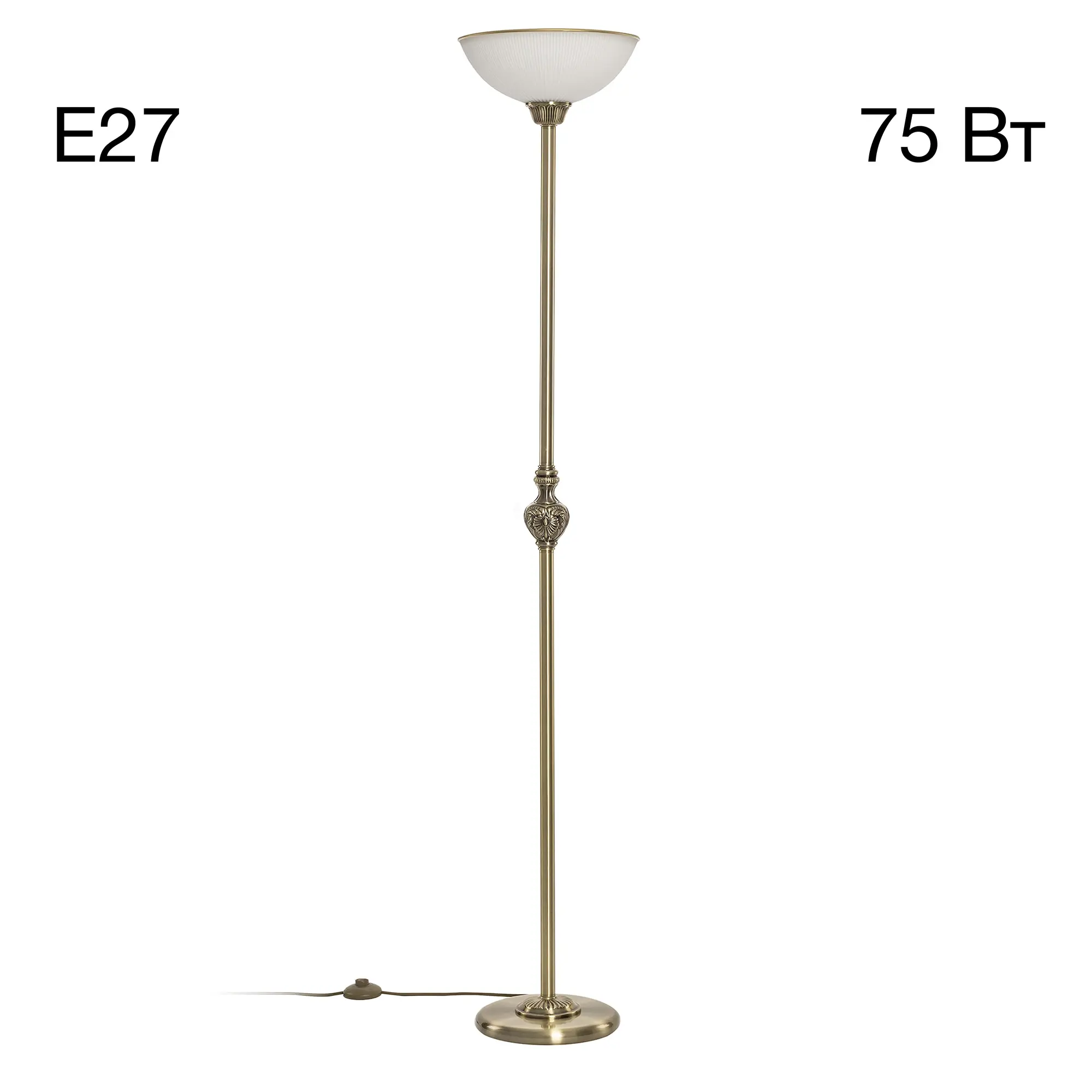 В изделии 1 лампа с цоколем Е27 максимальной мощностью для ламп накаливания 75Вт (в комплект не входит, приобретается отдельно). Высота светильника 1,65м, диаметр основания 25см, диаметр плафона 30см. Удобный напольный выключатель находится на сетевом проводе (длина провода 2м).