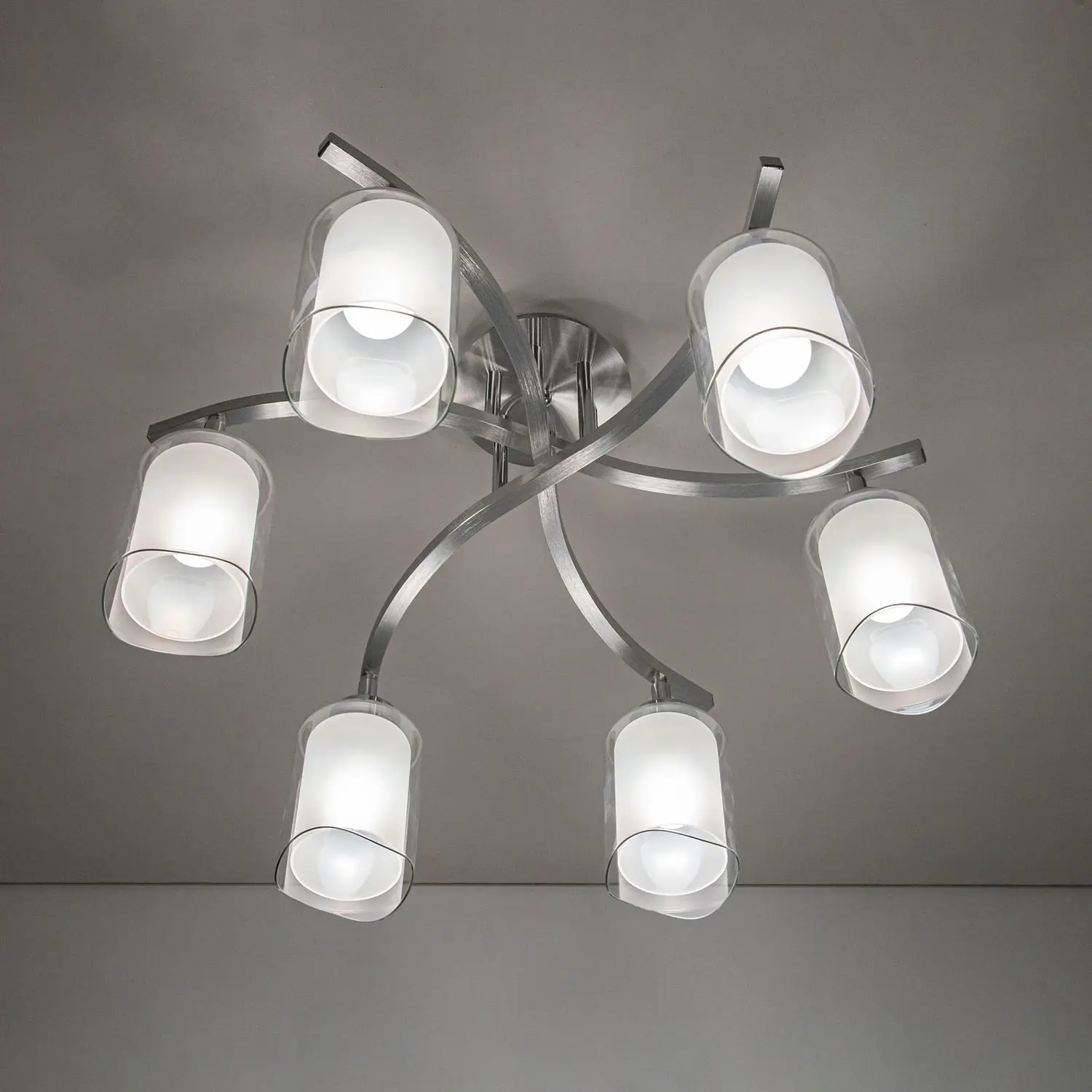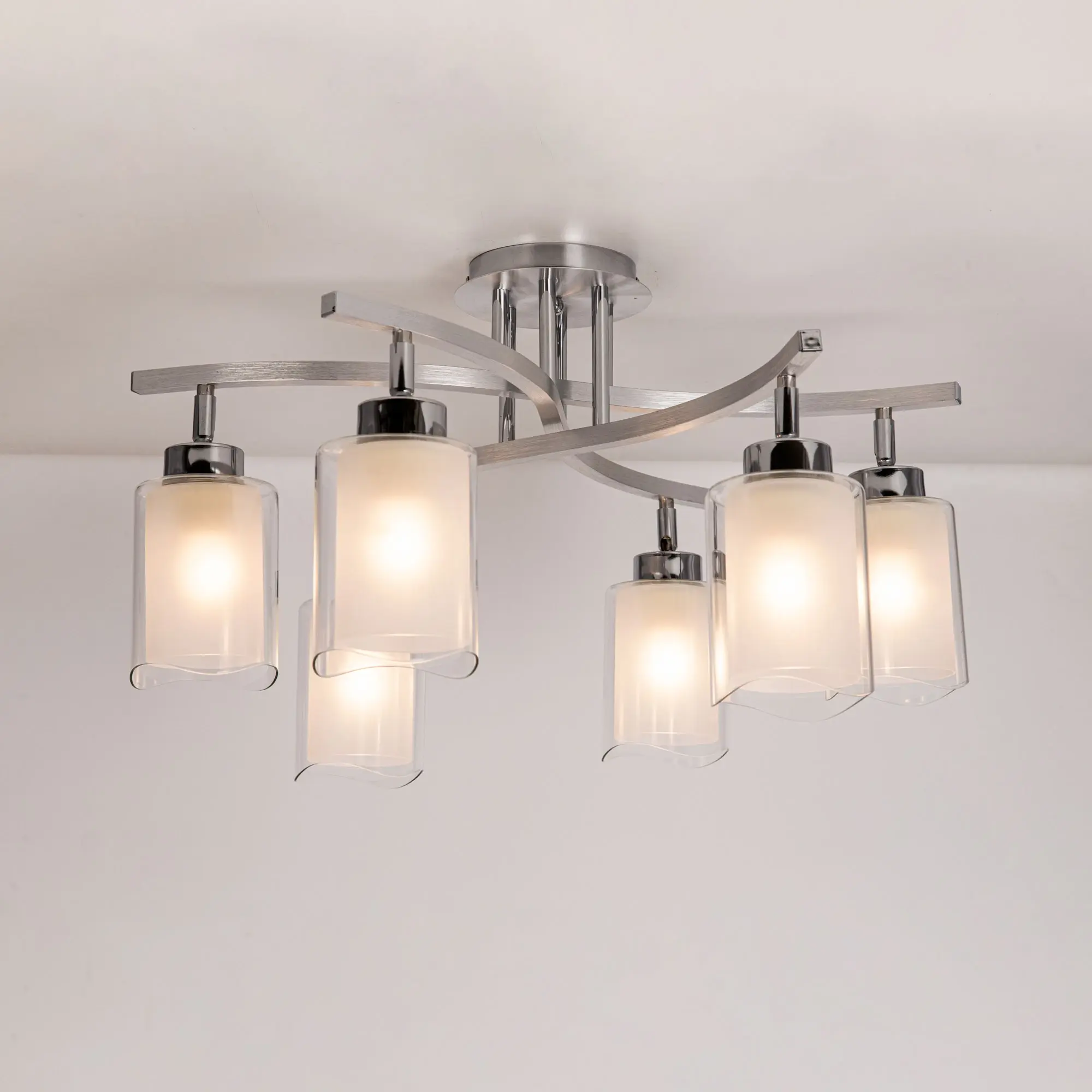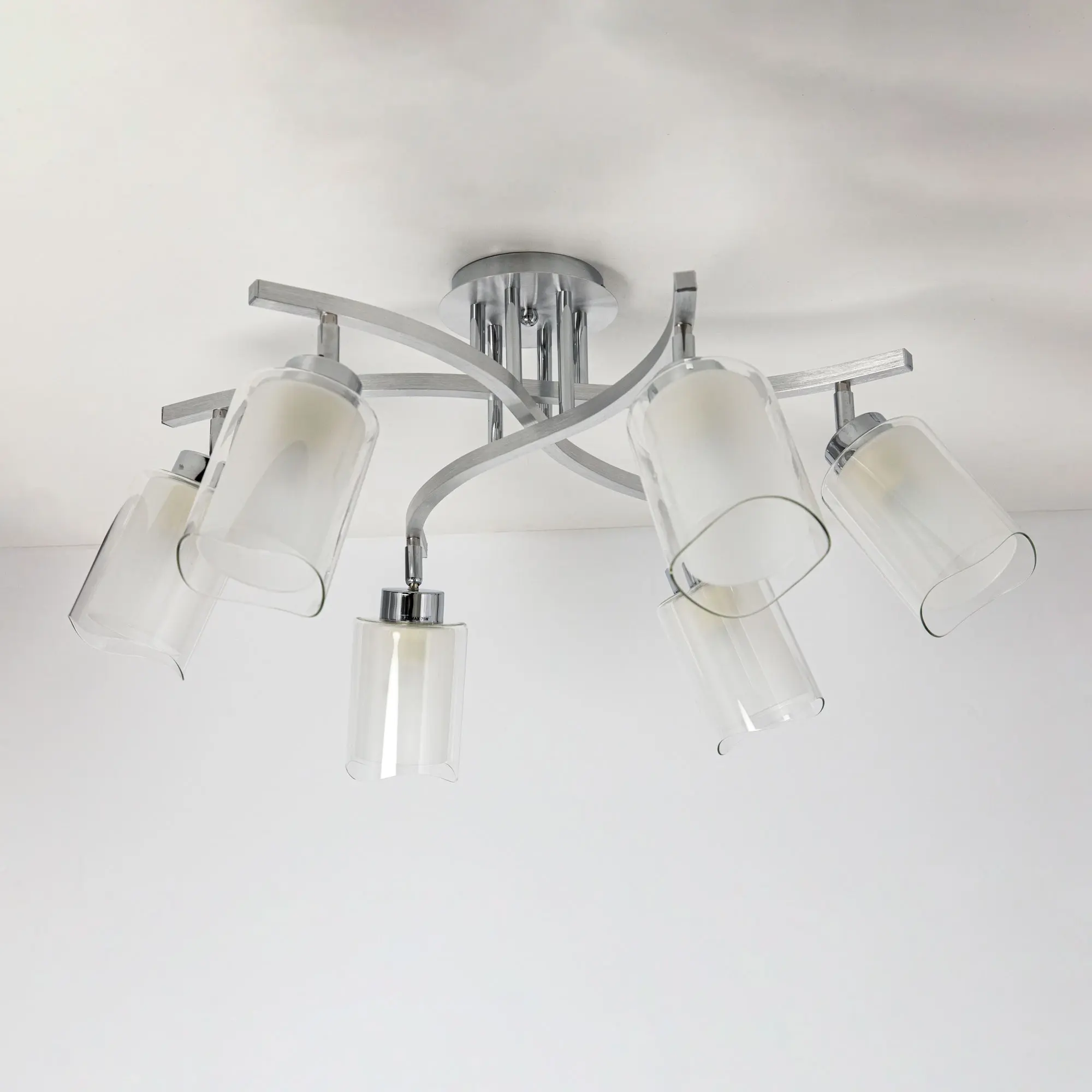 Потолочная люстра Citilux Аэлита CL169161 выполнена в современном стиле. Корпус светильника металлический с изогнутыми рожками, цвет алюминий с декоративными хромированными элементами. Плафоны двойные, состоят из двух отдельных частей. Внутренний плафон цилиндрической формы из полуматового стекла, внешний плафон из прозрачного стекла, в сечении квадратной формы с закруглёнными углами и волнистым краем. Плафоны на поворотных шарнирах, можно направить в любую сторону. В изделии используются лампы с цоколем Е27, максимальной мощности для ламп накаливания 75Вт (в комплект не входят, приобретаются отдельно). Шестирожковая люстра Citilux Аэлита CL169161 отлично подойдёт для освещения современных интерьеров в комнатах со стандартными и низкими потолками.,