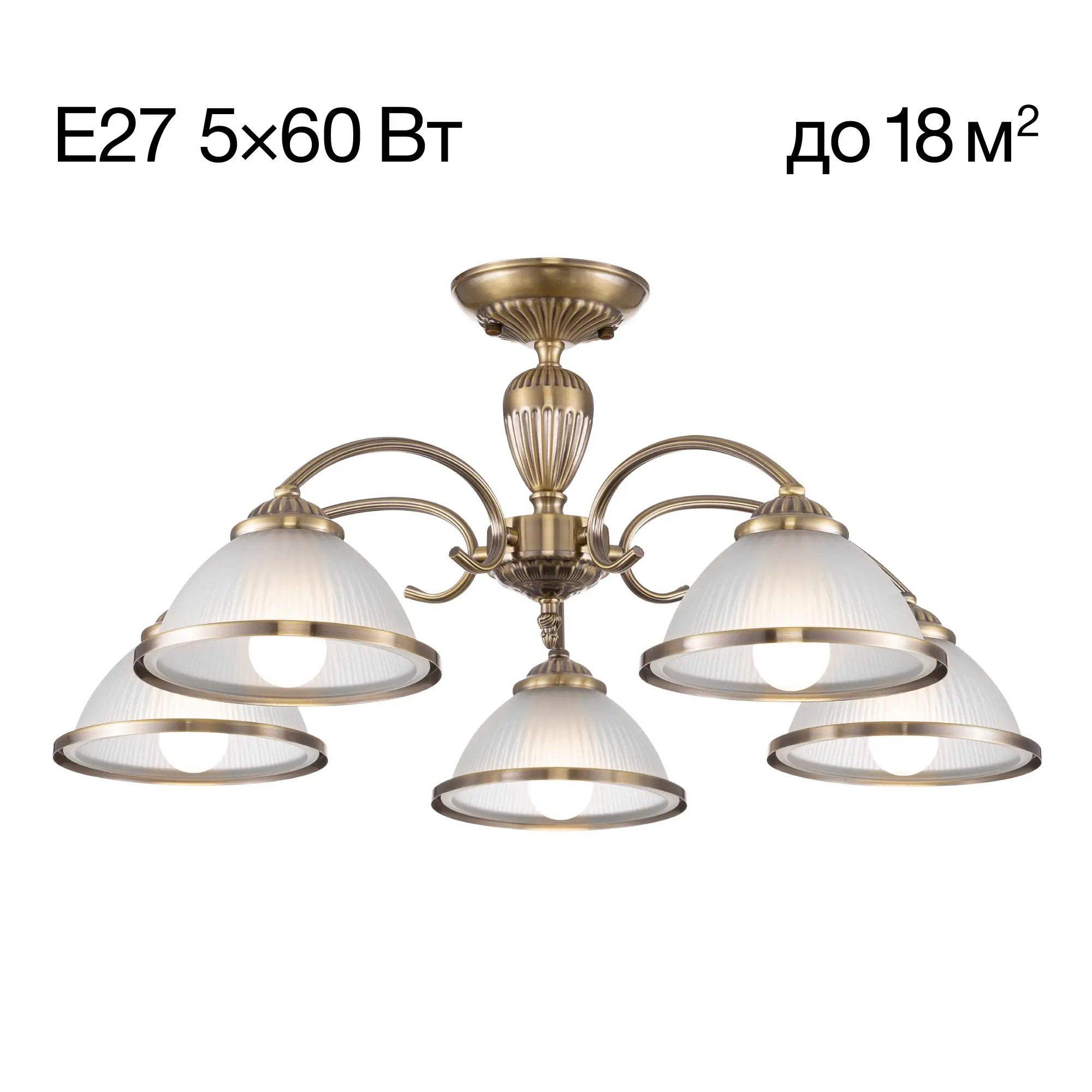В изделии 5 ламп с цоколем Е27, максимальной мощностью для ламп накаливания 60Вт. Светодиодные лампы можно устанавливать более яркие. Светильник совместим с одноклавишным и двухклавишным выключателями, что позволяет регулировать уровень освещённости в любом помещении, будь то гостиная, спальня, кухня или кабинет. Подходит для всех видов потолков, в том числе натяжных, тип крепления – планка.