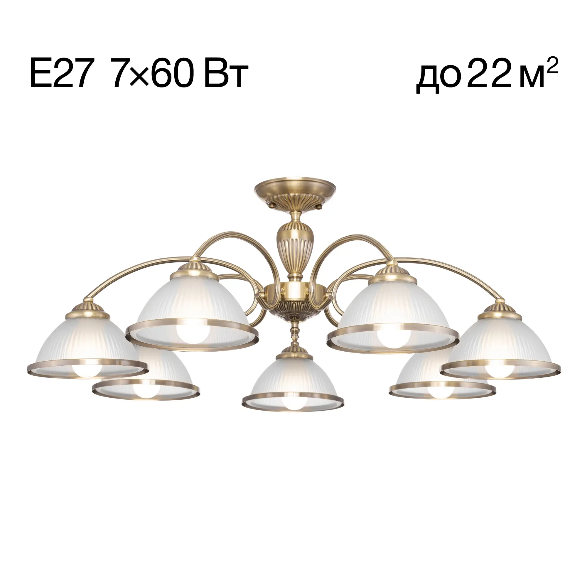 В изделии 7 ламп с цоколем Е27, максимальной мощностью для ламп накаливания 60Вт. Светодиодные лампы можно устанавливать более яркие. Светильник совместим с одноклавишным и двухклавишным выключателями, что позволяет регулировать уровень освещённости в любом помещении, будь то гостиная, спальня, кухня или кабинет. Подходит для всех видов потолков, в том числе натяжных, тип крепления – планка.