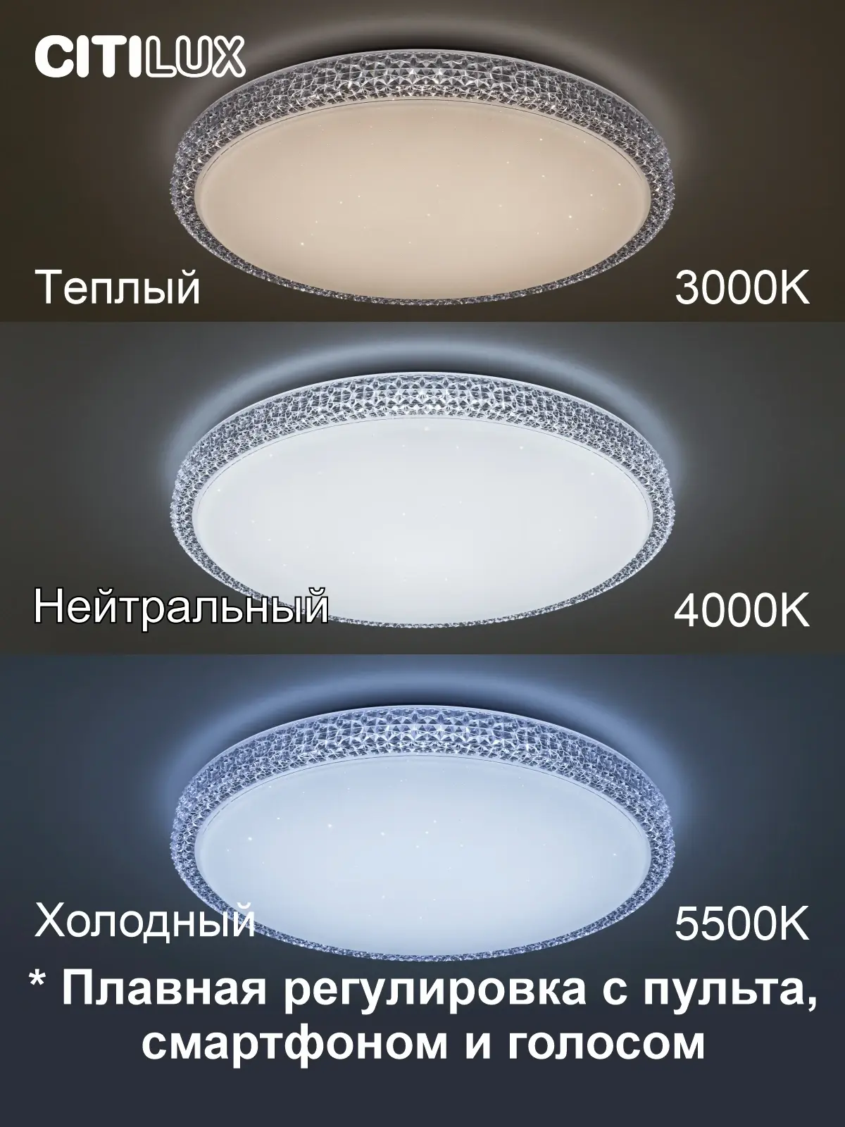 Светодиодная потолочная люстра Citilux Альпина Смарт CL718A60G с голосовым управлением является ярким представителем современных УМНЫХ хай-тек светильников экосистемы Citilux SMART. Выпускается с белым глянцевым плафоном с эффектом звездного небо и красивой рифленой окантовкой. Светильник накладной, круглой формы, крепление подходит для всех типов потолков, в том числе натяжных. Моделью можно управлять: из приложения на смартфоне по Wi-Fi при наличии интернета, с помощью голосовых помощников Алиса и Маруся, есть возможность запуска настроенных сценариев с помощью Сири, а также пультом дистанционного управления и с настенного выключателя. Модель оснащена мощными светодиодами холодного и теплого света, независимой цветной подсветкой RGB. Мощность светильника 80Вт, с диммером и функцией плавной регулировки.,