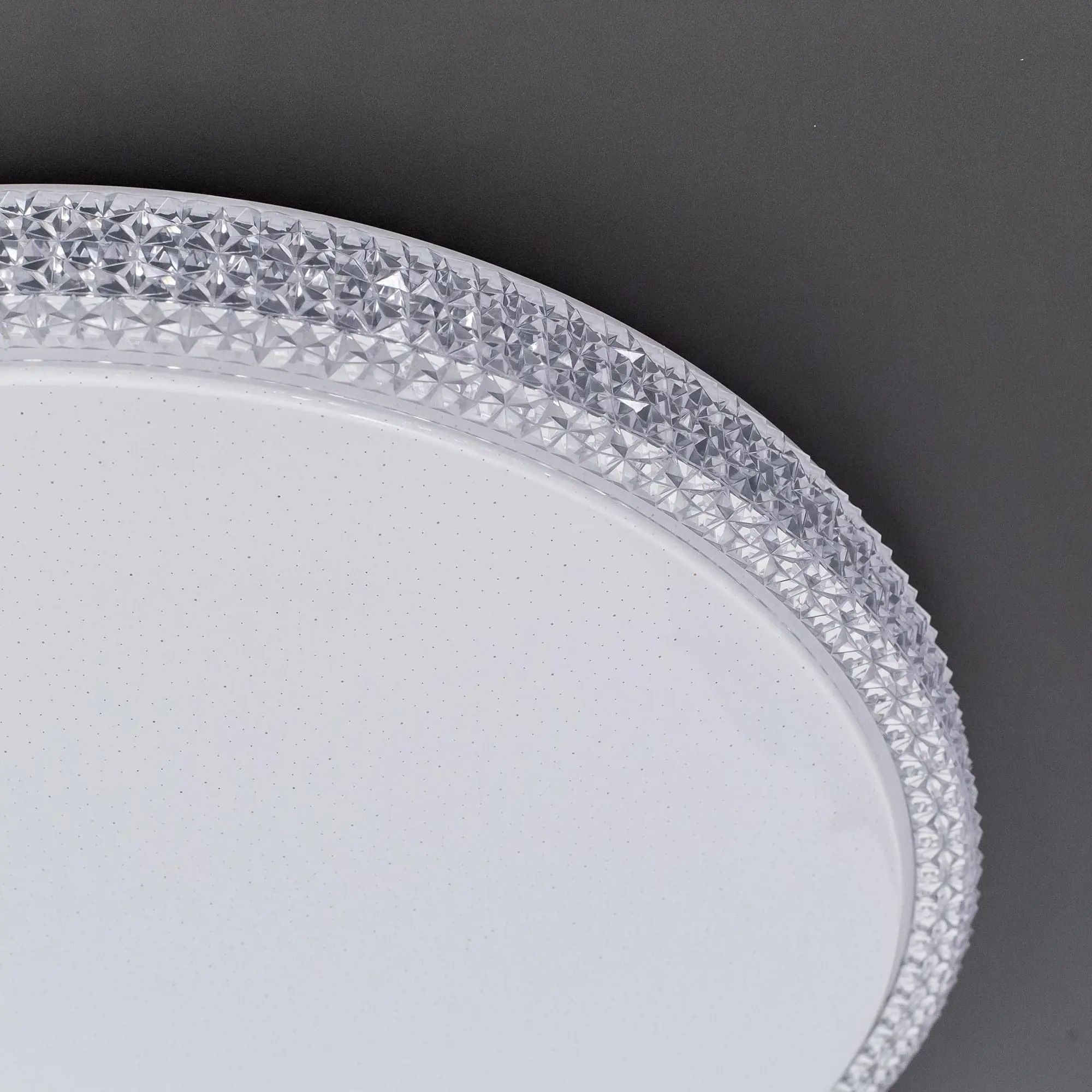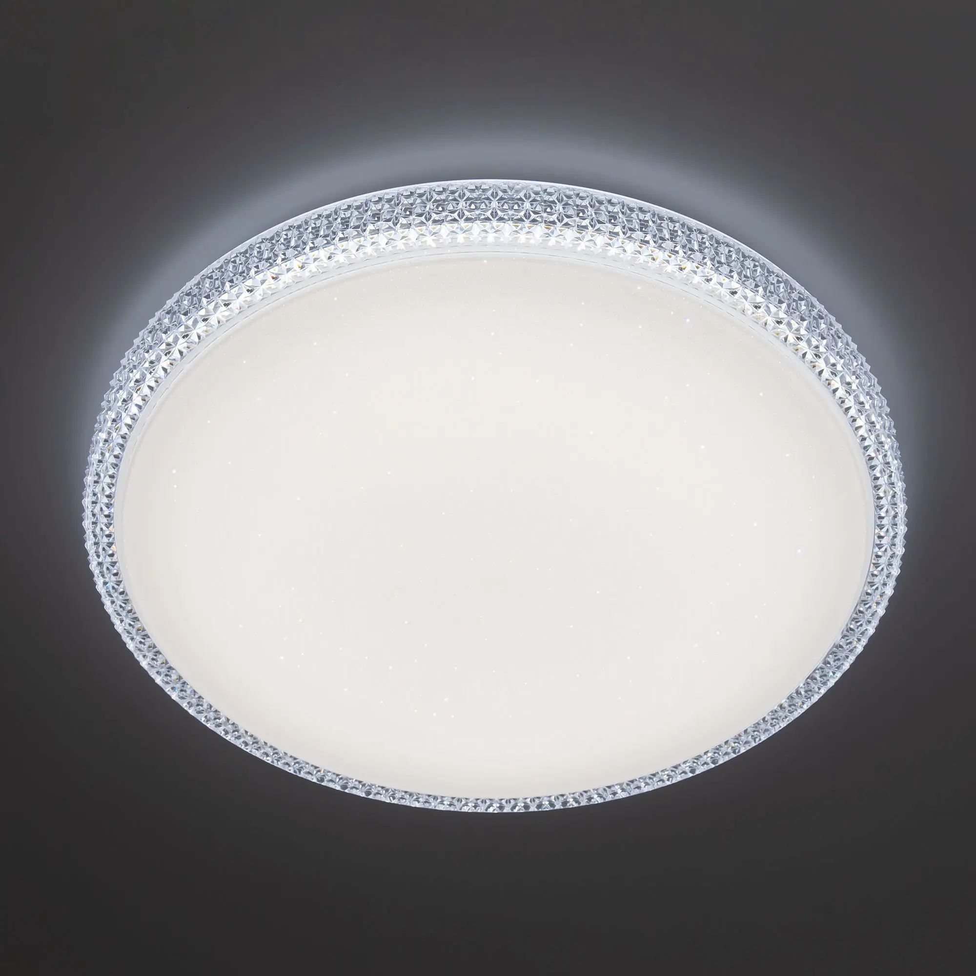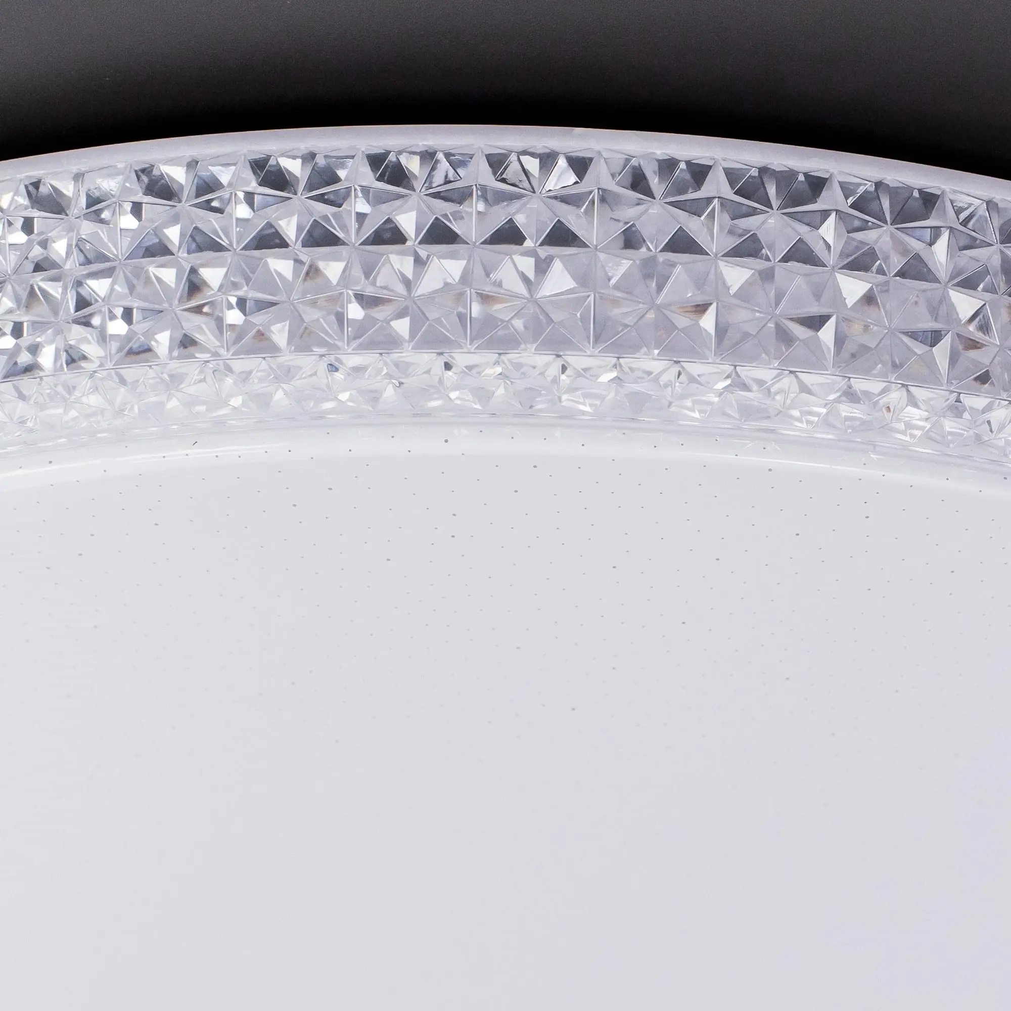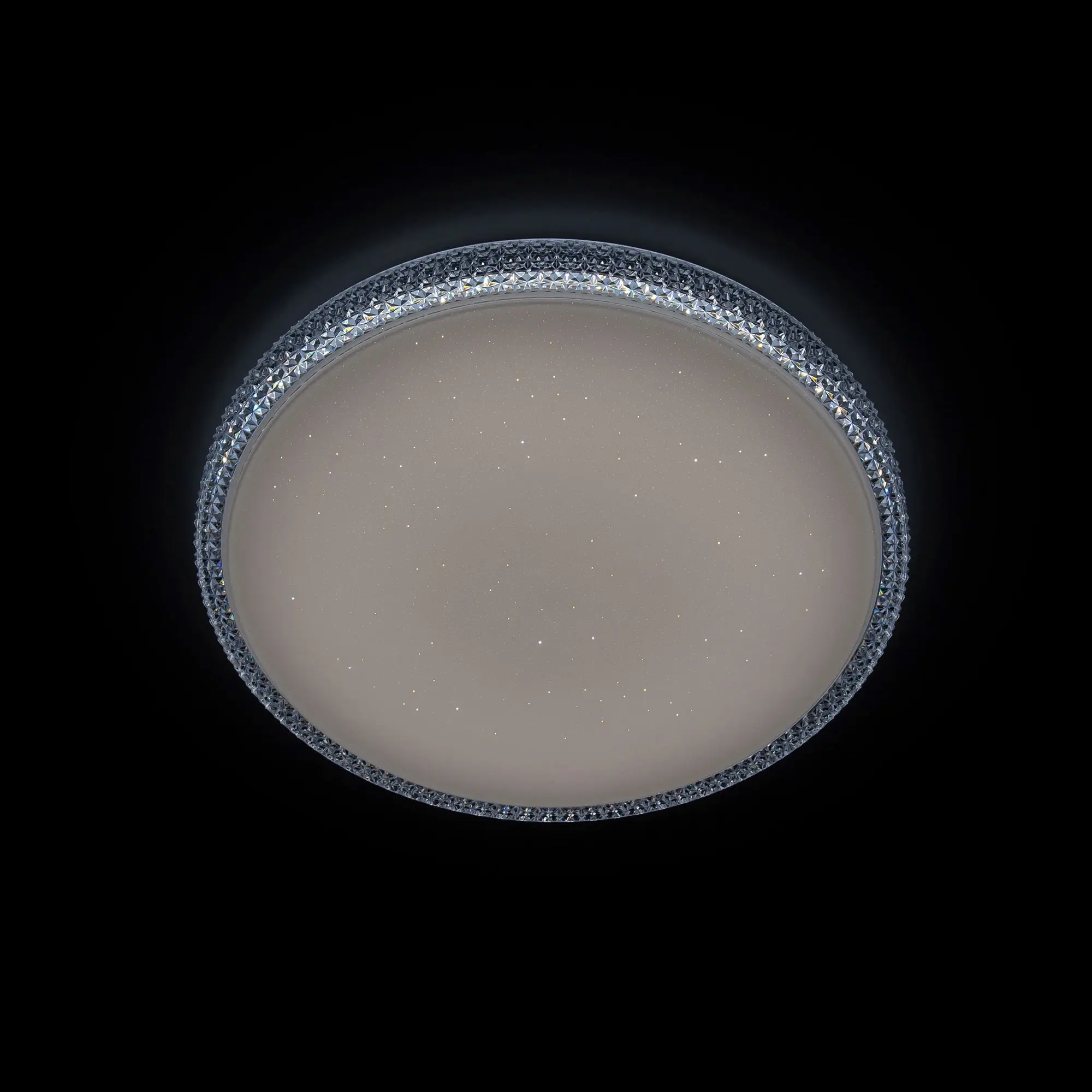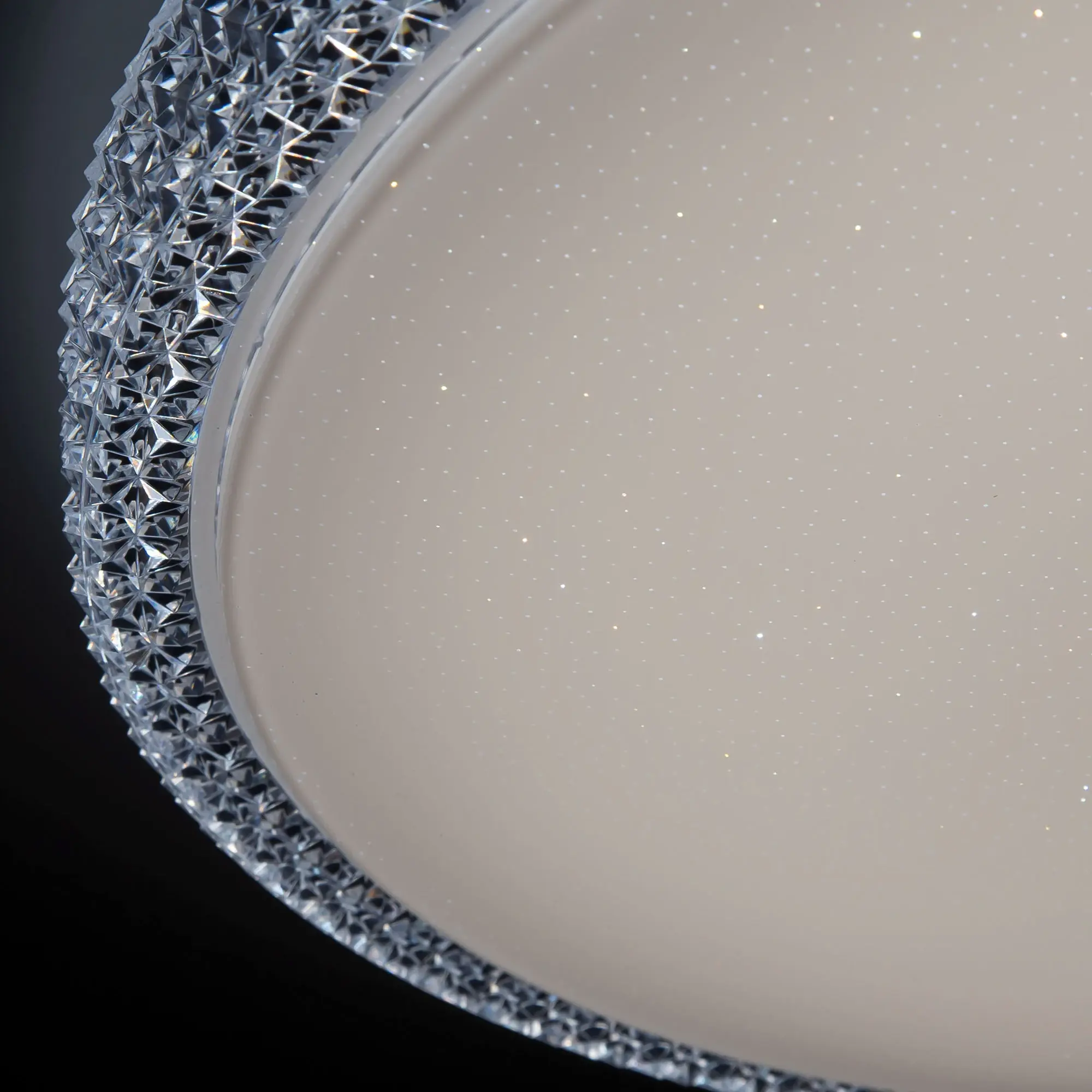Выпускается с белым глянцевым плафоном с эффектом звездного небо и красивой рифленой окантовкой. Светильник накладной, круглой формы, крепление подходит для всех типов потолков, в том числе натяжных.