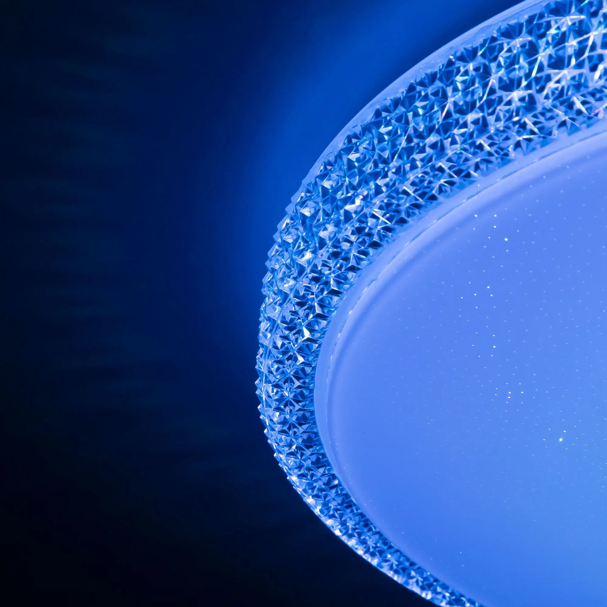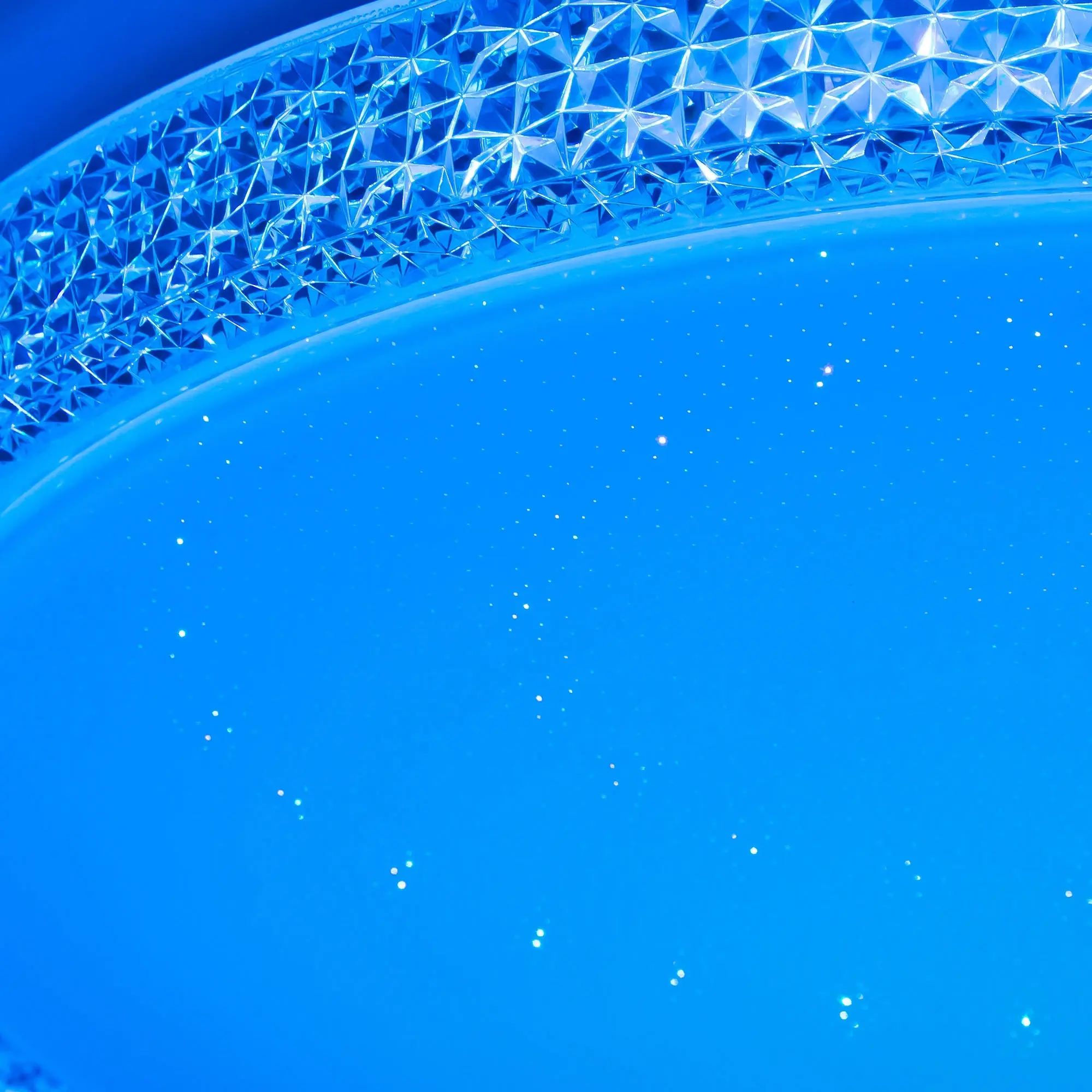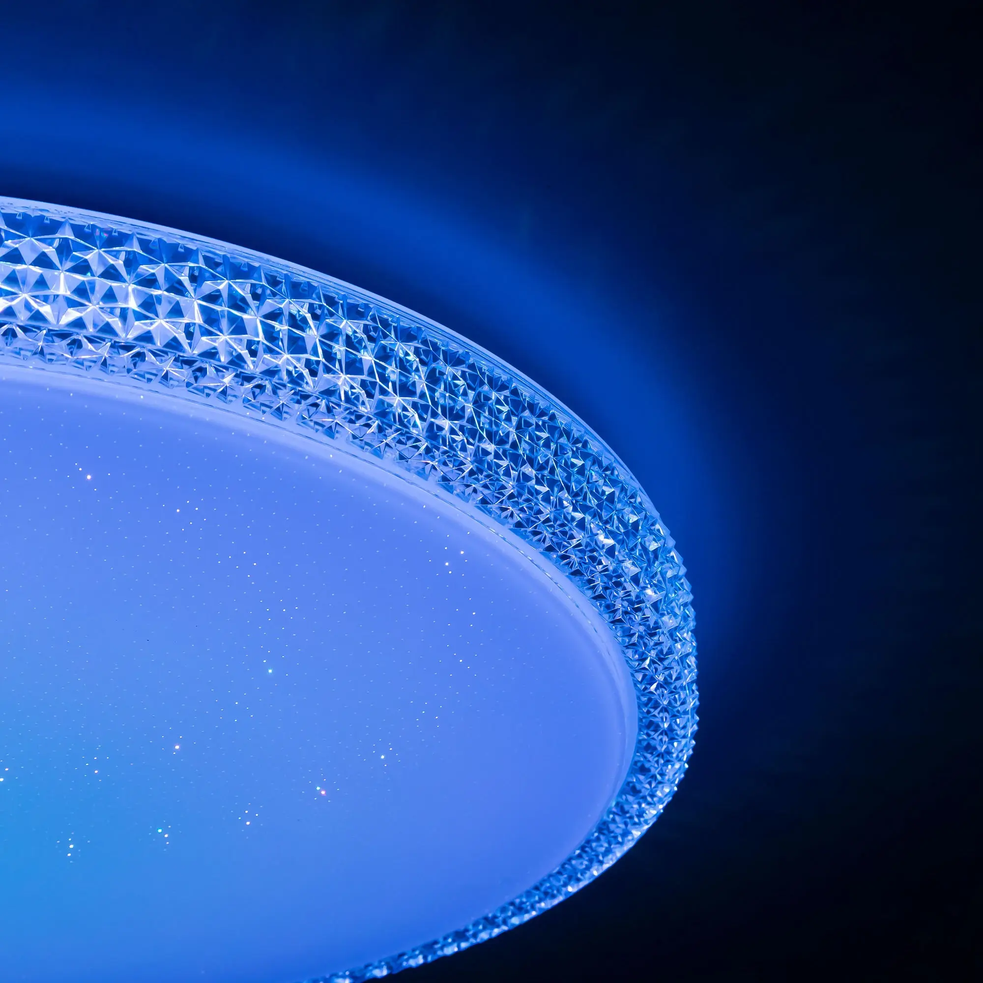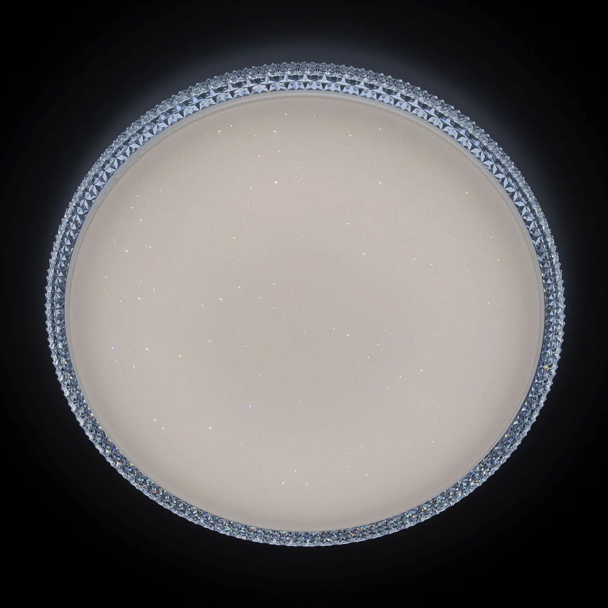 Выпускается с белым глянцевым плафоном с эффектом звездного небо и красивой рифленой окантовкой. Светильник накладной, круглой формы, крепление подходит для всех типов потолков, в том числе натяжных.