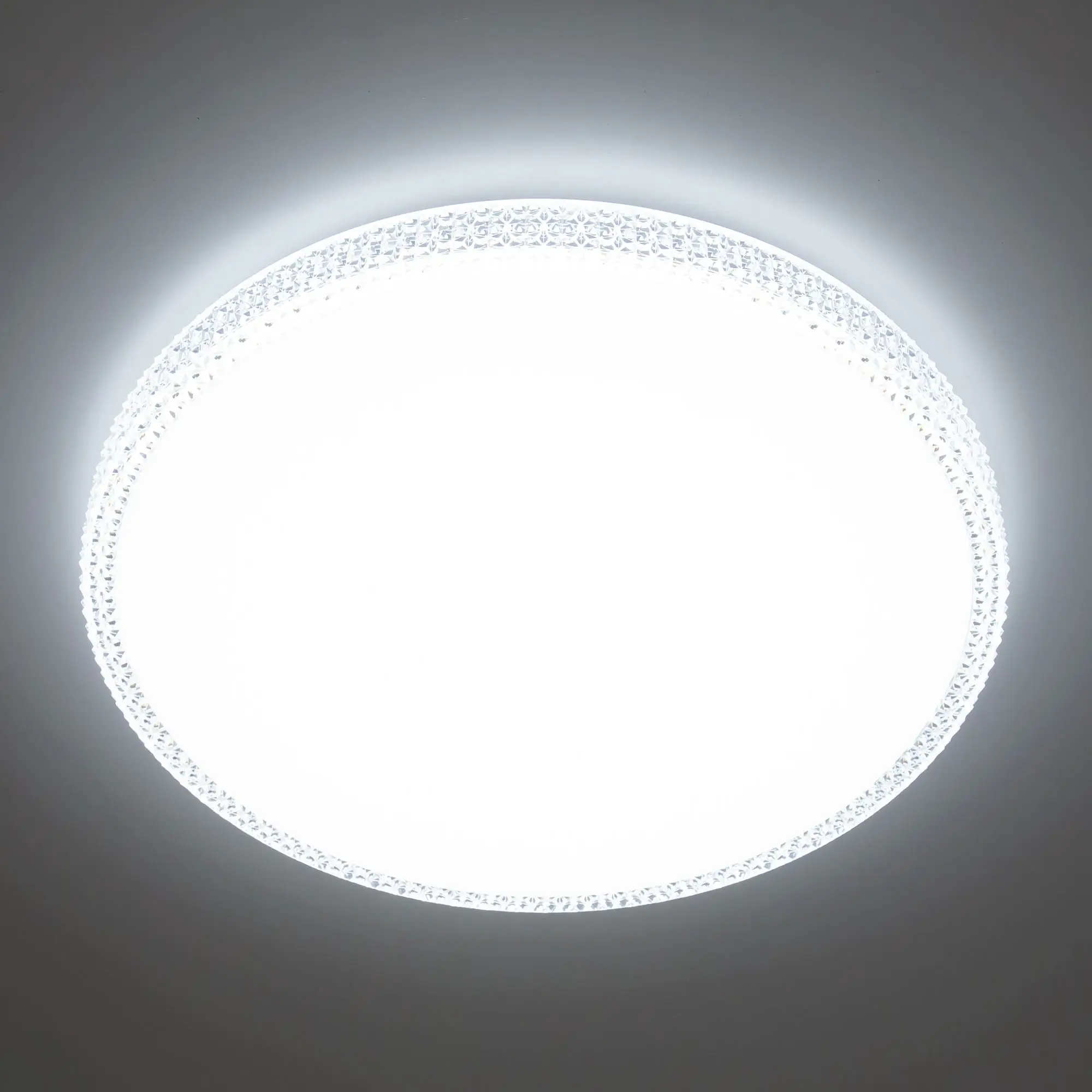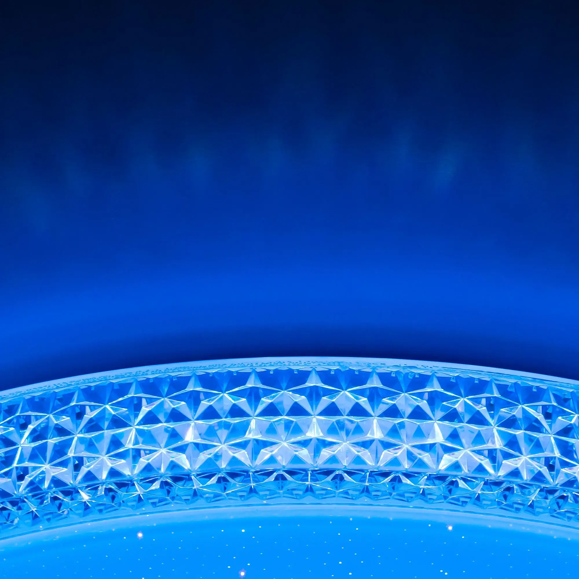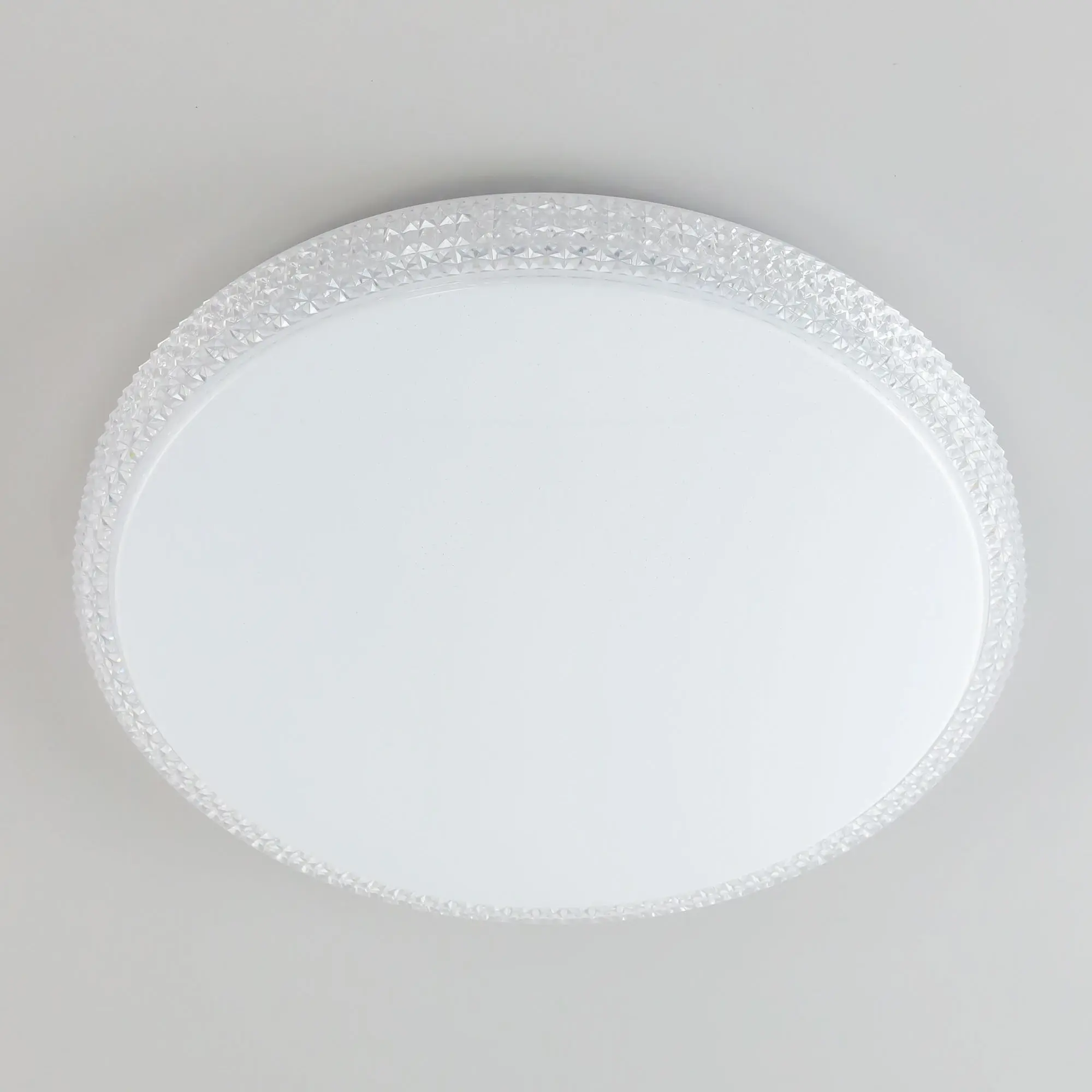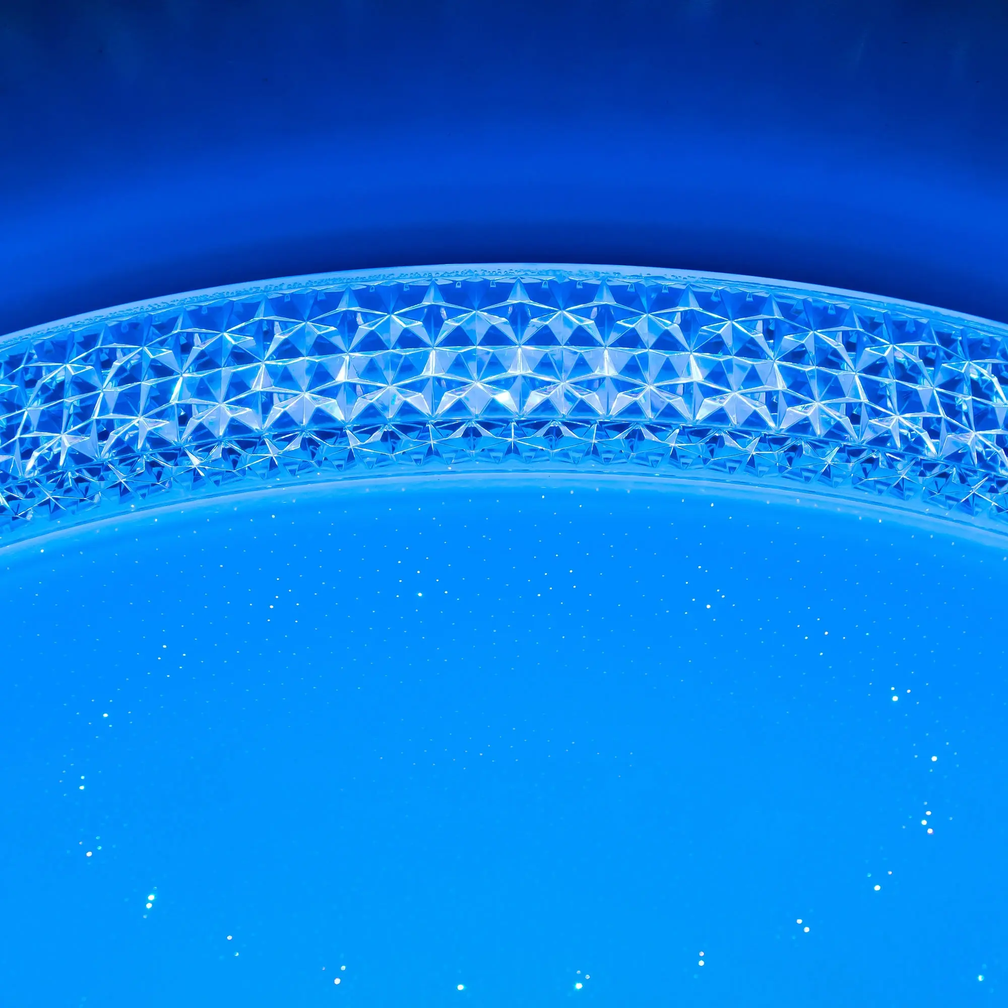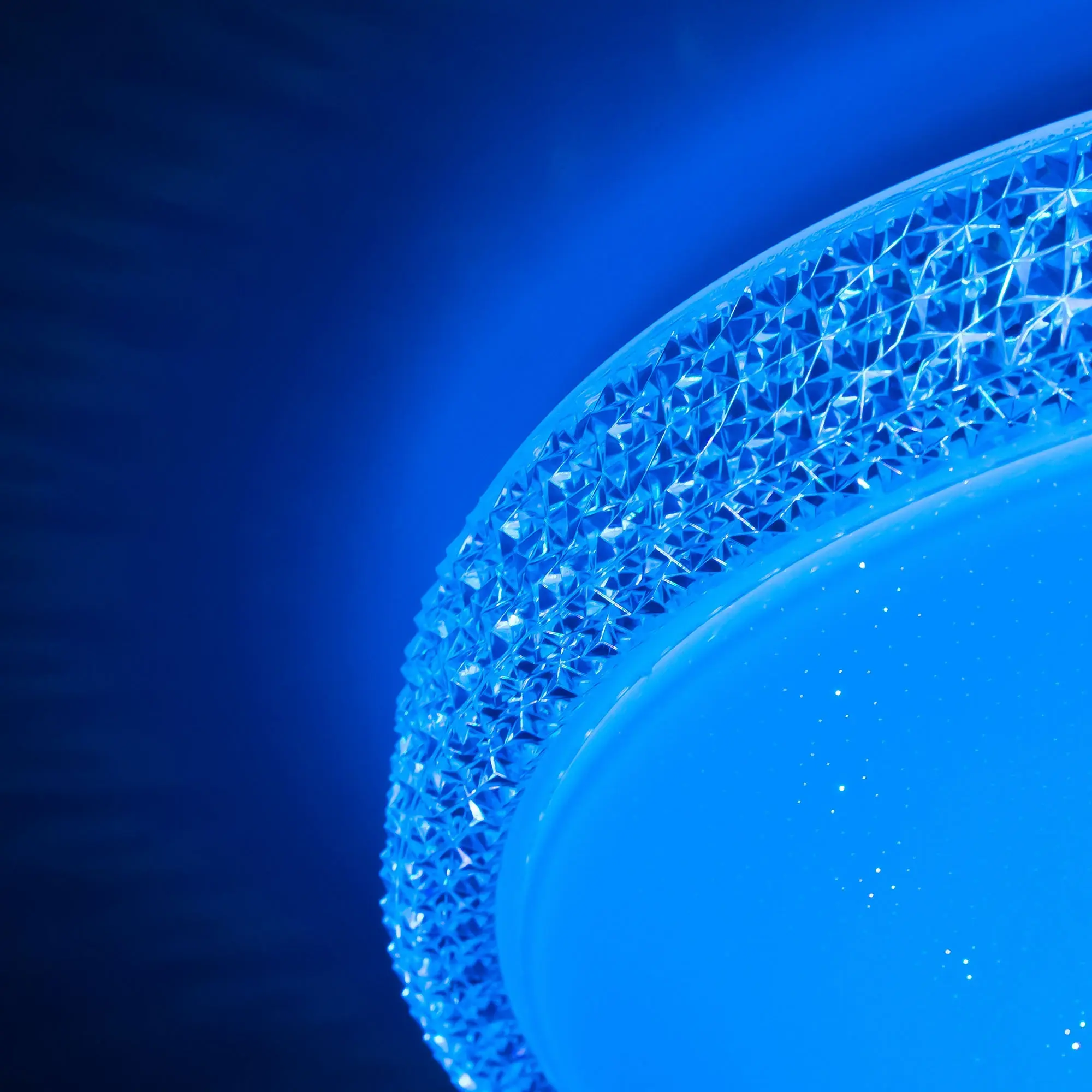 Выпускается с белым глянцевым плафоном с эффектом звездного небо и красивой рифленой окантовкой. Светильник накладной, круглой формы, крепление подходит для всех типов потолков, в том числе натяжных.