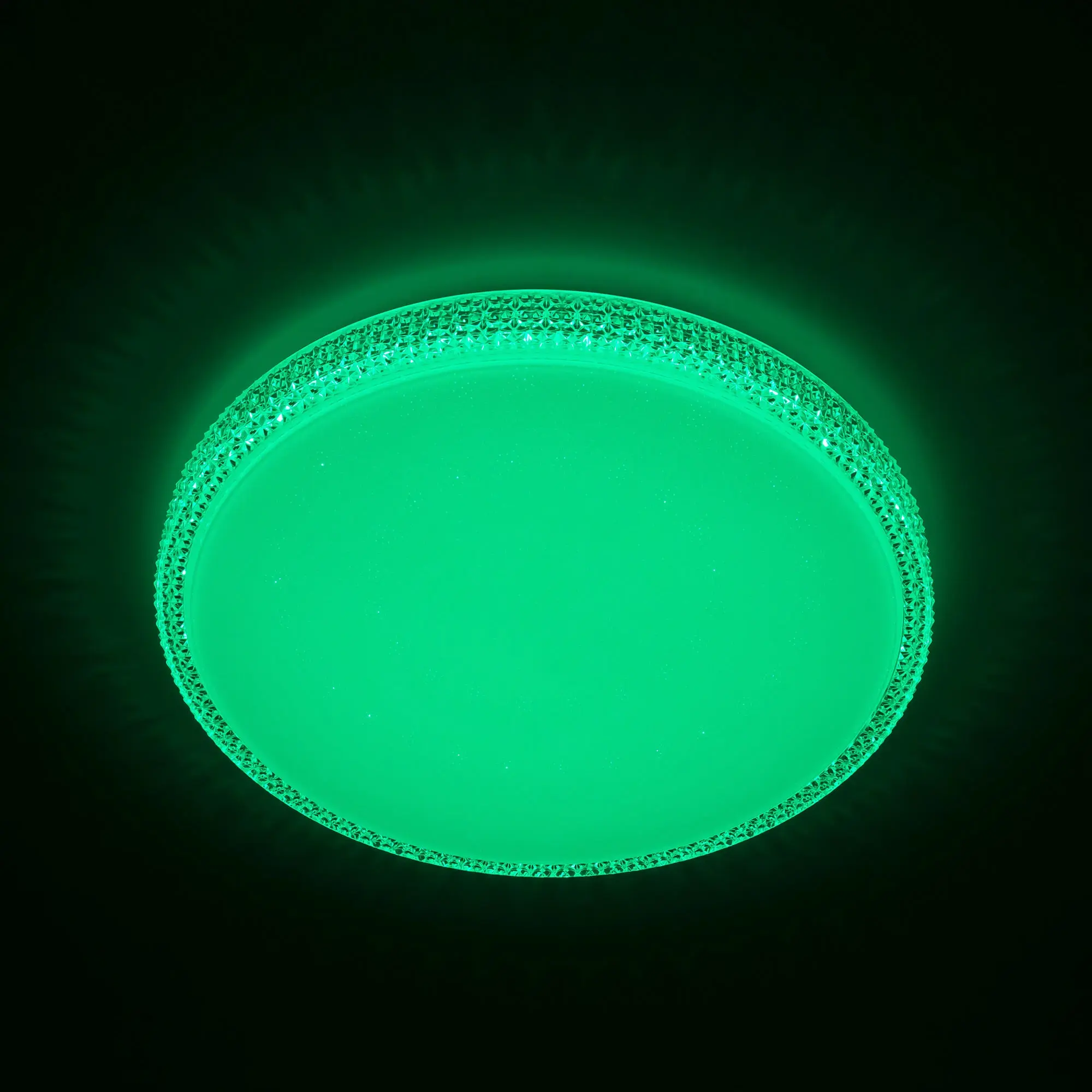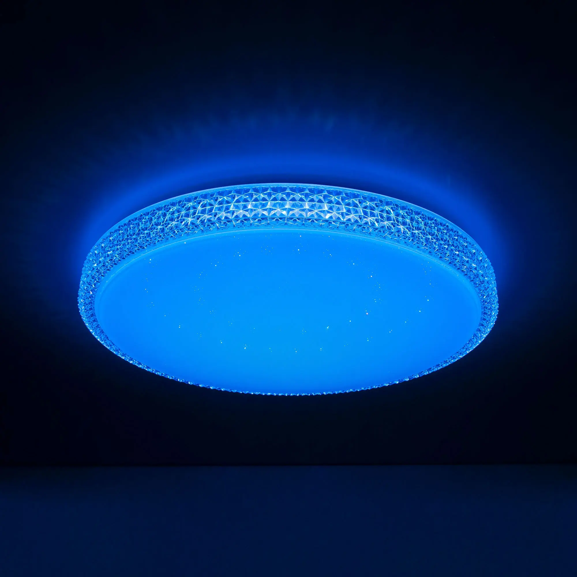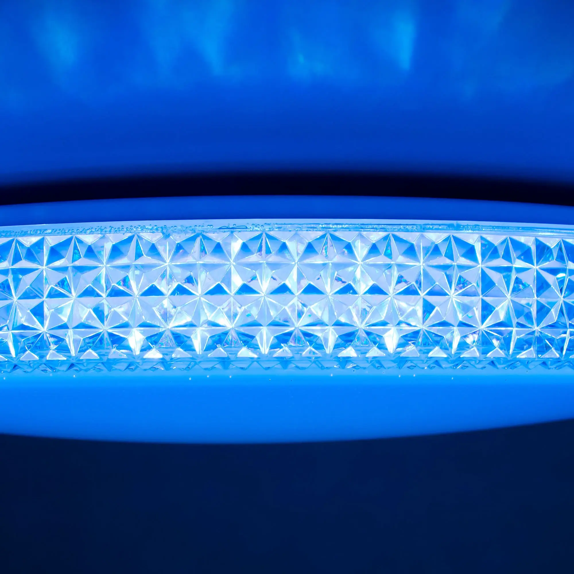 Модель оснащена мощными светодиодами холодного и теплого света, независимой цветной подсветкой RGB. Мощность светильника 115Вт, с диммером и функцией плавной регулировки.