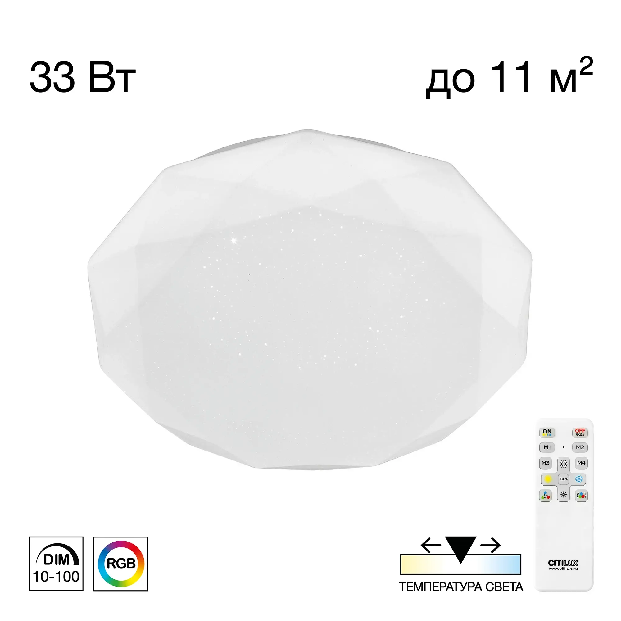 Светодиодная потолочная люстра Citilux Астрон CL733330G с яркой цветной RGB подсветкой всего плафона. Светильник плоский, основание металлическое. Плафон белый глянцевый, с эффектом звездного неба из оптического полимера. Мощность 33Вт, световой поток 2700Лм. Модель с пультом дистанционного управления. Доступна плавная регулировка яркости от 100 до 10%. Плавная регулировка цветовой температурой освещения в диапазоне от 3000К до 5500К, позволяет настроить любые оттенки теплого, нейтрального или холодного света. Цветная RGB подсветка имеет различные режимы работы. Таймер - функция отсроченного на 20сек. выключения. Четыре кнопки памяти позволяют сохранить настроенные режимы работы и включать их с пульта или обычным настенным выключателем. Пульт ДУ инфракрасный в комплекте, тип батареек ААА (батарейками не комплектуется),