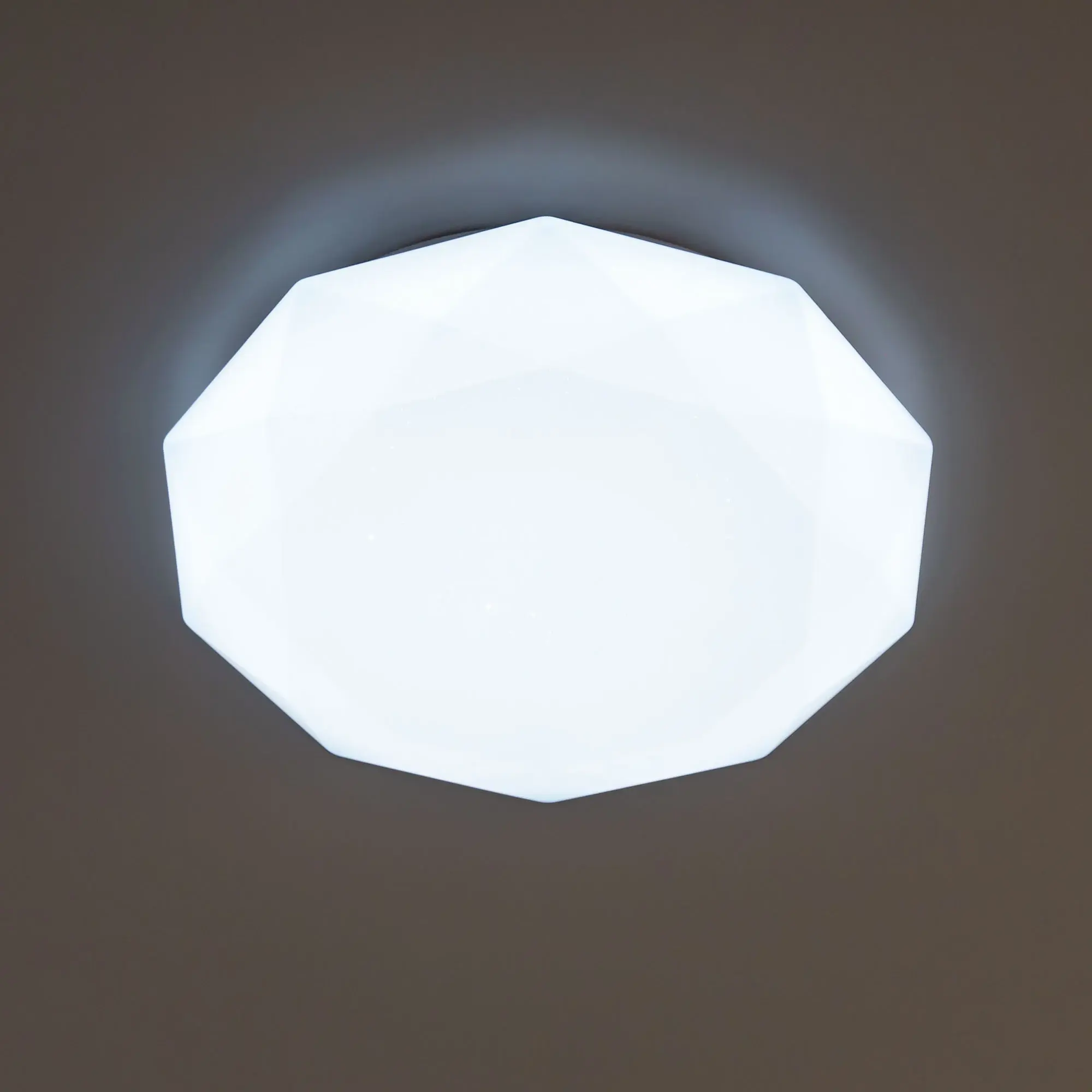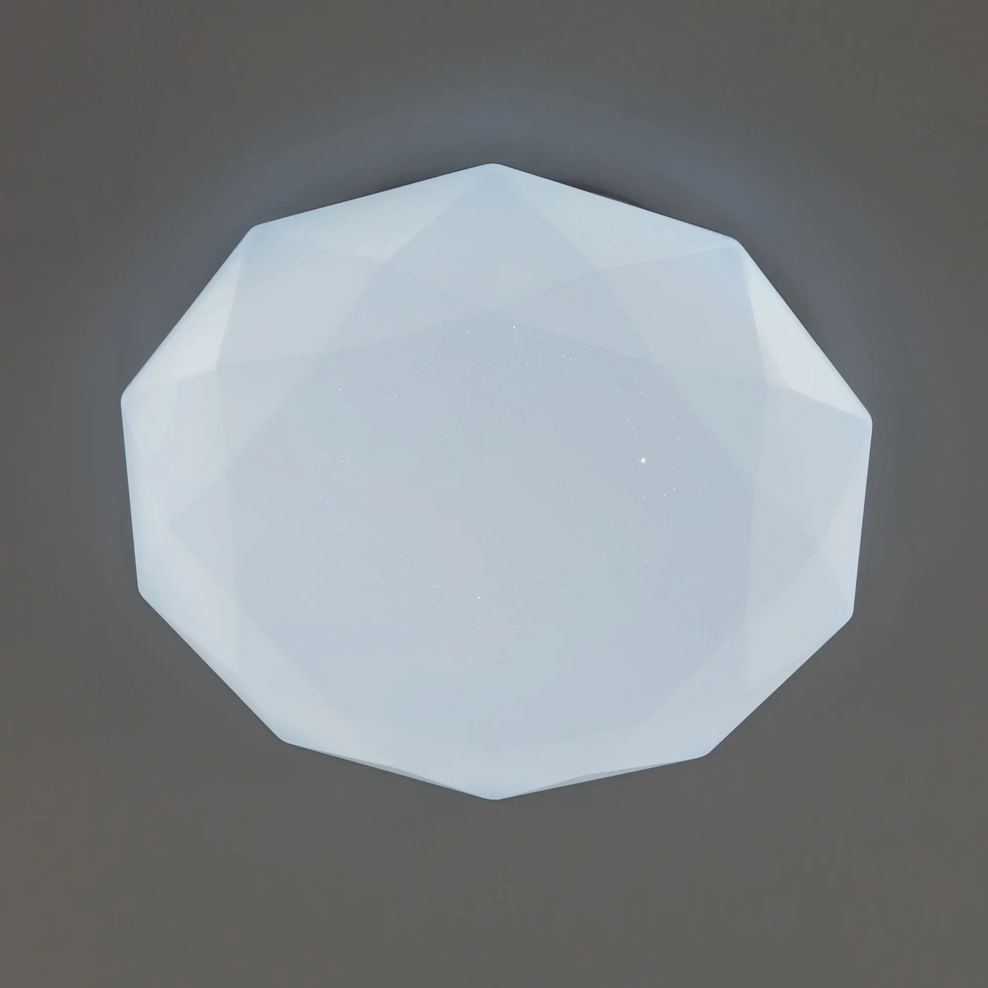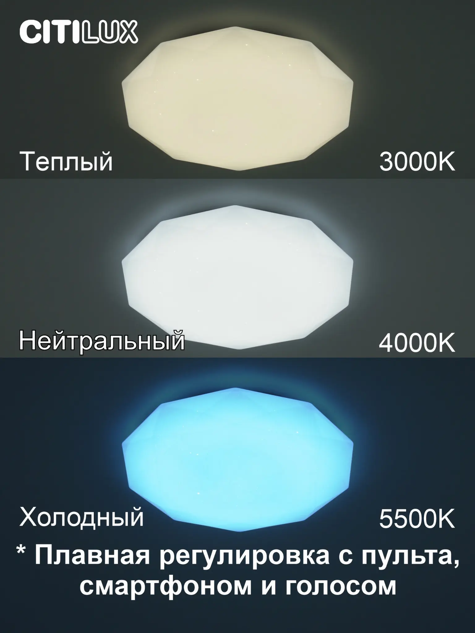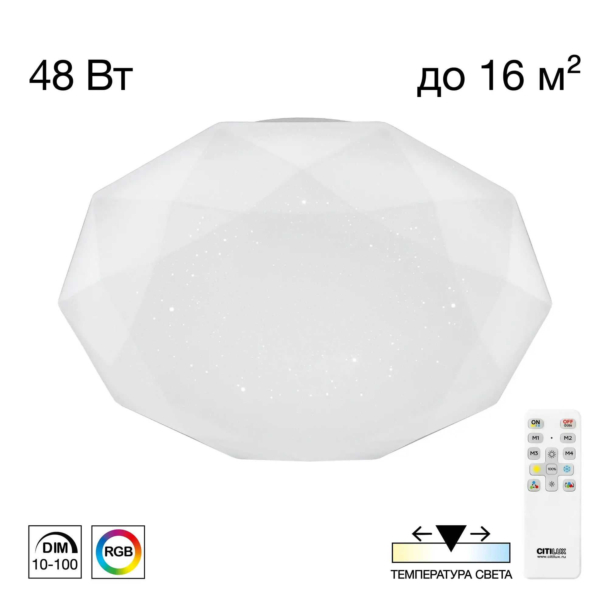 Светодиодная потолочная люстра Citilux Астрон CL733480G с яркой цветной RGB подсветкой всего плафона. Светильник плоский, основание металлическое. Плафон белый глянцевый, с эффектом звездного неба из оптического полимера. Мощность 48Вт, световой поток 4100Лм. Модель с пультом дистанционного управления. Доступна плавная регулировка яркости от 100 до 10%. Плавная регулировка цветовой температурой освещения в диапазоне от 3000К до 5500К, позволяет настроить любые оттенки теплого, нейтрального или холодного света. Цветная RGB подсветка имеет различные режимы работы. Таймер - функция отсроченного на 20сек. выключения. Четыре кнопки памяти позволяют сохранить настроенные режимы работы и включать их с пульта или обычным настенным выключателем. Пульт ДУ инфракрасный в комплекте, тип батареек ААА (батарейками не комплектуется),