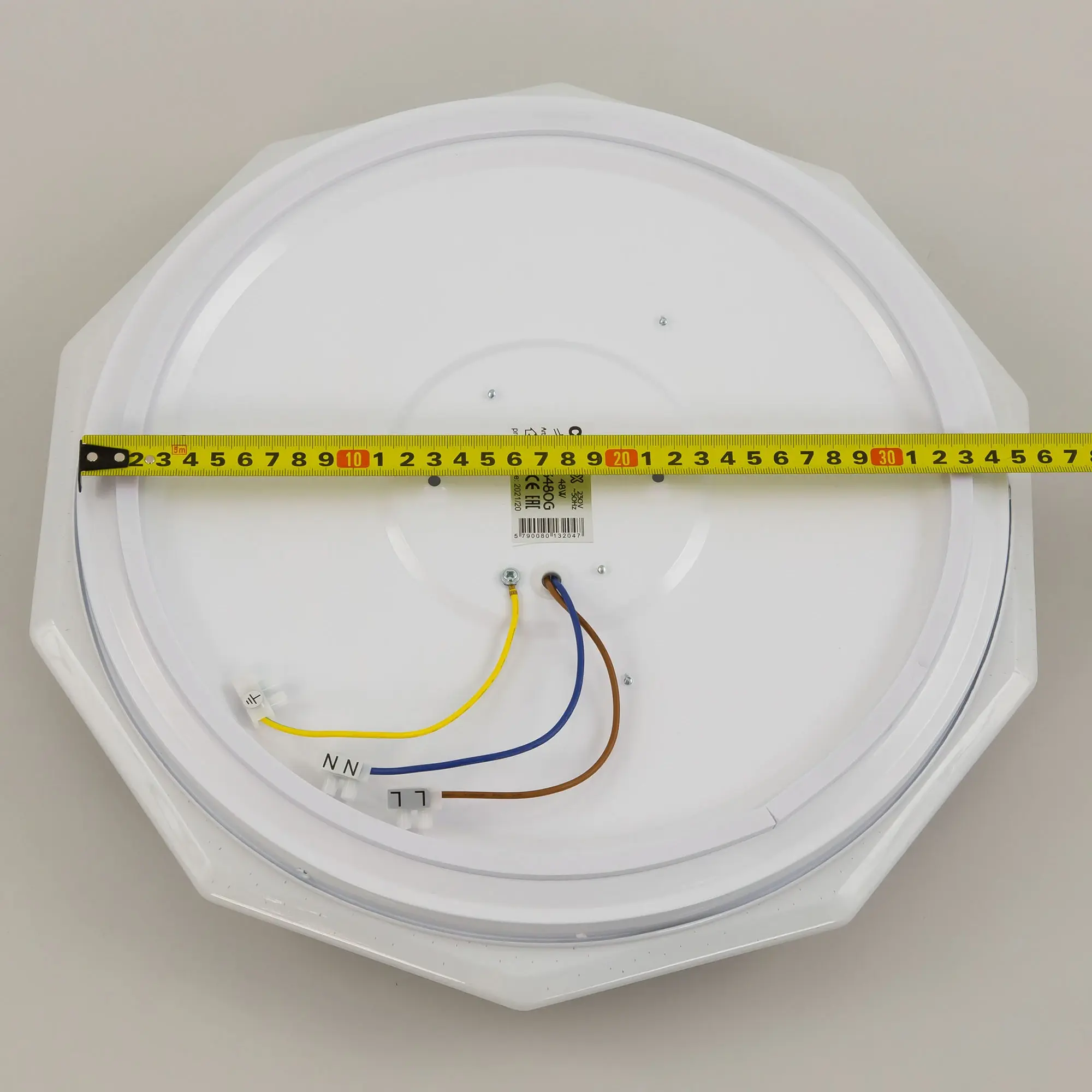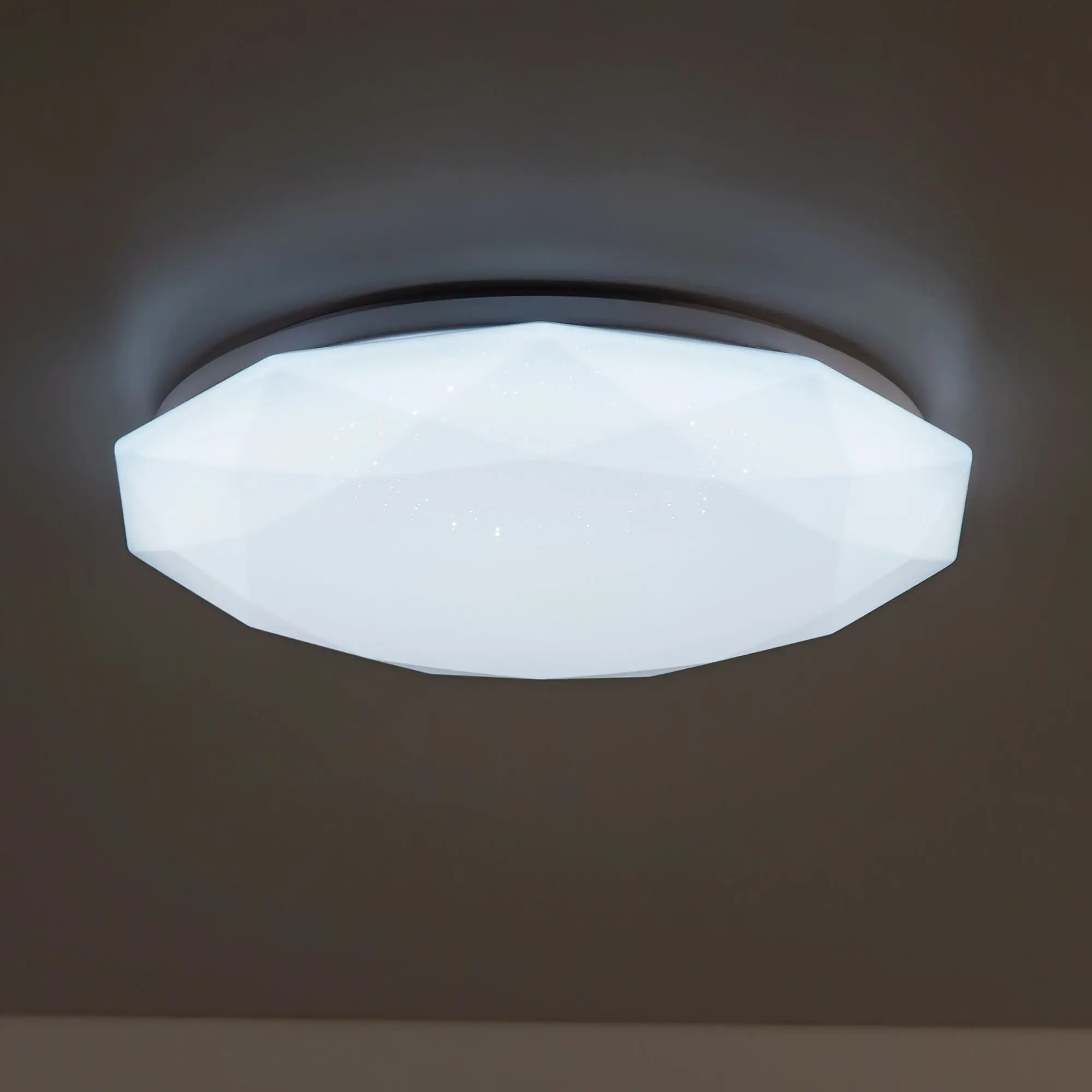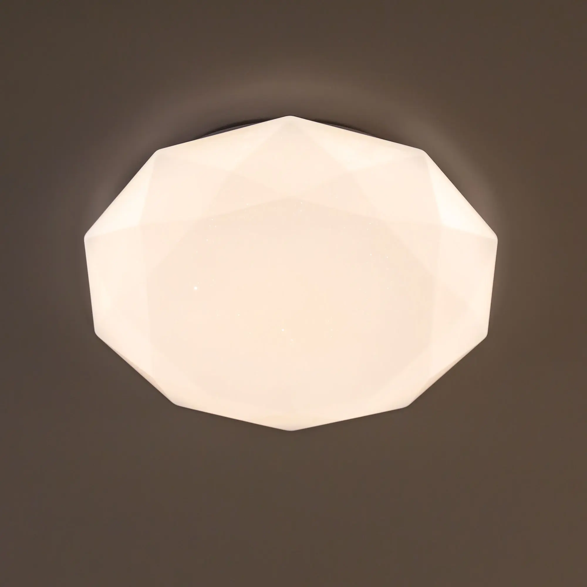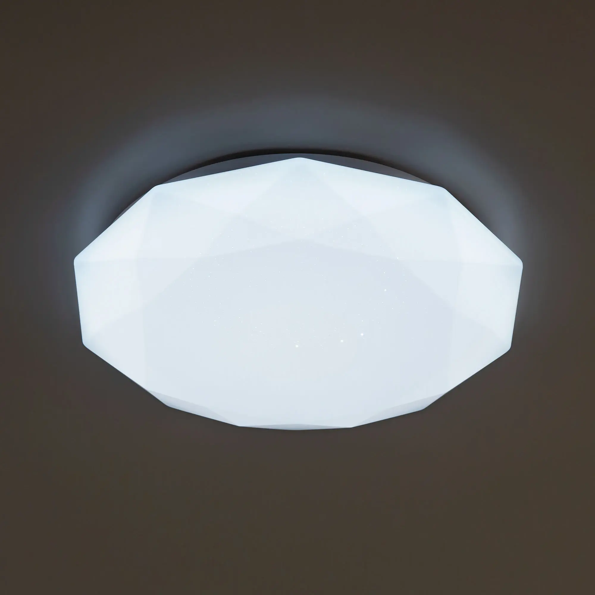 Светодиодная потолочная люстра Citilux Астрон CL733480G с яркой цветной RGB подсветкой всего плафона. Светильник плоский, основание металлическое. Плафон белый глянцевый, с эффектом звездного неба из оптического полимера. Мощность 48Вт, световой поток 4100Лм. Модель с пультом дистанционного управления. Доступна плавная регулировка яркости от 100 до 10%. Плавная регулировка цветовой температурой освещения в диапазоне от 3000К до 5500К, позволяет настроить любые оттенки теплого, нейтрального или холодного света. Цветная RGB подсветка имеет различные режимы работы. Таймер - функция отсроченного на 20сек. выключения. Четыре кнопки памяти позволяют сохранить настроенные режимы работы и включать их с пульта или обычным настенным выключателем. Пульт ДУ инфракрасный в комплекте, тип батареек ААА (батарейками не комплектуется),