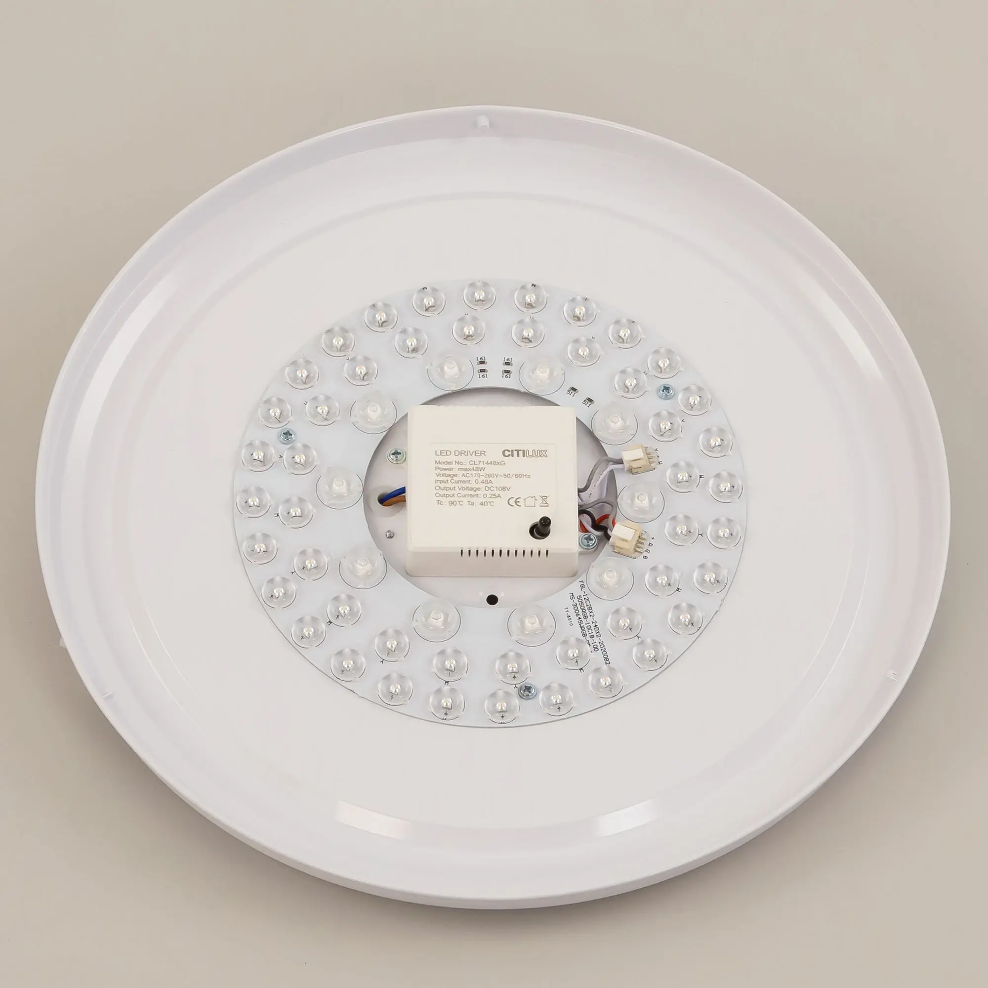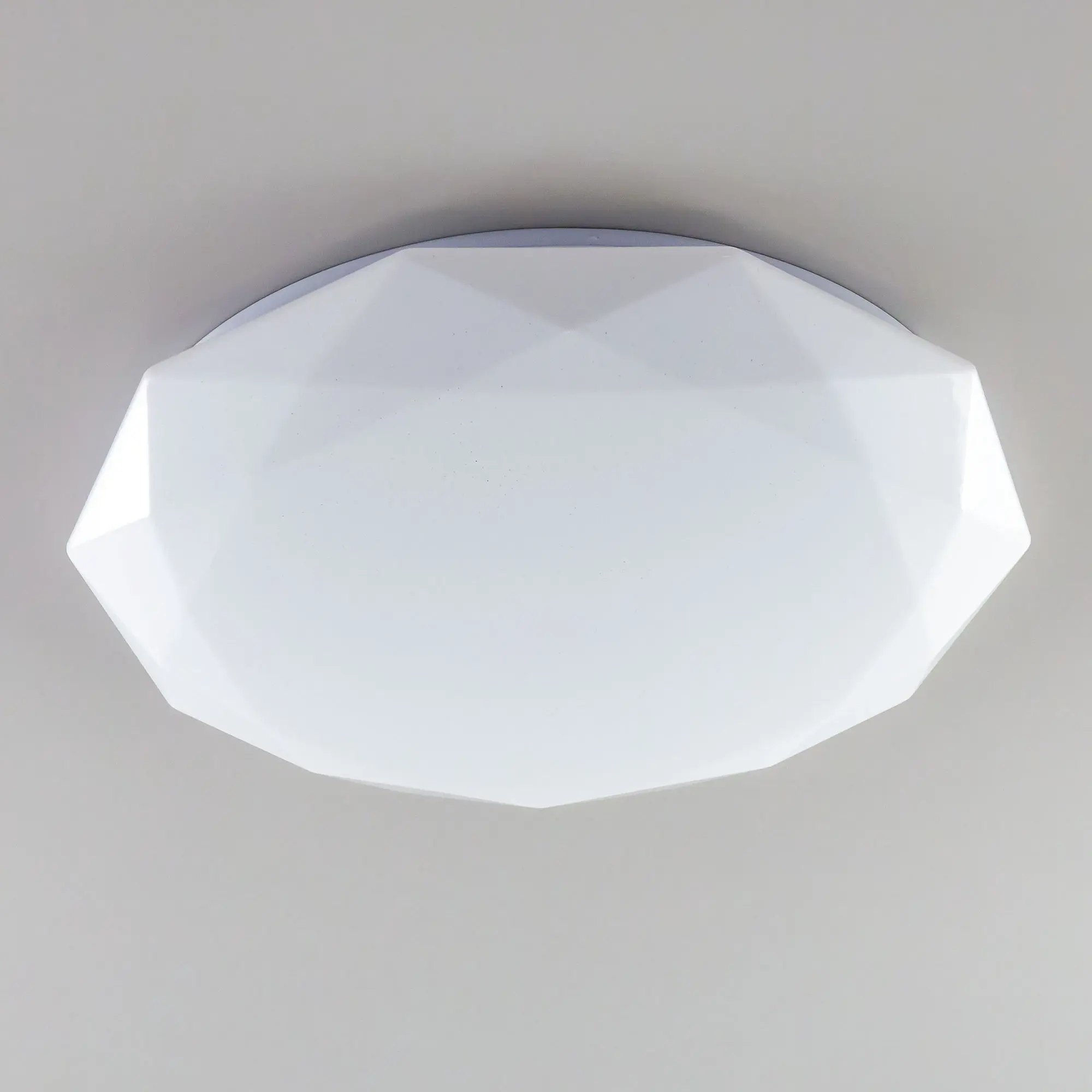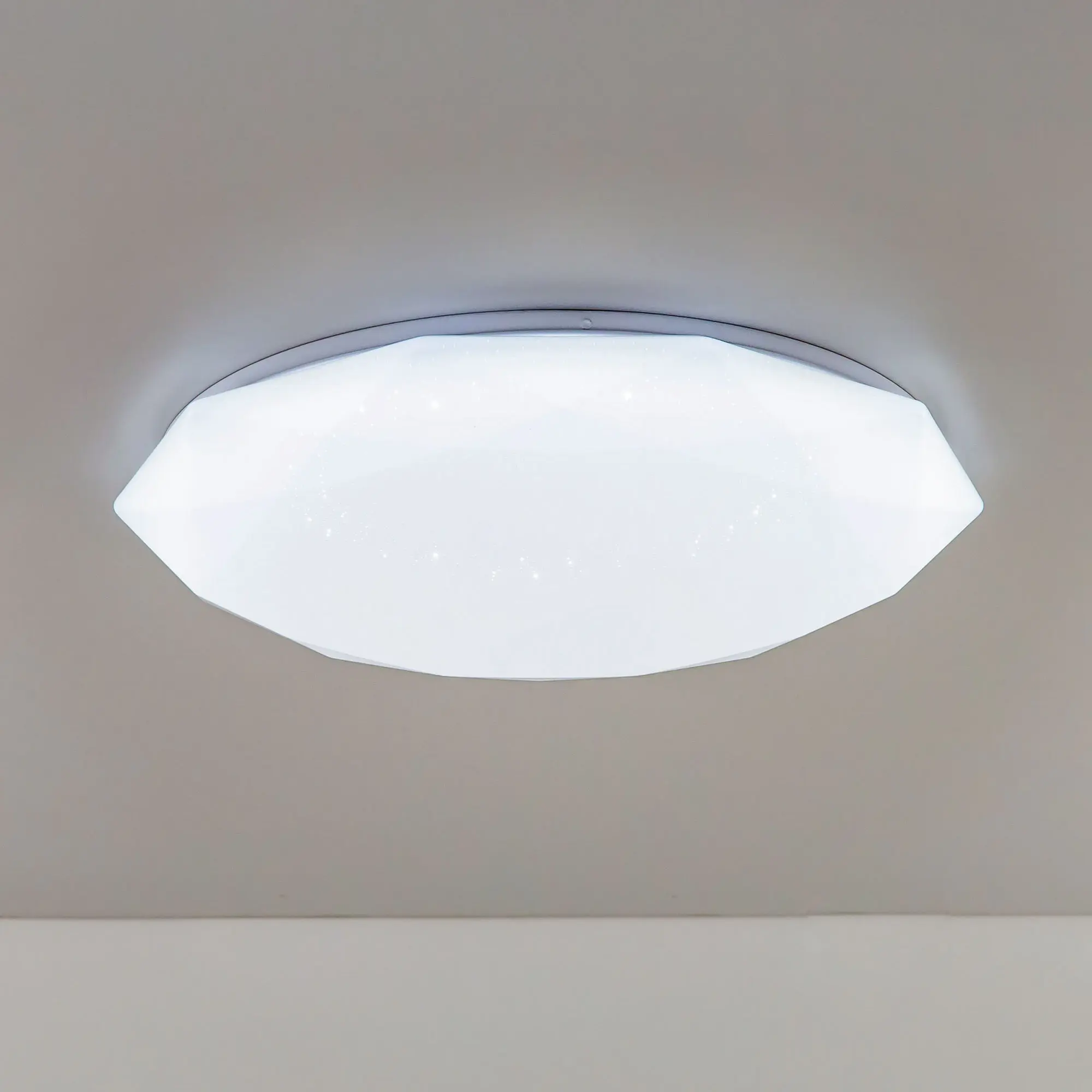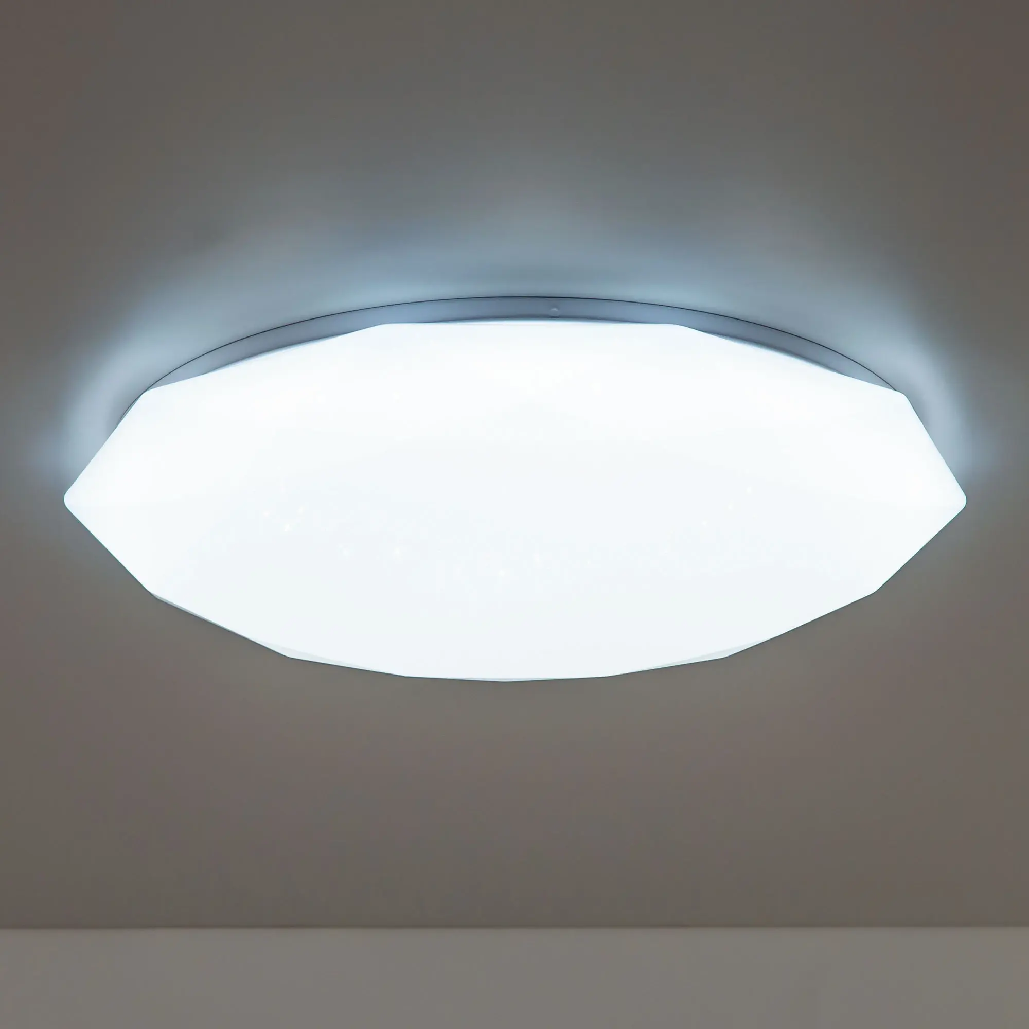 Светодиодная потолочная люстра Citilux Астрон CL733480G с яркой цветной RGB подсветкой всего плафона. Светильник плоский, основание металлическое. Плафон белый глянцевый, с эффектом звездного неба из оптического полимера. Мощность 48Вт, световой поток 4100Лм. Модель с пультом дистанционного управления. Доступна плавная регулировка яркости от 100 до 10%. Плавная регулировка цветовой температурой освещения в диапазоне от 3000К до 5500К, позволяет настроить любые оттенки теплого, нейтрального или холодного света. Цветная RGB подсветка имеет различные режимы работы. Таймер - функция отсроченного на 20сек. выключения. Четыре кнопки памяти позволяют сохранить настроенные режимы работы и включать их с пульта или обычным настенным выключателем. Пульт ДУ инфракрасный в комплекте, тип батареек ААА (батарейками не комплектуется),