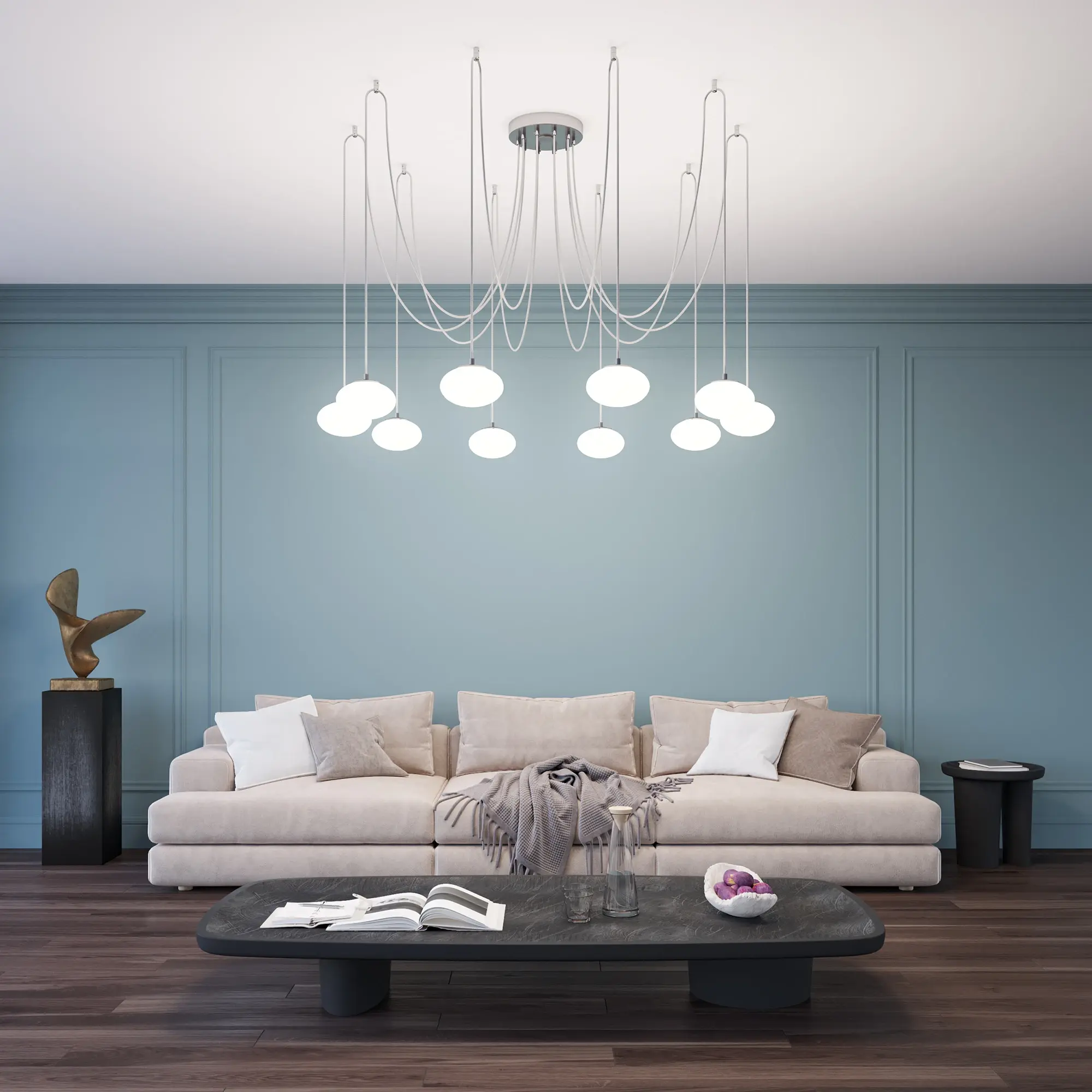 Оригинальная люстра с круглым матовым хромированным основанием и длинными проводами (по 1,55м). Каждый провод можно закрепить на потолке в произвольном порядке, создавая уникальный дизайн светильника. Модель легко адаптировать для высоких, стандартных и низких потолков. Плафоны в форме сфероида изготовлены из матового оптического полимера. В каждом из 10 плафонов находится уникальный светодиодный модуль, обеспечивающий яркое основное освещение или красочную RGB-подсветку с плавной регулировкой яркости во всех режимах света.