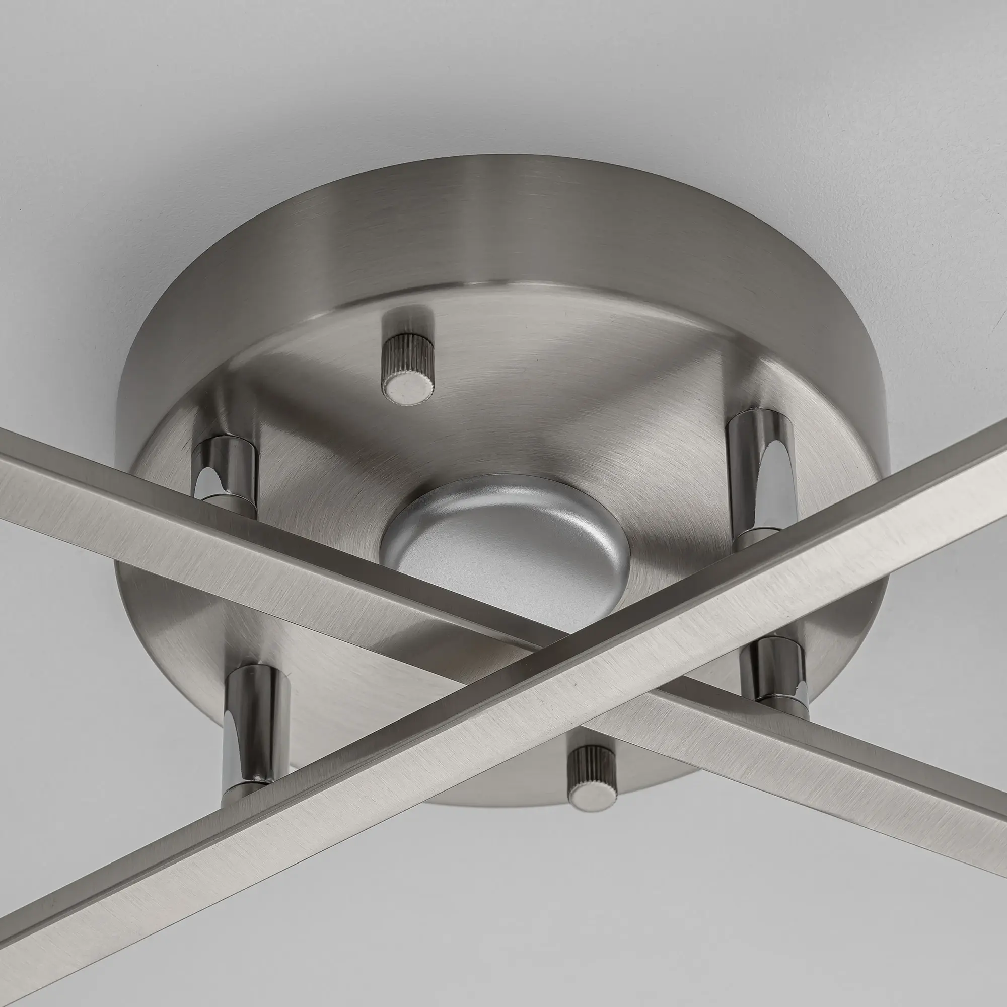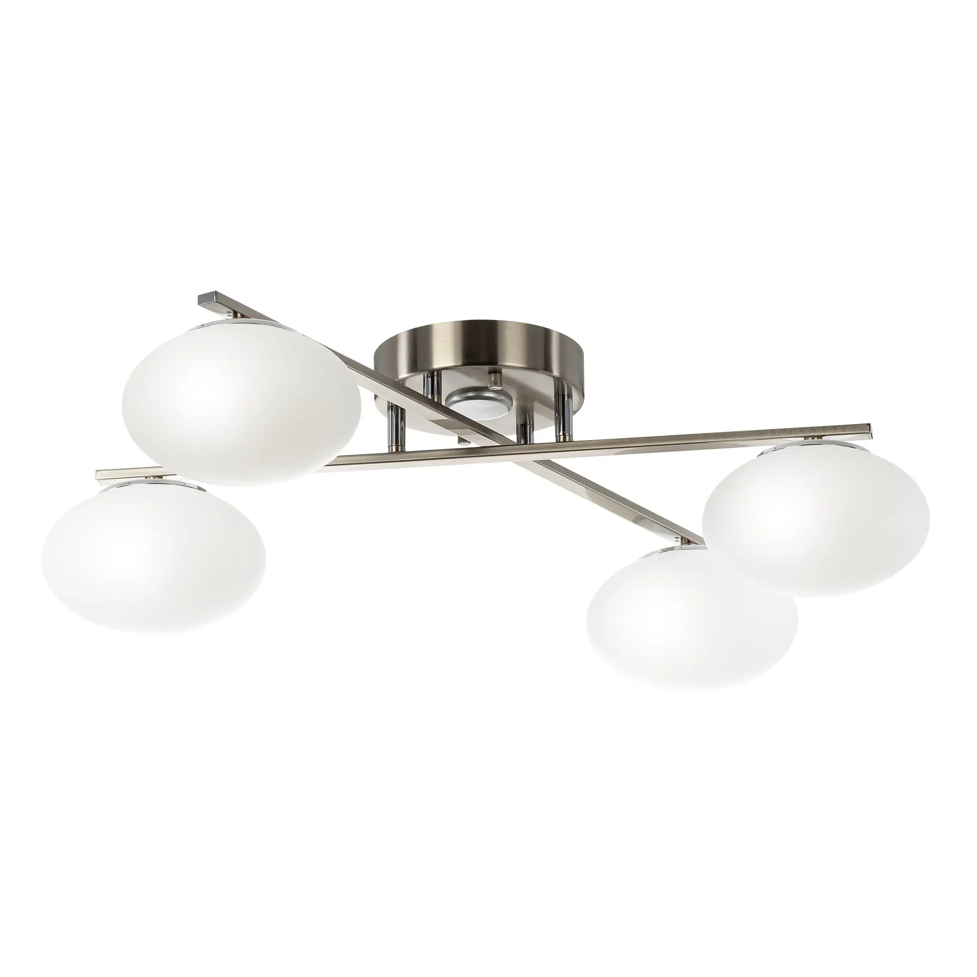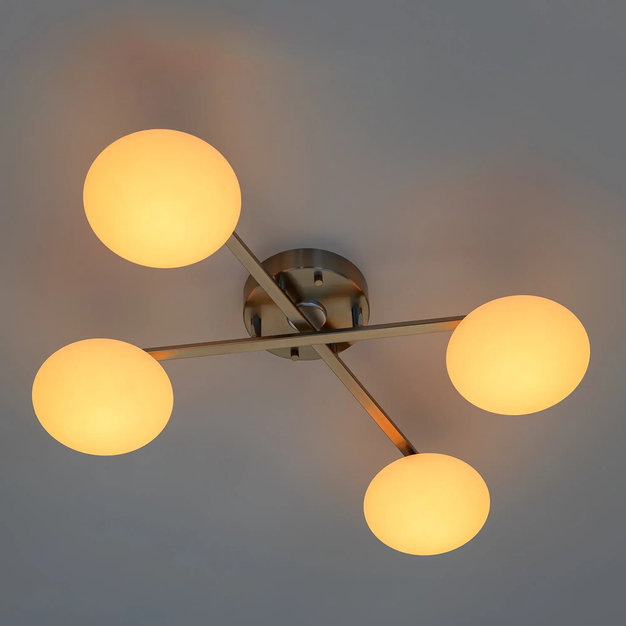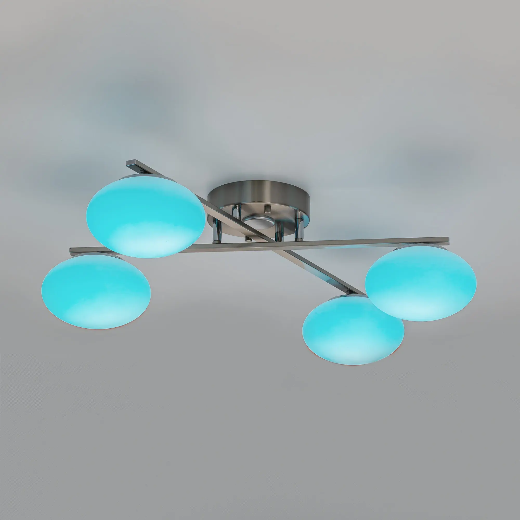 Люстра четырёхрожковая с круглым основанием, корпус металлический, цвет матовый хром. Плафоны в форме сфероида изготовлены из матового оптического полимера. В каждом плафоне находится уникальный светодиодный модуль, который обеспечивает яркое основное освещение или красочную RGB-подсветку с плавной регулировкой яркости во всех режимах света.