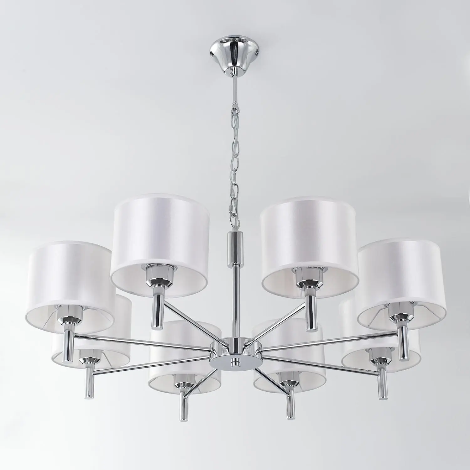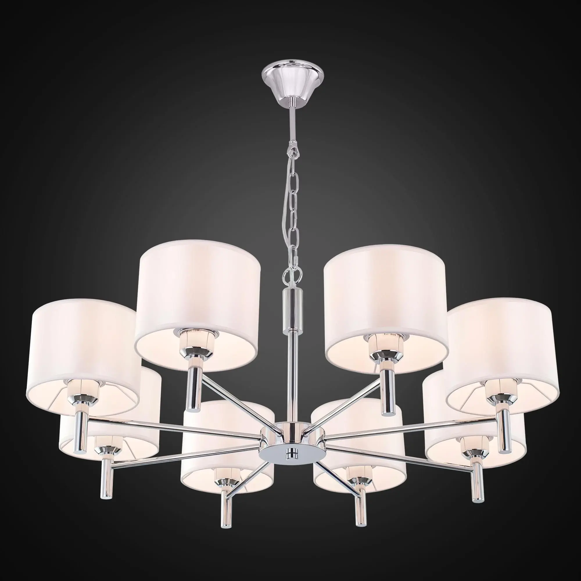 В изделии 8 ламп с цоколем Е27 максимальной мощностью для ламп накаливания 75Вт (в комплект не входят, приобретаются отдельно). Диаметр светильника 80см, высота легко регулируется в диапазоне от 45см до 1,15м. Модель подходит для всех типов потолков, в том числе натяжных, тип крепления – крючок.