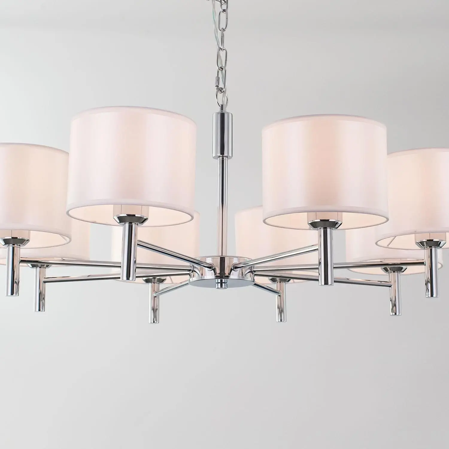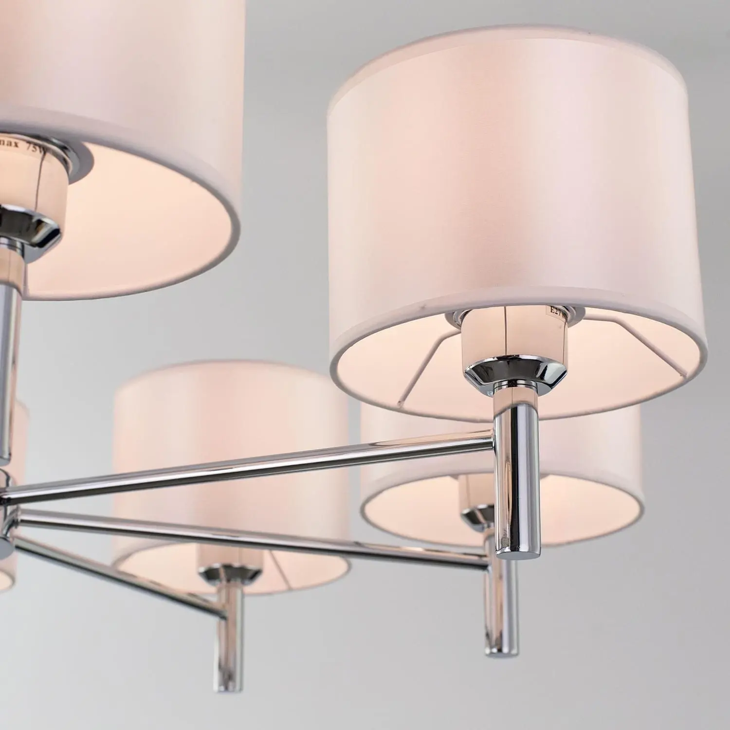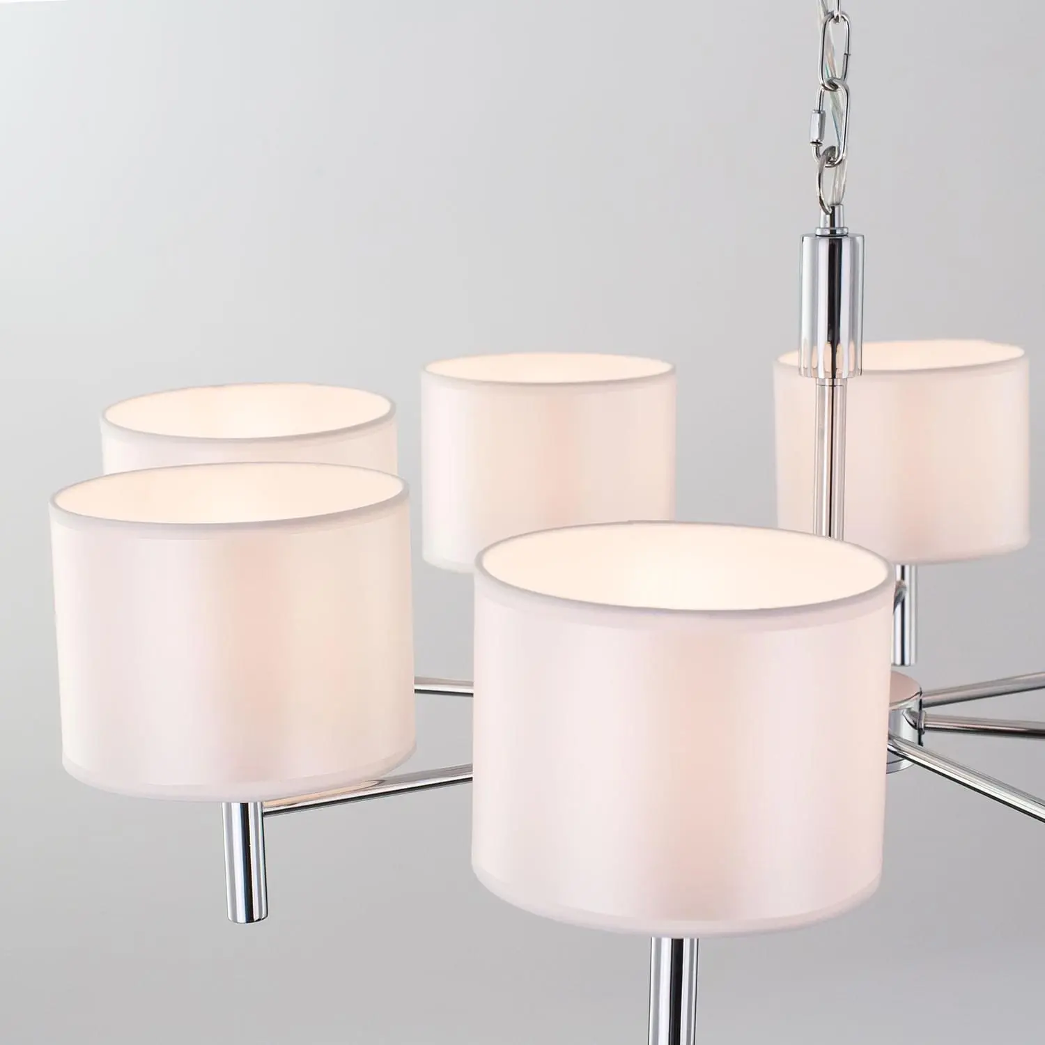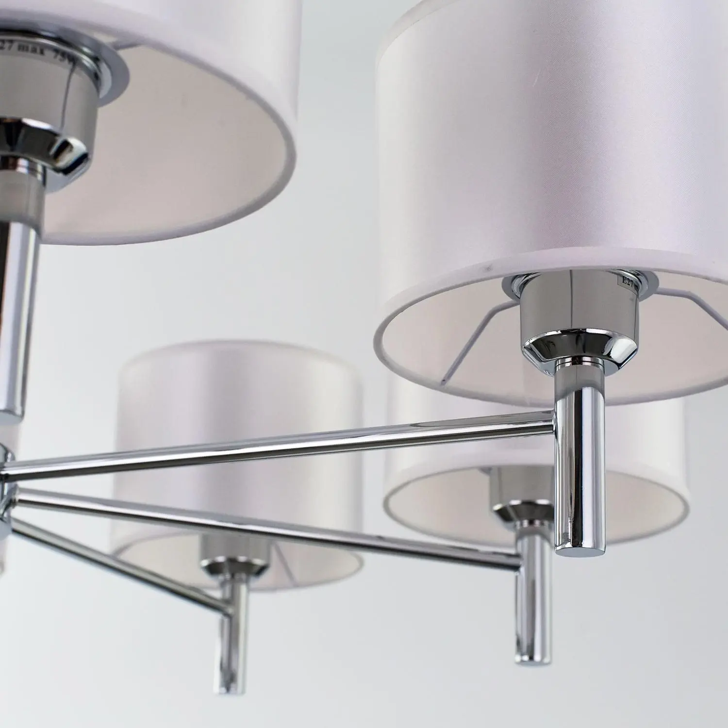 Подвесная люстра Citilux Аврора CL463180 выполнена в современном стиле. Корпус светильника металлический с элегантными рожками, цвет глянцевый хром. Абажуры цилиндрической формы из ткани жемчужно-белого цвета на подложке из оптического полимера.