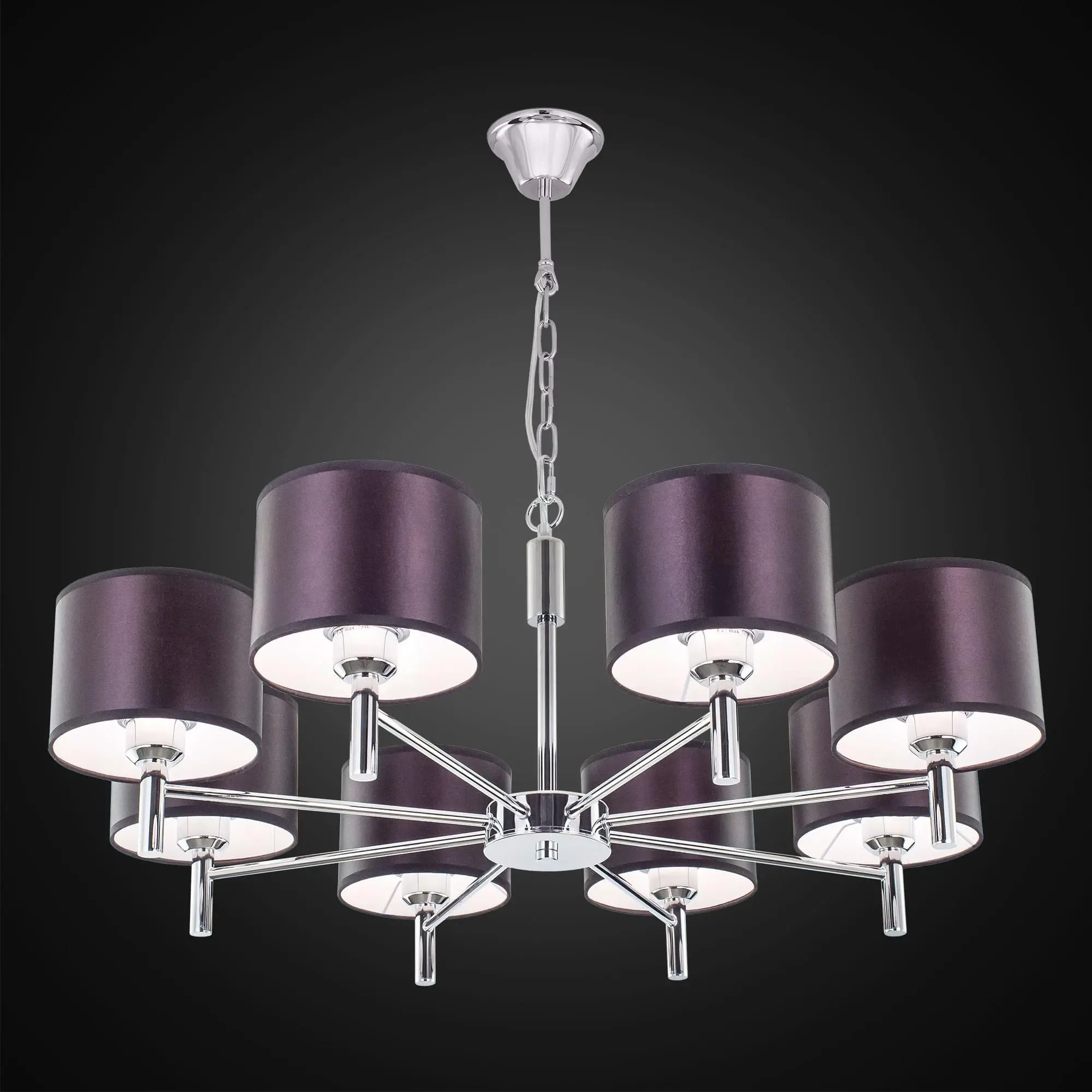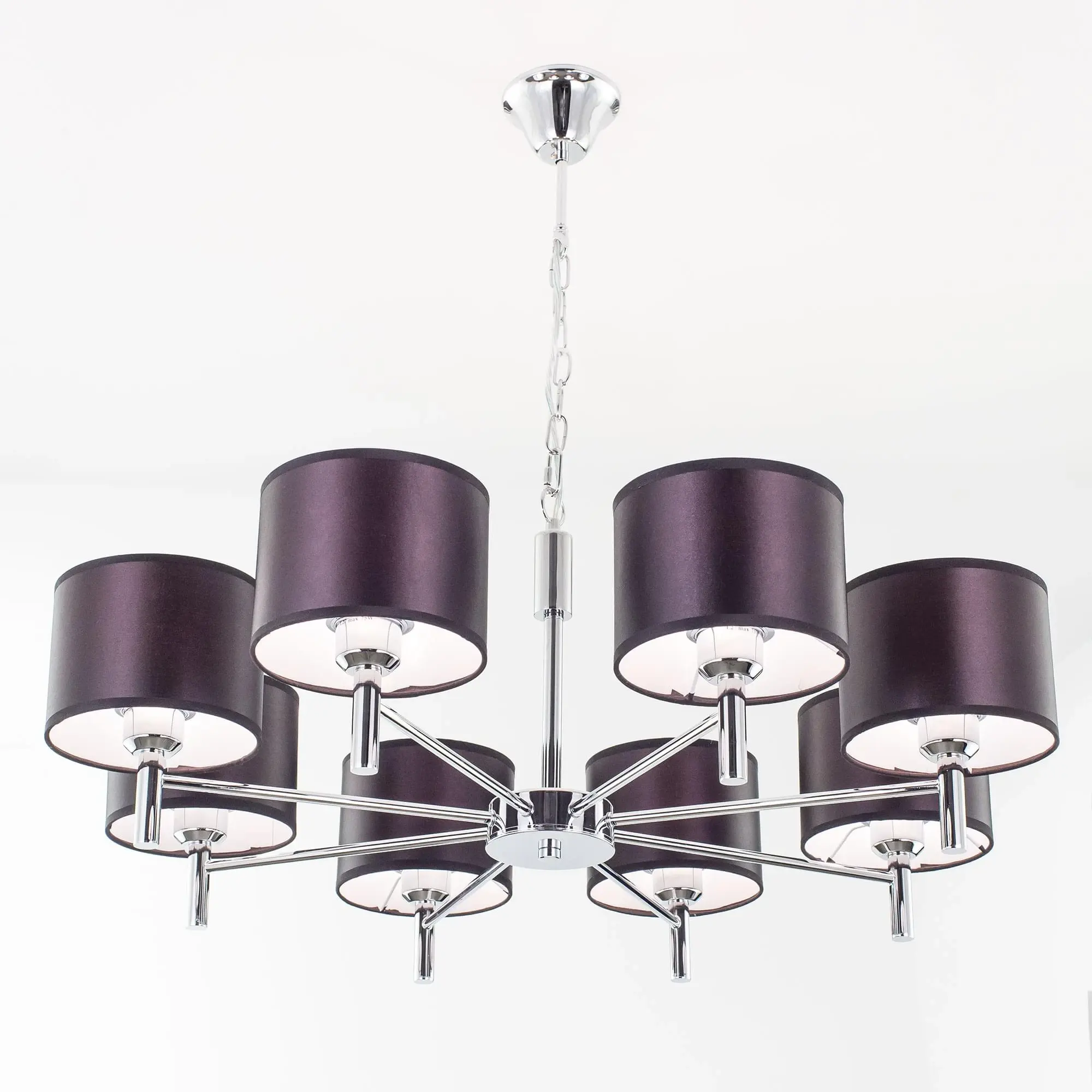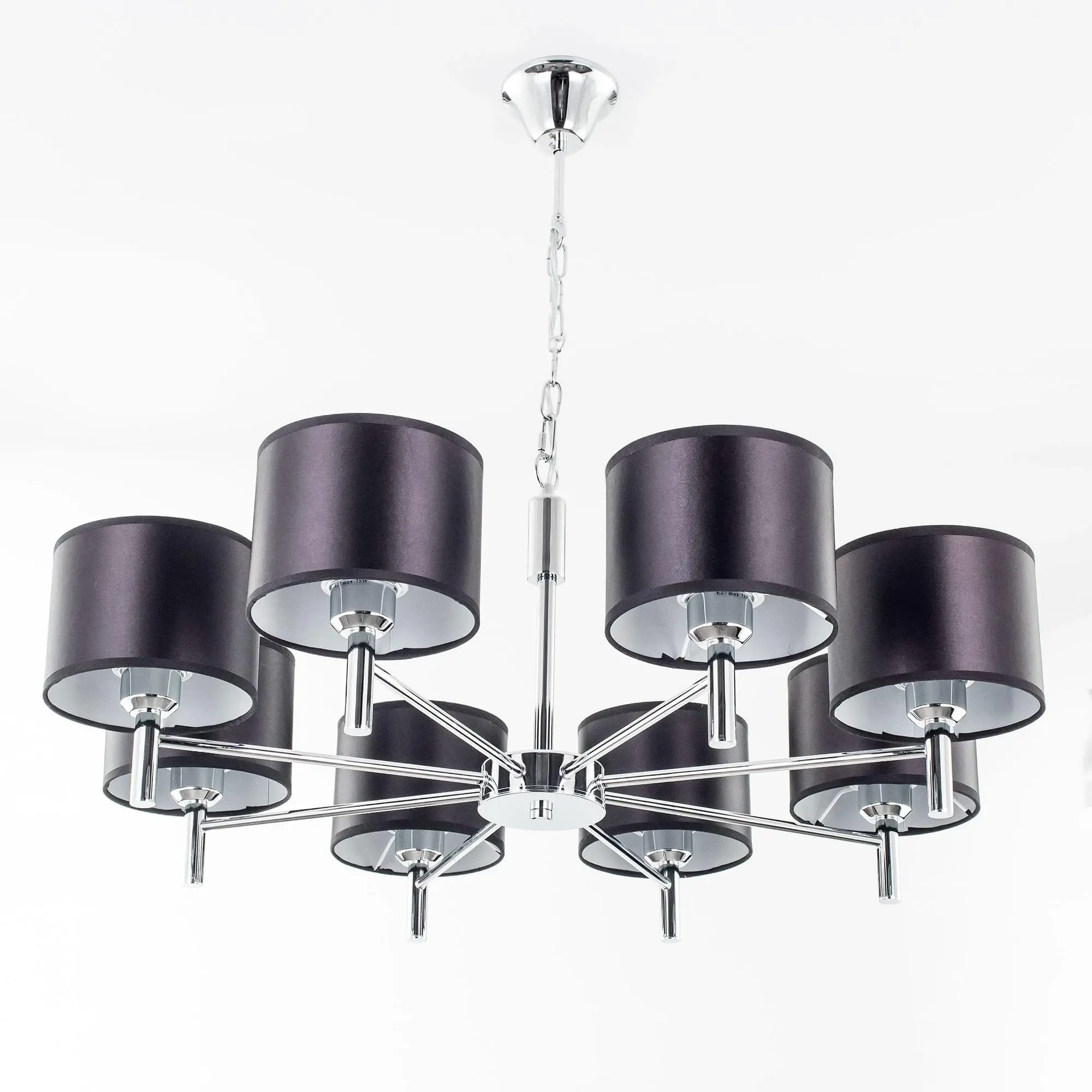 В изделии 8 ламп с цоколем Е27 максимальной мощностью для ламп накаливания 75Вт (в комплект не входят, приобретаются отдельно). Диаметр светильника 80см, высота легко регулируется в диапазоне от 45см до 1,15м. Модель подходит для всех типов потолков, в том числе натяжных, тип крепления – крючок.