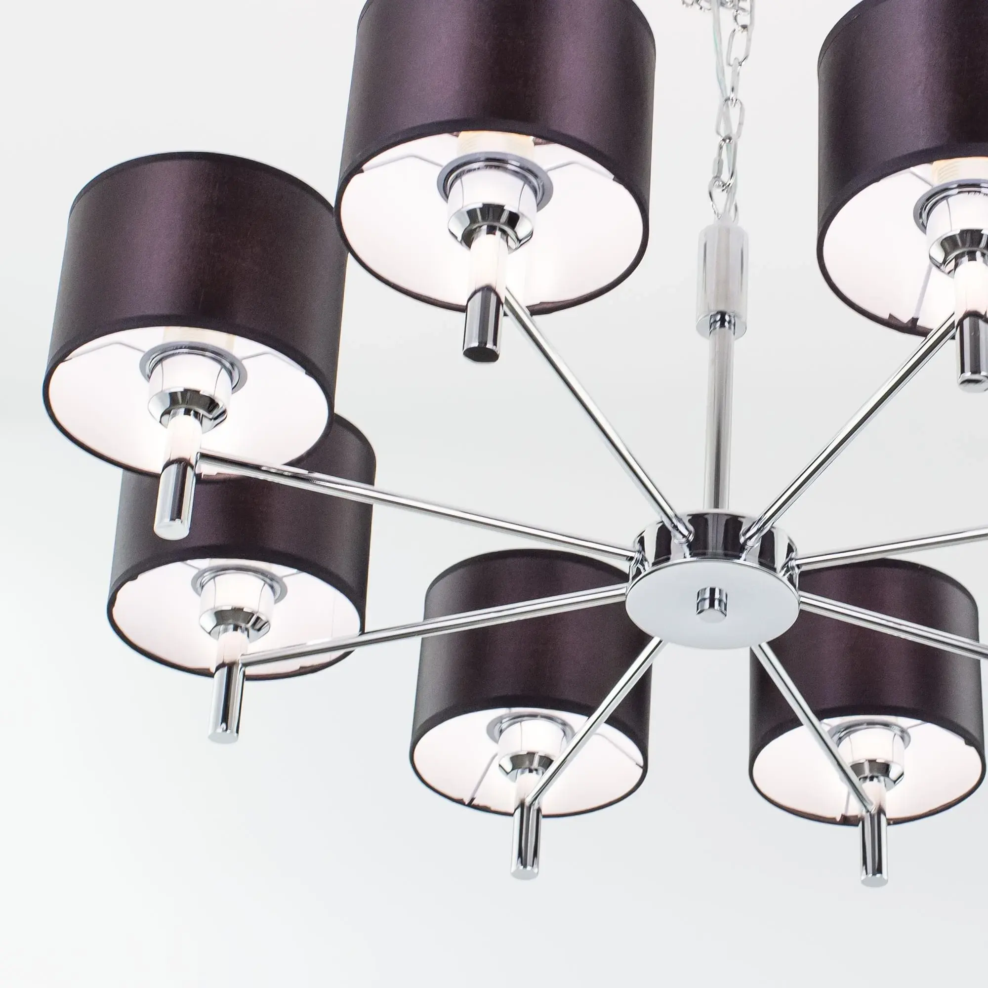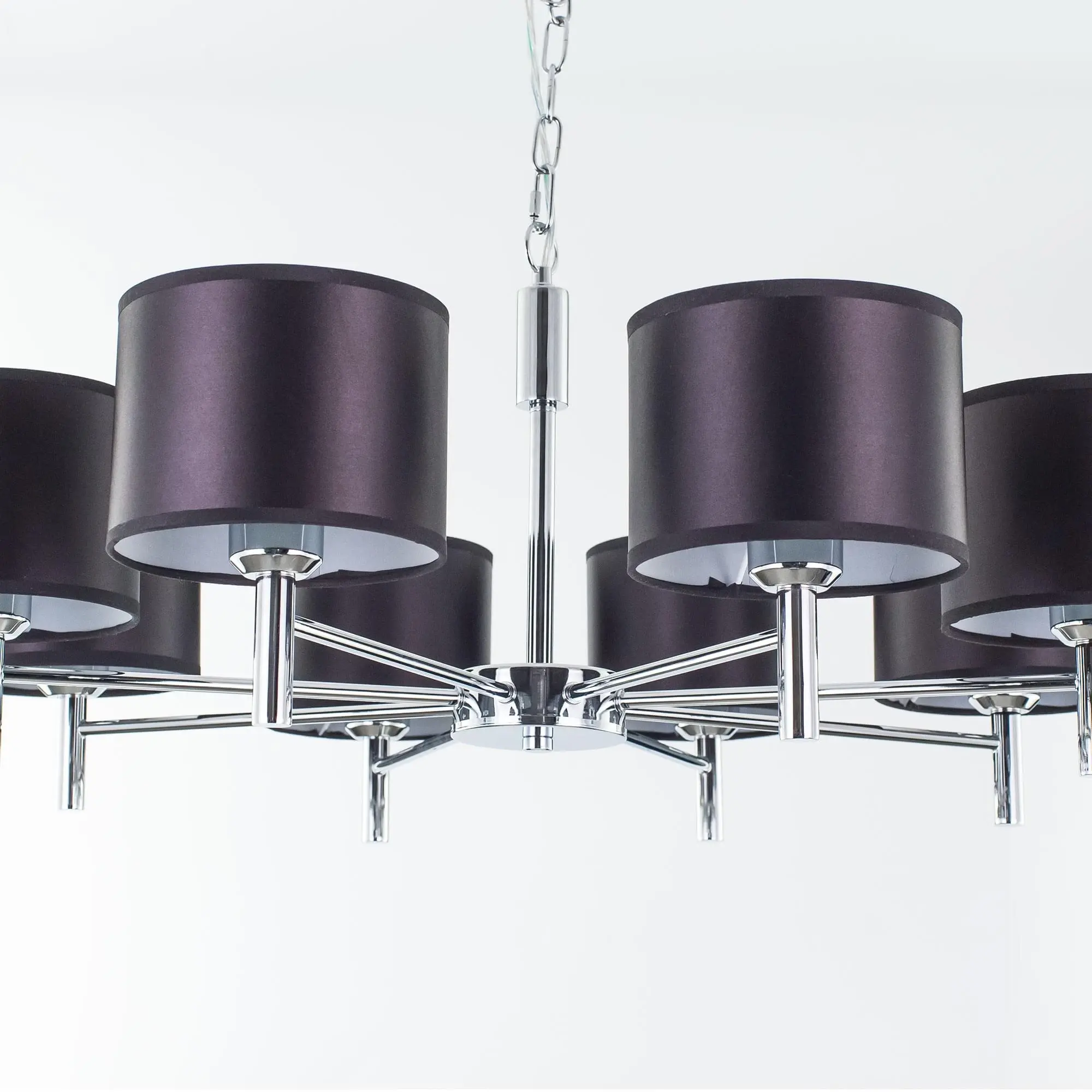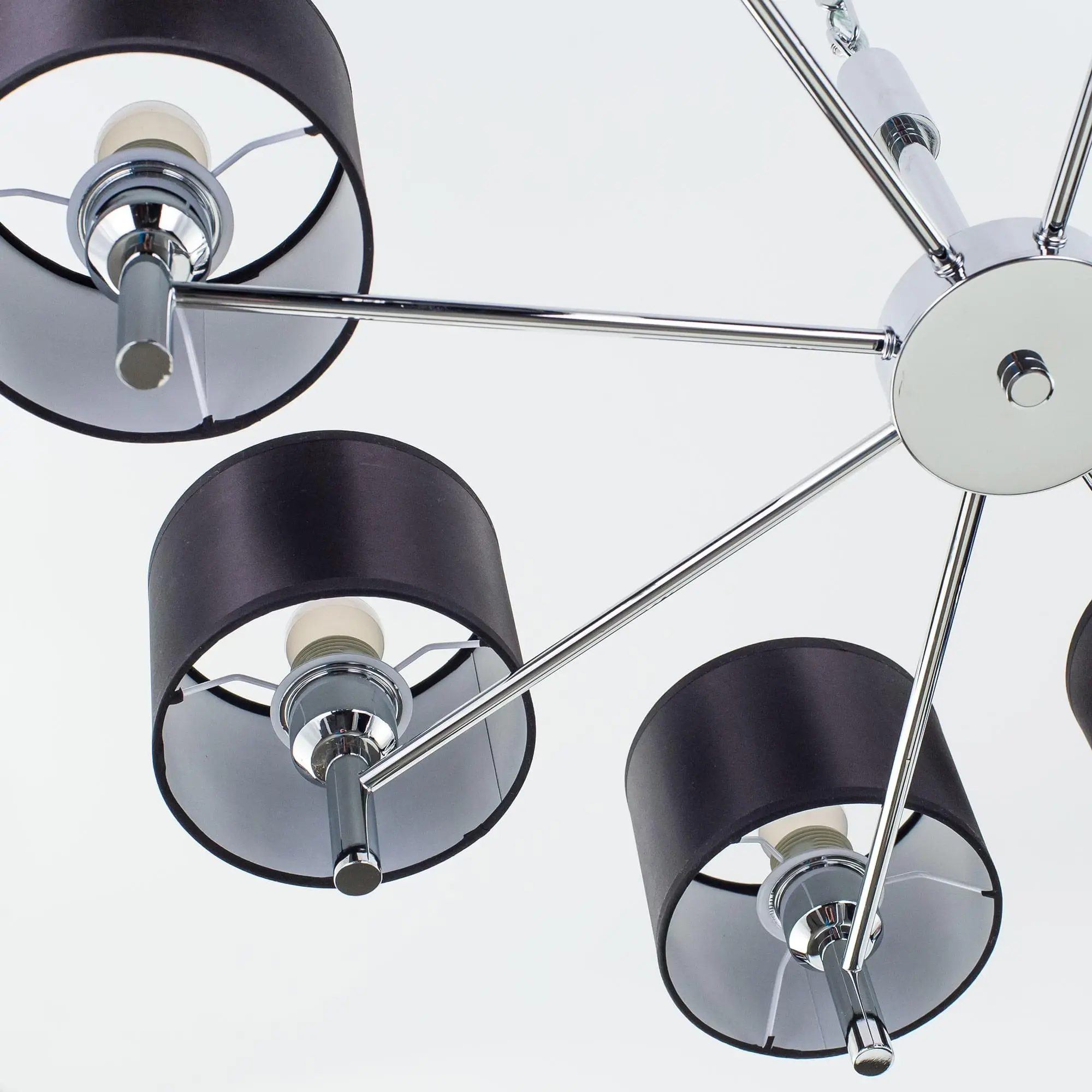 Подвесная люстра Citilux Аврора CL463181 выполнена в современном стиле. Корпус светильника металлический с элегантными рожками, цвет глянцевый хром. Абажуры цилиндрической формы из ткани чёрного цвета на подложке из оптического полимера.