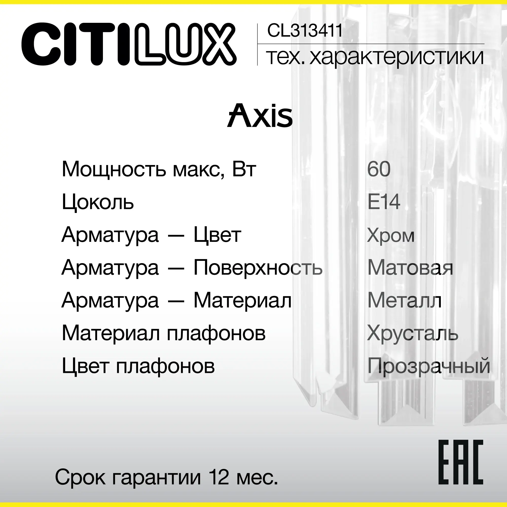 Хрустальное бра Citilux AXIS CL313411 это стильный аксессуар для модного интерьера. Современный дизайн, металлический корпус с глянцевым хромированным покрытием и крупные, кристально прозрачные хрустальные подвески с современной огранкой создают изысканную атмосферу.
