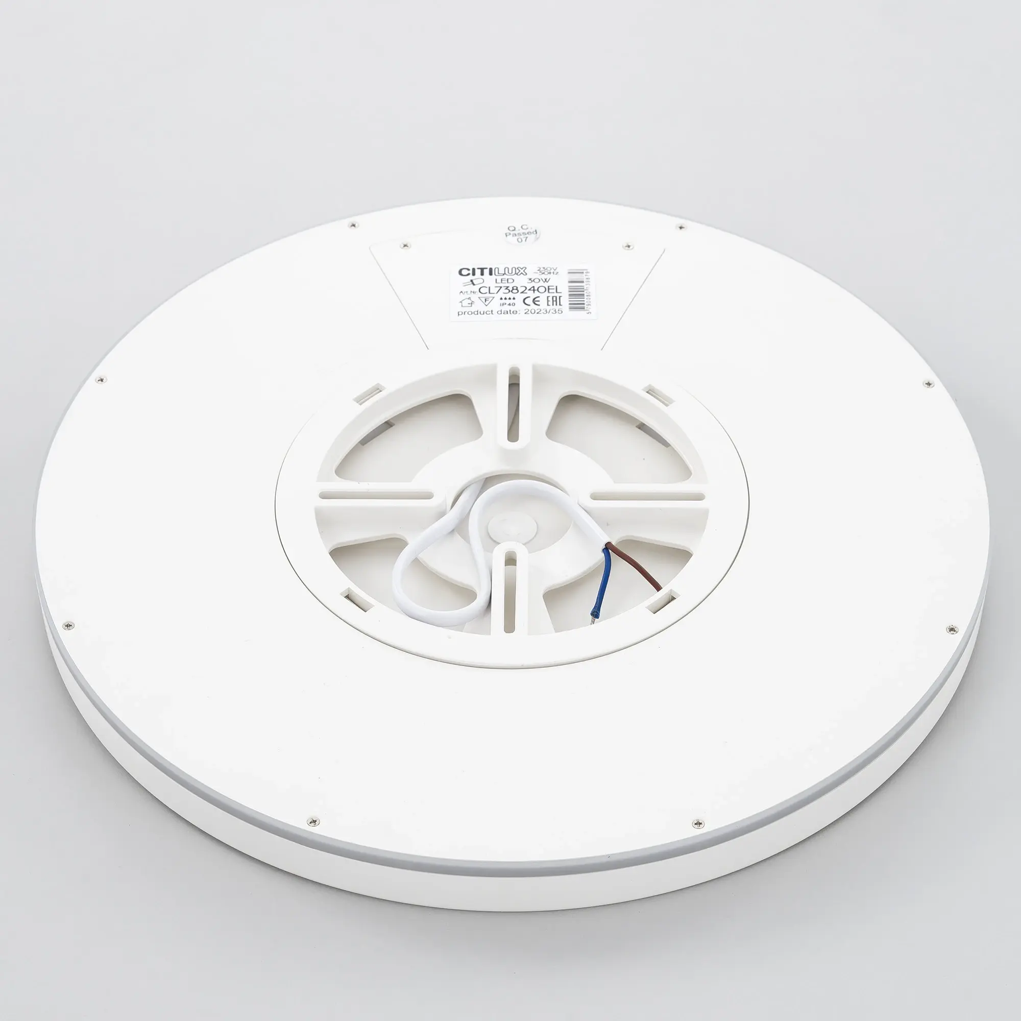 Изделие мощностью 30Вт, обладает высокой энергоэффективностью – 120Лм/Вт. Диаметр 30см, высота 2,5см, осветит до 14м². Свет безопасный для глаз, без мерцания и пульсаций. Тип крепления – удобная монтажная платформа.
