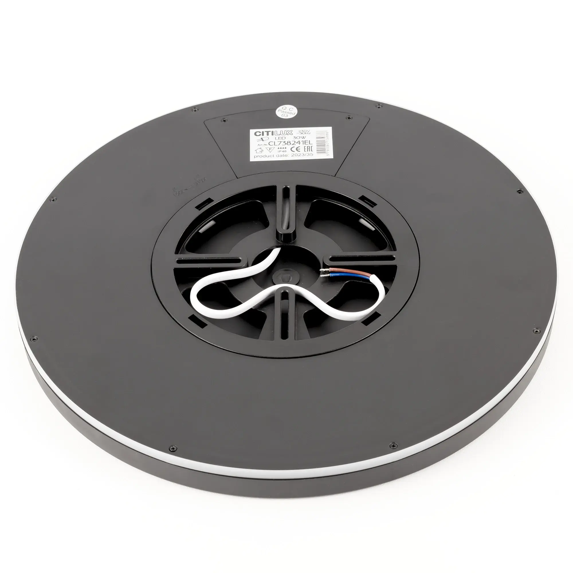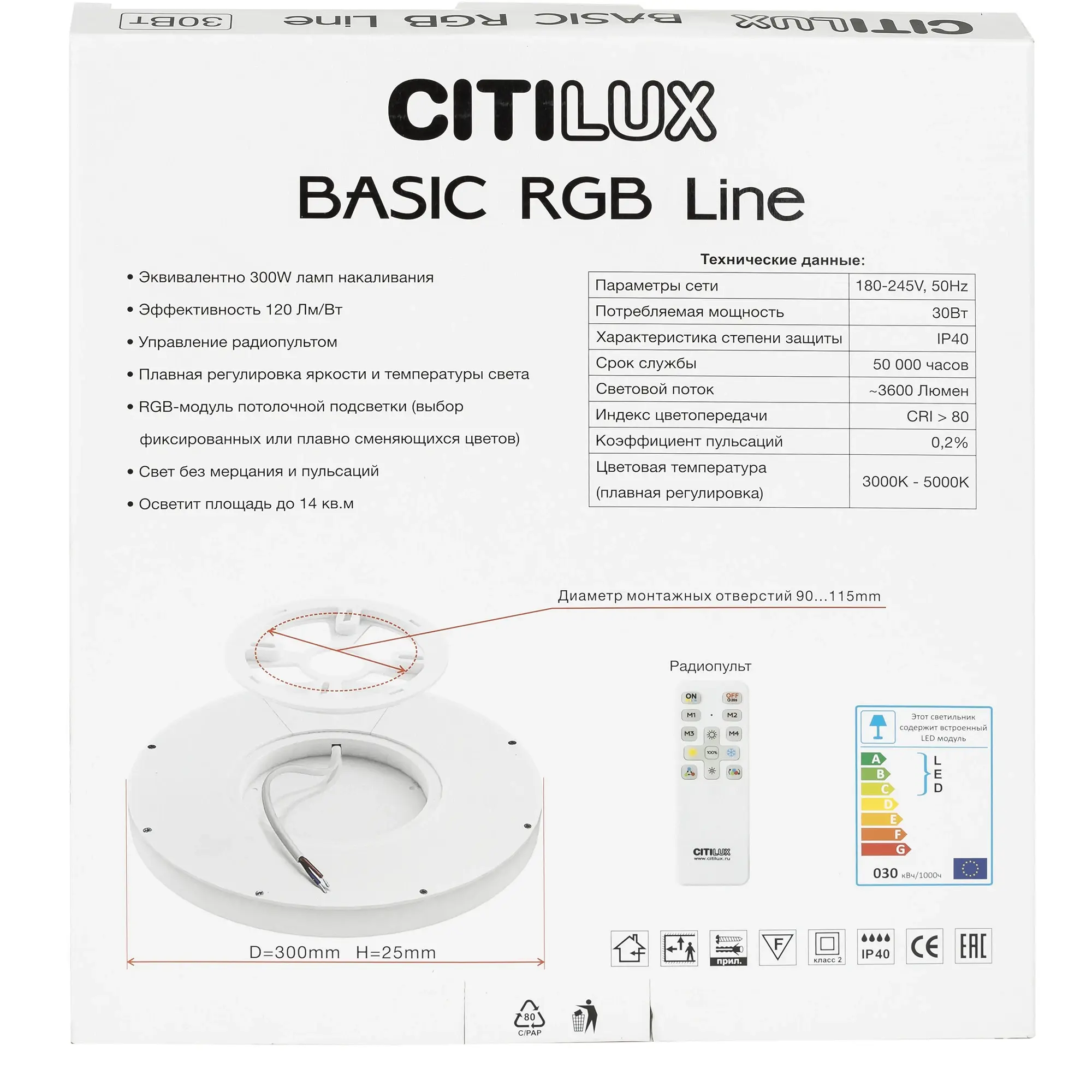 Изделие мощностью 30Вт, обладает высокой энергоэффективностью – 120Лм/Вт. Диаметр 30см, высота 2,5см, осветит до 14м². Свет безопасный для глаз, без мерцания и пульсаций. Тип крепления – удобная монтажная платформа.