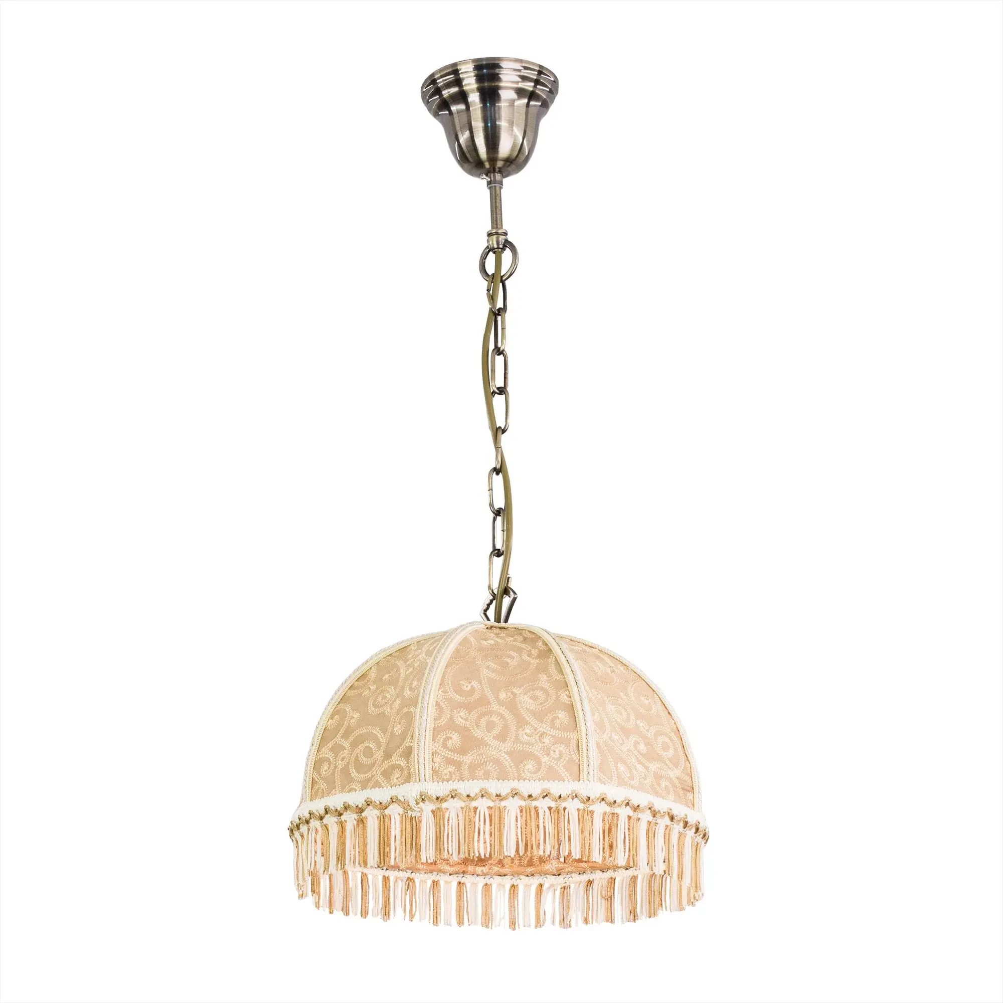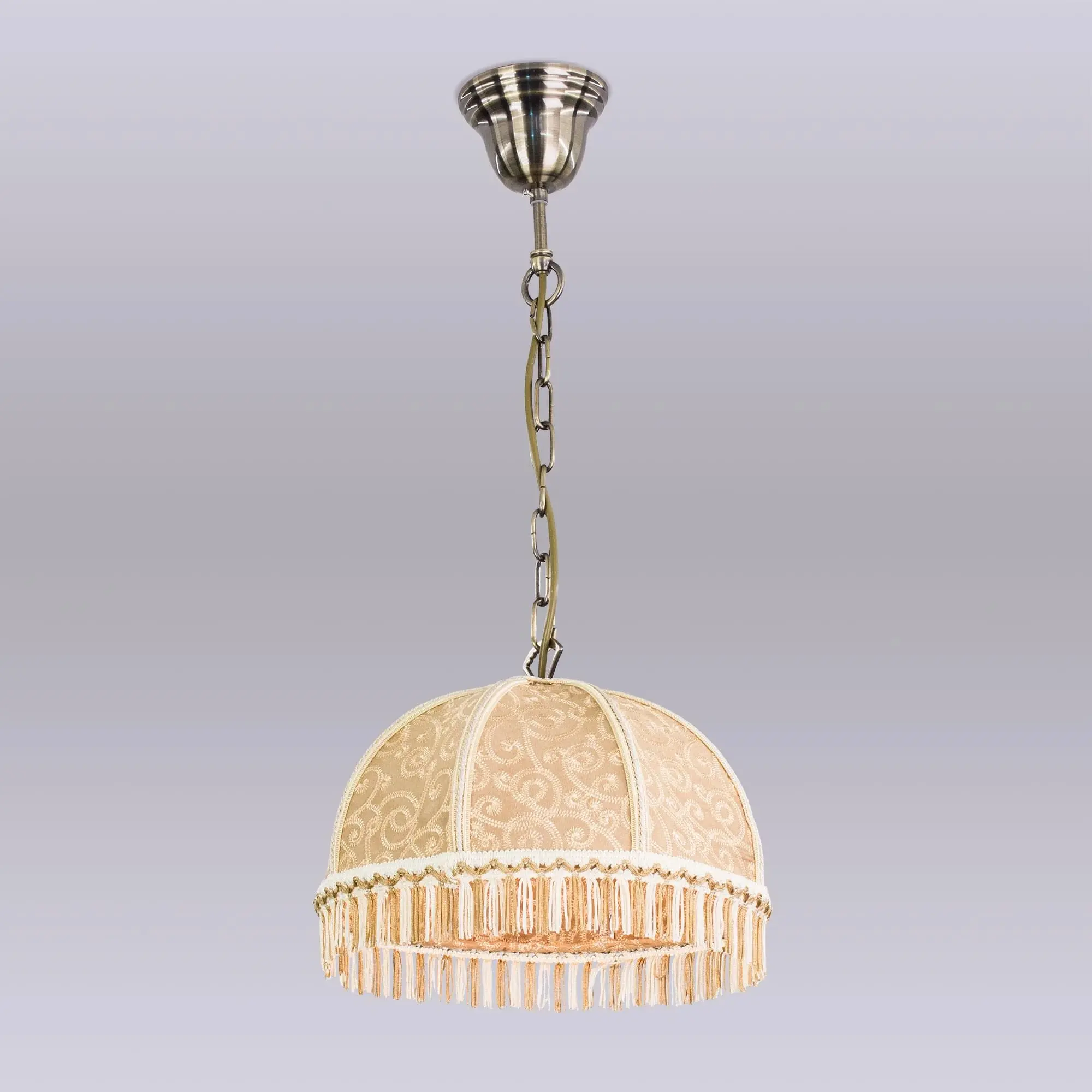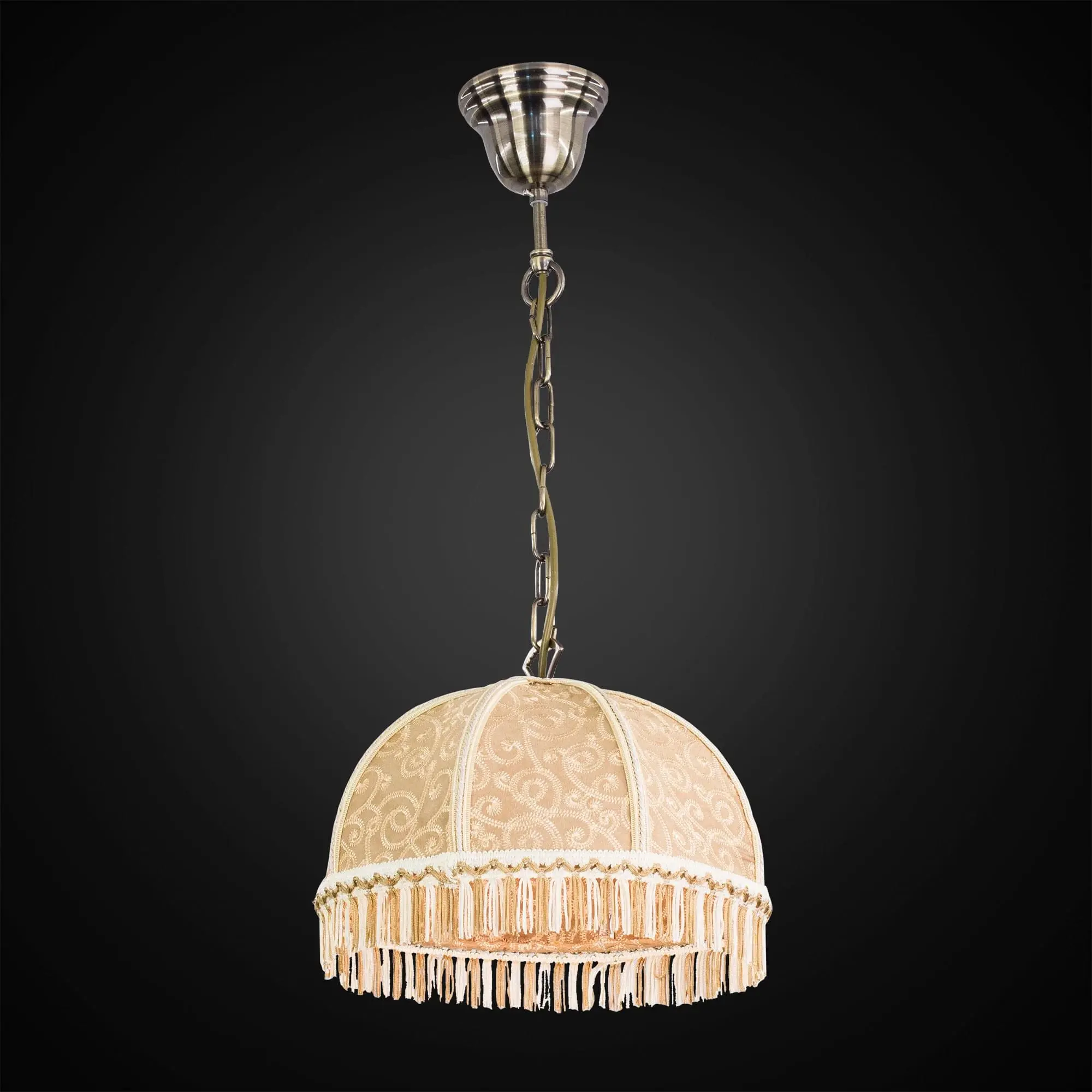 Уютный подвесной светильник Citilux Базель CL407115 выполнен в классическом стиле. Основание металлическое, благородного бронзового цвета. Тканевый винтажный абажур цвета капучино украшен изящной вышивкой и искусно обшит бахромой.