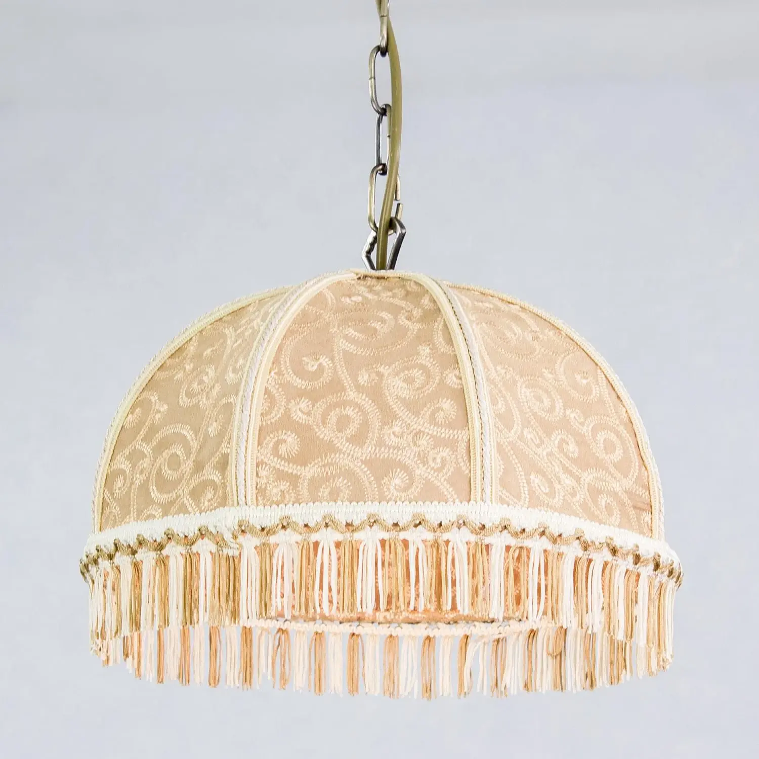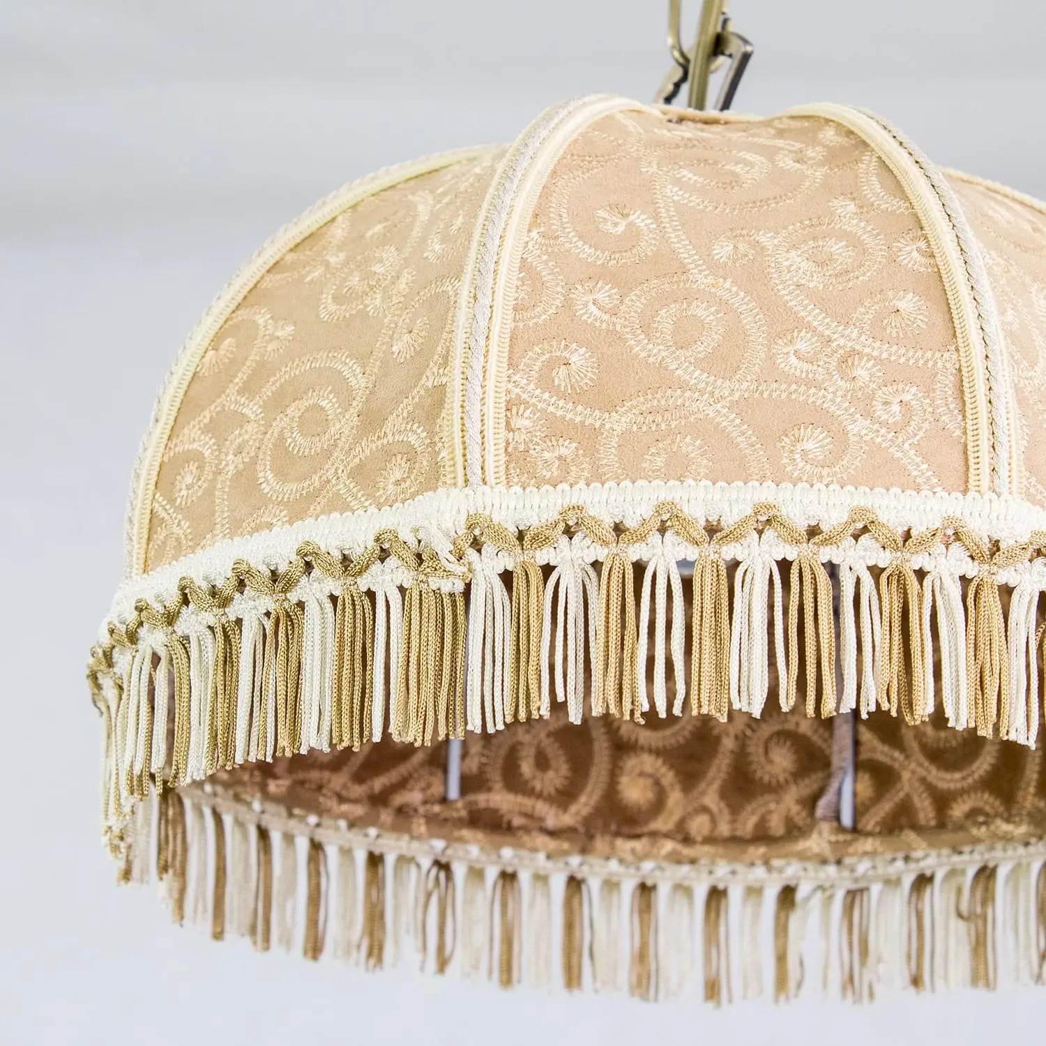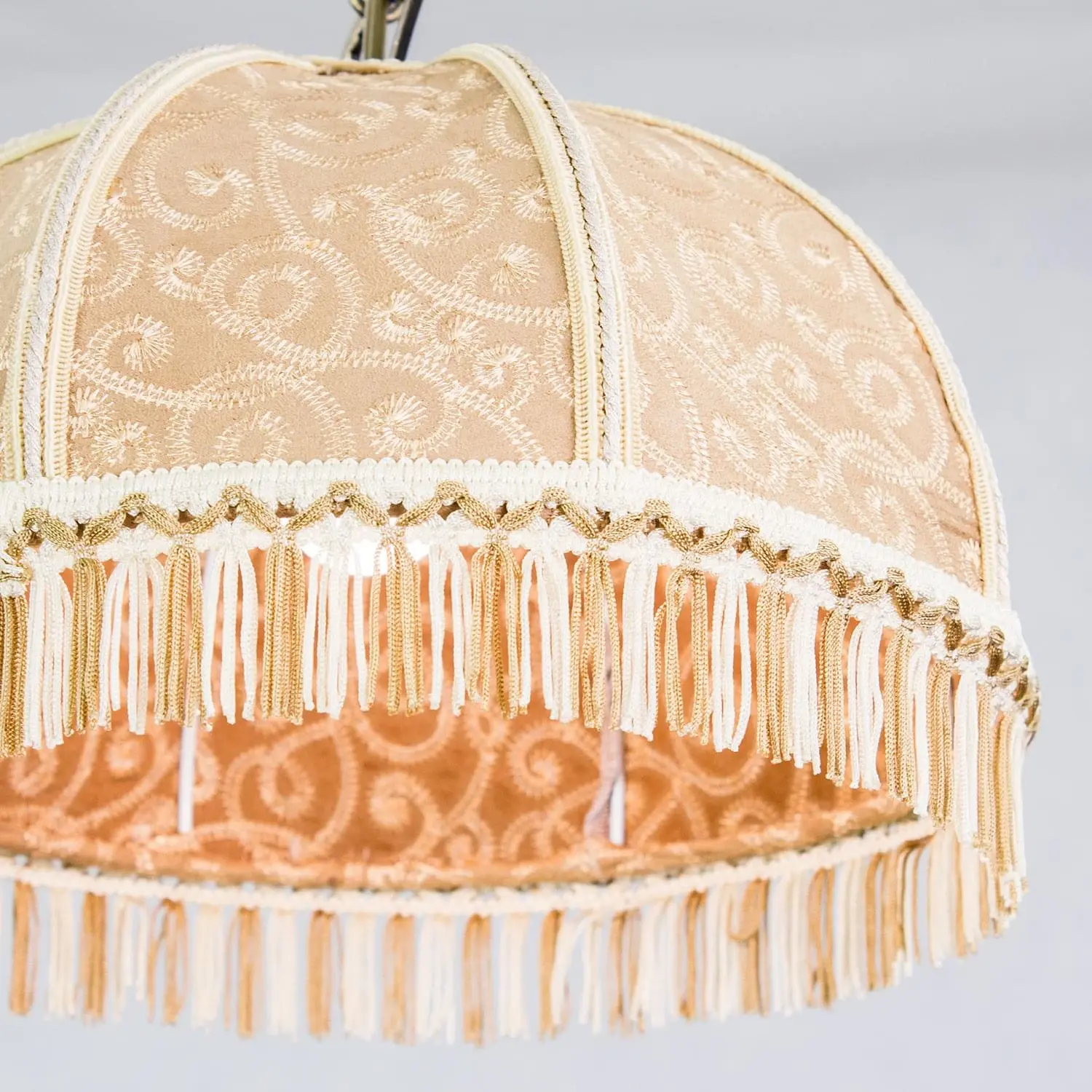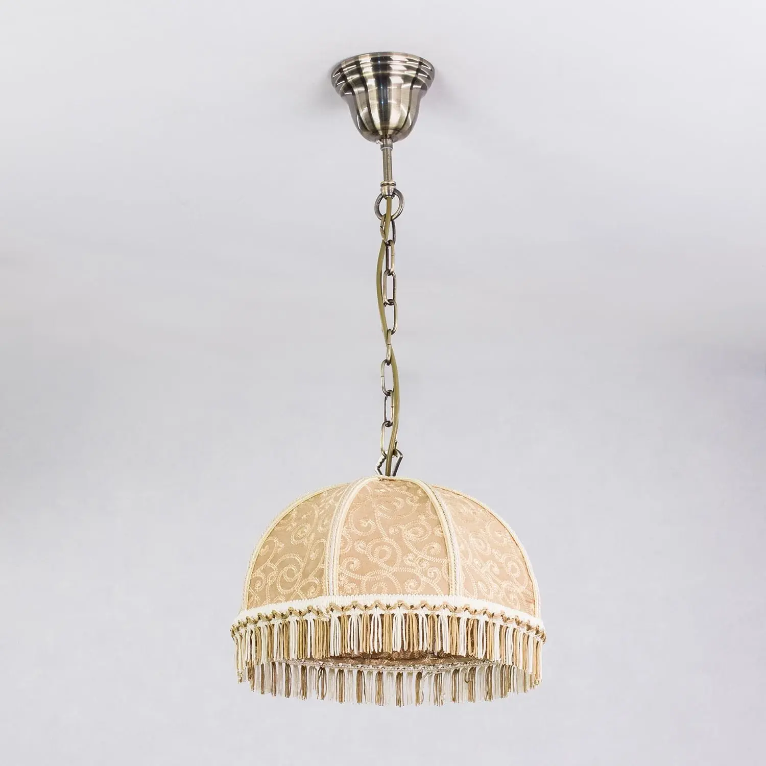 Уютный подвесной светильник Citilux Базель CL407115 выполнен в классическом стиле. Основание металлическое, благородного бронзового цвета. Тканевый винтажный абажур цвета капучино украшен изящной вышивкой и искусно обшит бахромой.