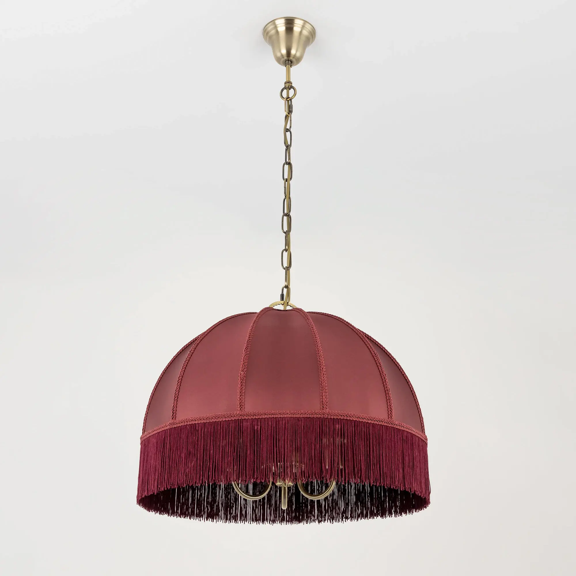 Подвесная трёхрожковая люстра на цепи Citilux Базель CL407133 с классическим абажуром. Корпус светильника металлический, цвет бронза. Абажур тканевый, бордового цвета, декорирован бахромой и ажурной тесьмой. Модель подойдёт для освещения уютной гостиной, кухни или веранды в загородном доме или на даче. Поможет создать комфортную атмосферу в кафе и ресторане, великолепно выглядит над столом. Подходит для всех типов потолков, в том числе натяжных, тип крепления – крючок. В изделии используются лампы с цоколем Е14, максимальной мощностью для ламп накаливания 60Вт, светодиодные лампы можно устанавливать более яркие. Высота регулируется от 50 до 135см, диаметр 51см, осветит около 9м².