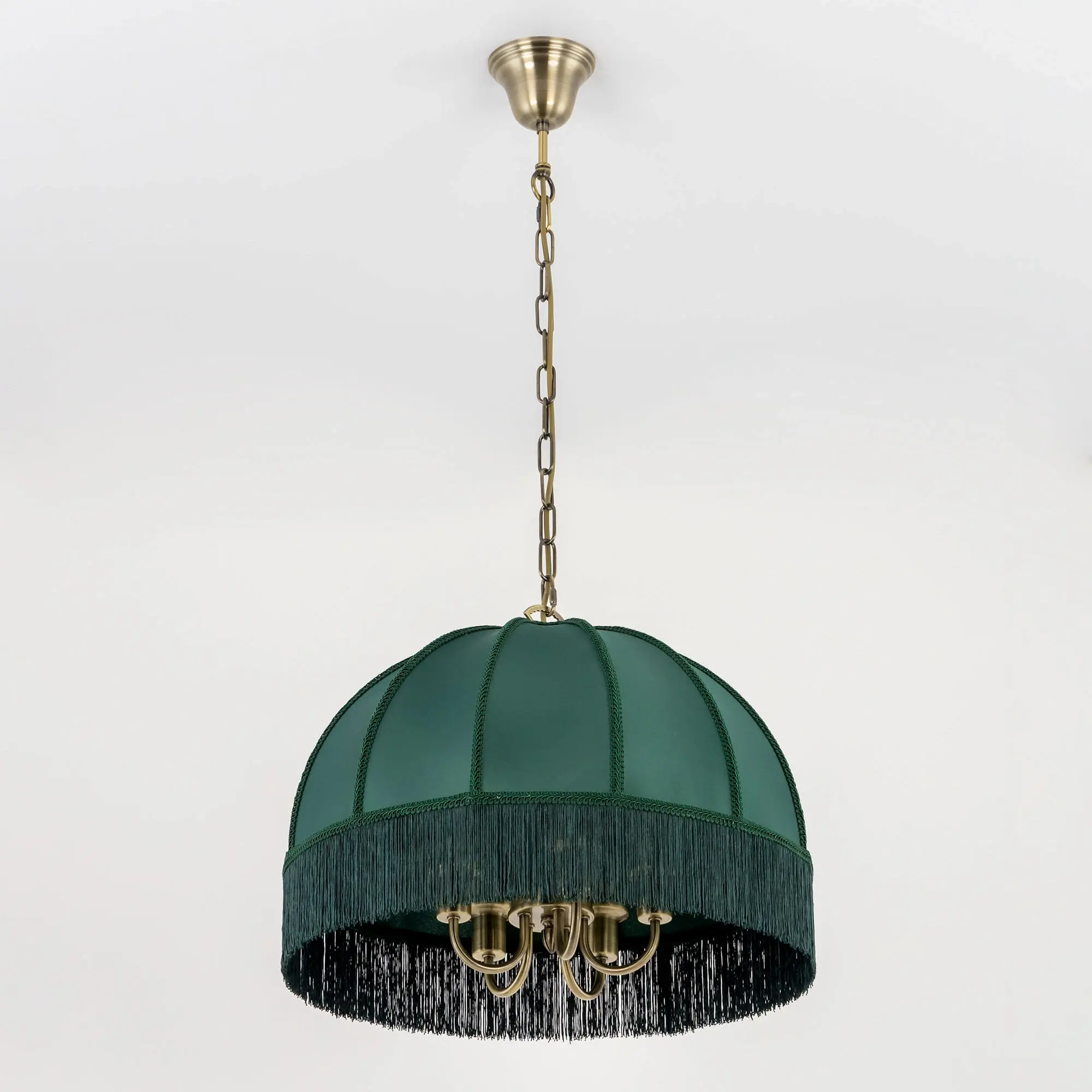 Подвесная пятирожковая люстра на цепи Citilux Базель CL407152 с классическим абажуром. Корпус светильника металлический, цвет бронза. Абажур тканевый, зелёного цвета, декорирован бахромой и ажурной тесьмой. Модель подойдёт для освещения уютной гостиной, кухни или веранды в загородном доме или на даче. Поможет создать комфортную атмосферу в кафе и ресторане, великолепно выглядит над столом. Подходит для всех типов потолков, в том числе натяжных, тип крепления – крючок. В изделии используются лампы с цоколем Е14, максимальной мощностью для ламп накаливания 60Вт, светодиодные лампы можно устанавливать более яркие. Высота регулируется от 50 до 135см, диаметр 51см, осветит около 14м².