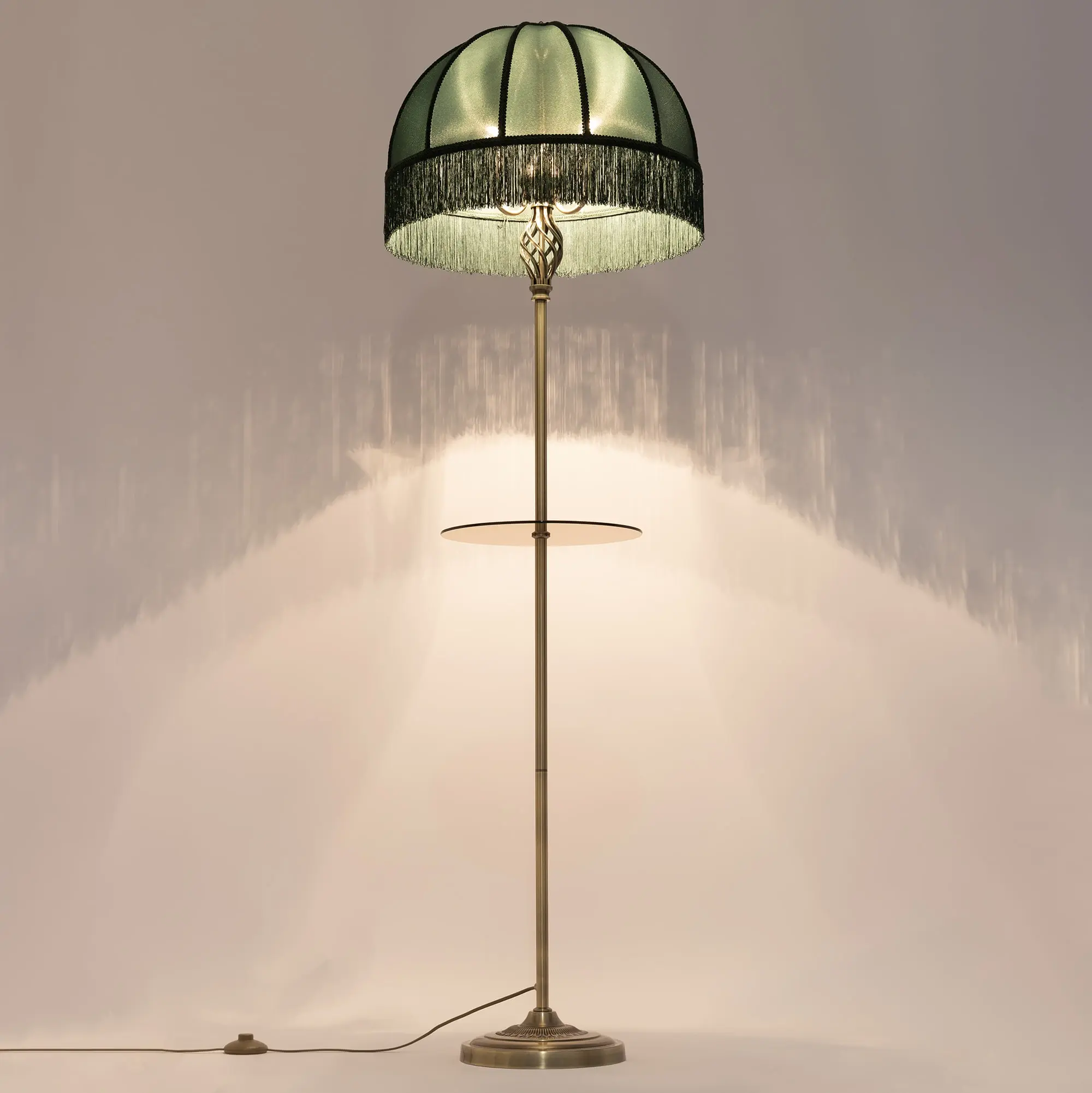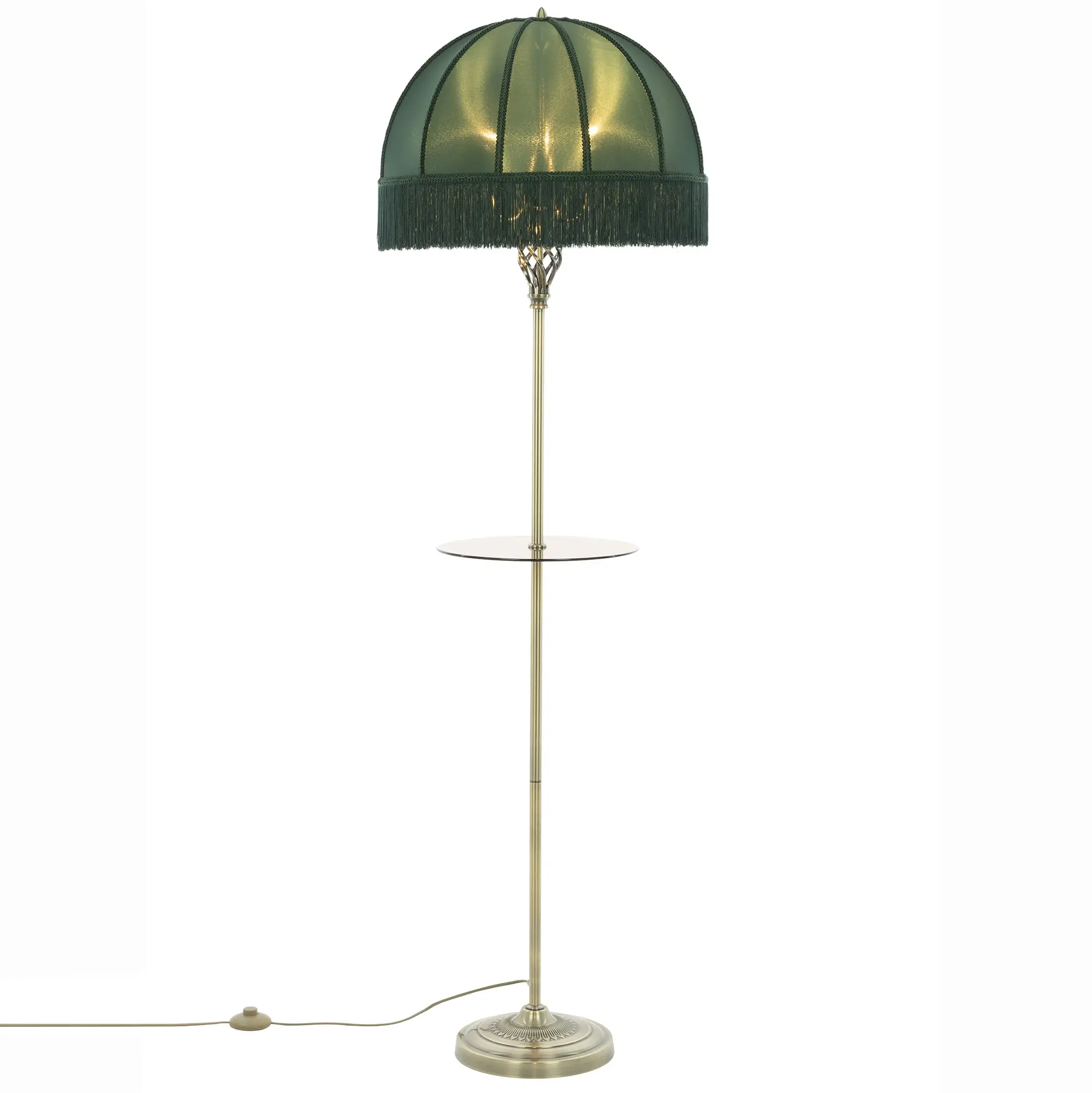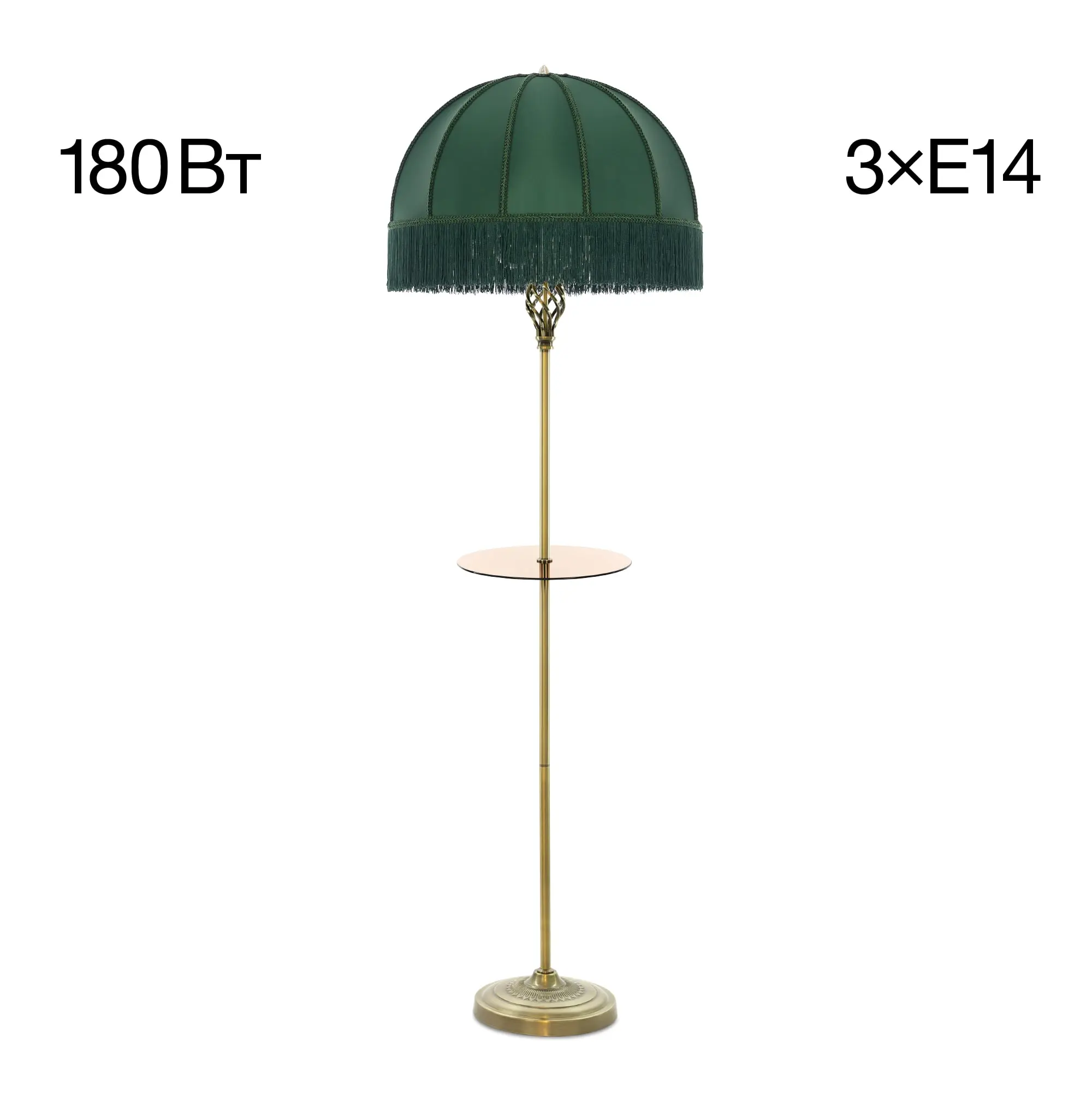 Изумительный торшер со столиком Citilux Базель CL407932T выполнен в классическом стиле. Корпус металлический, благородного бронзового цвета. Устойчивое основание украшено искусным орнаментом, верхняя часть стойки с красивым витым декоративным элементом. Абажур из гладкой зелёной ткани декорирован ажурной тесьмой и обшит бахромой. Удобный круглый столик изготовлен из закалённого тонированного стекла.