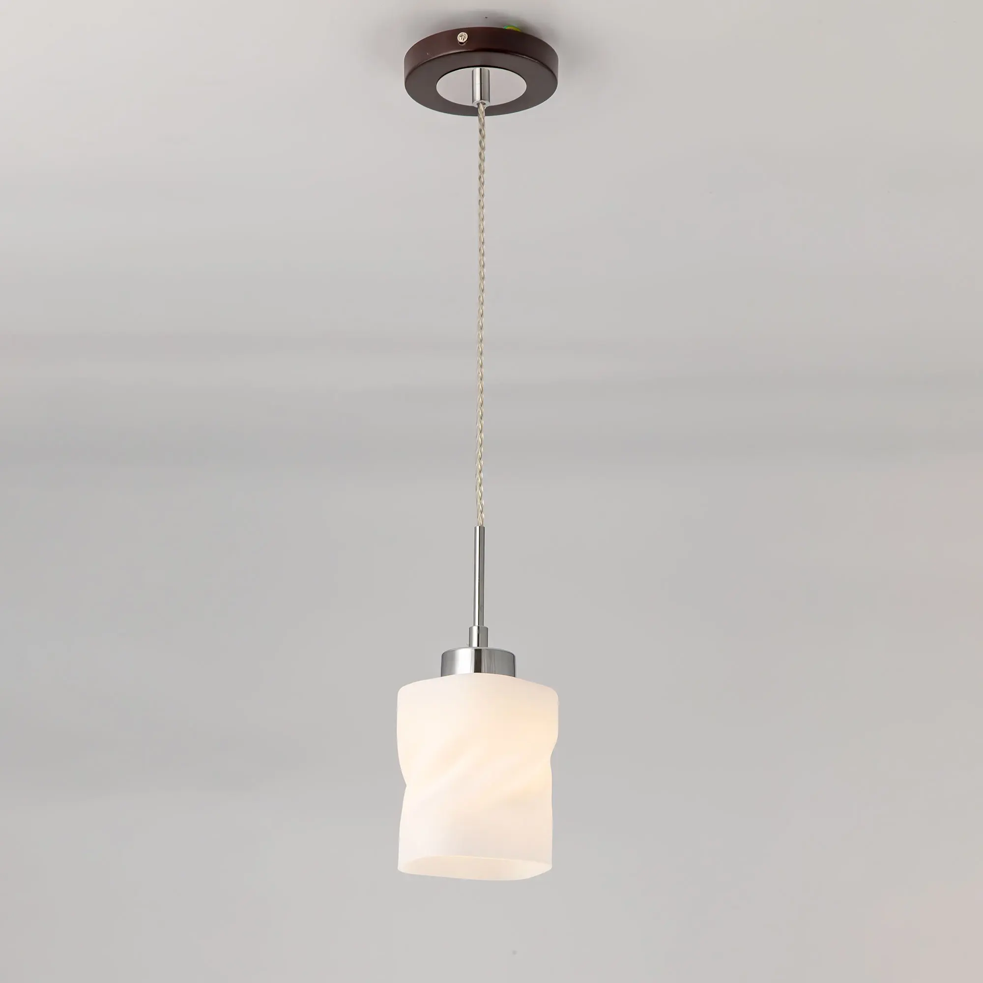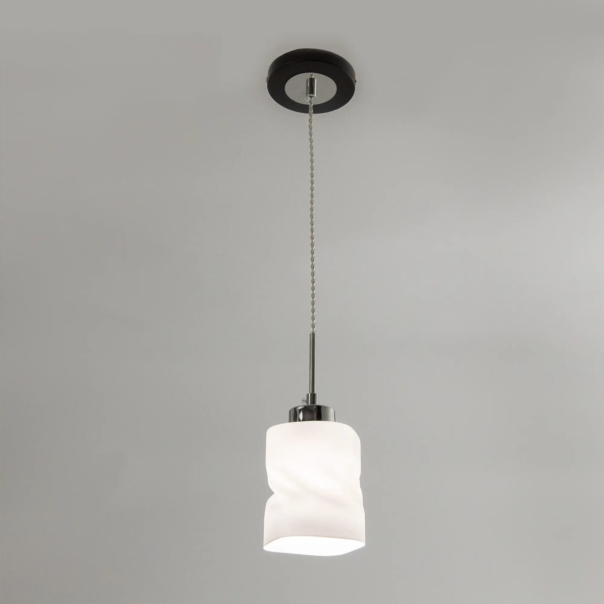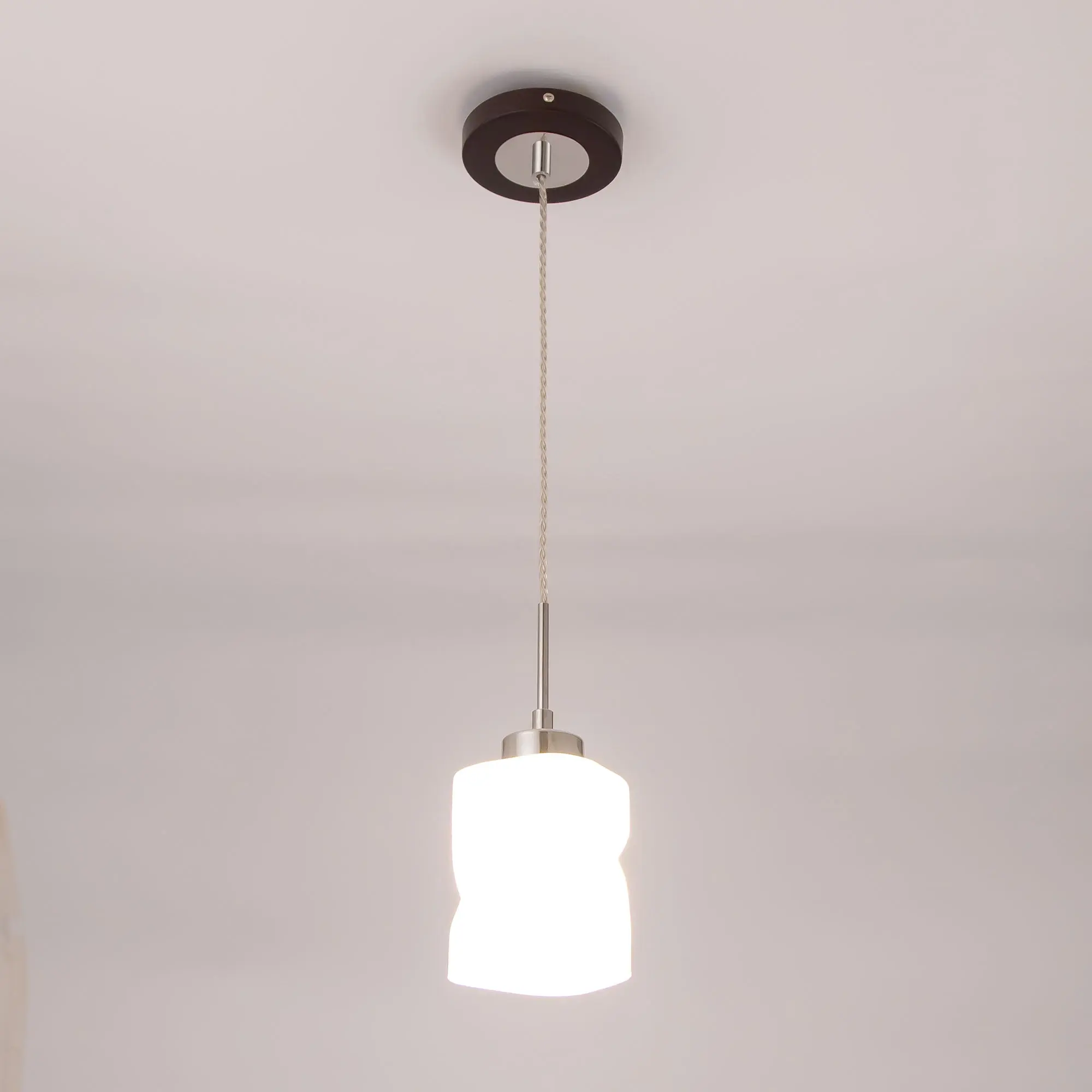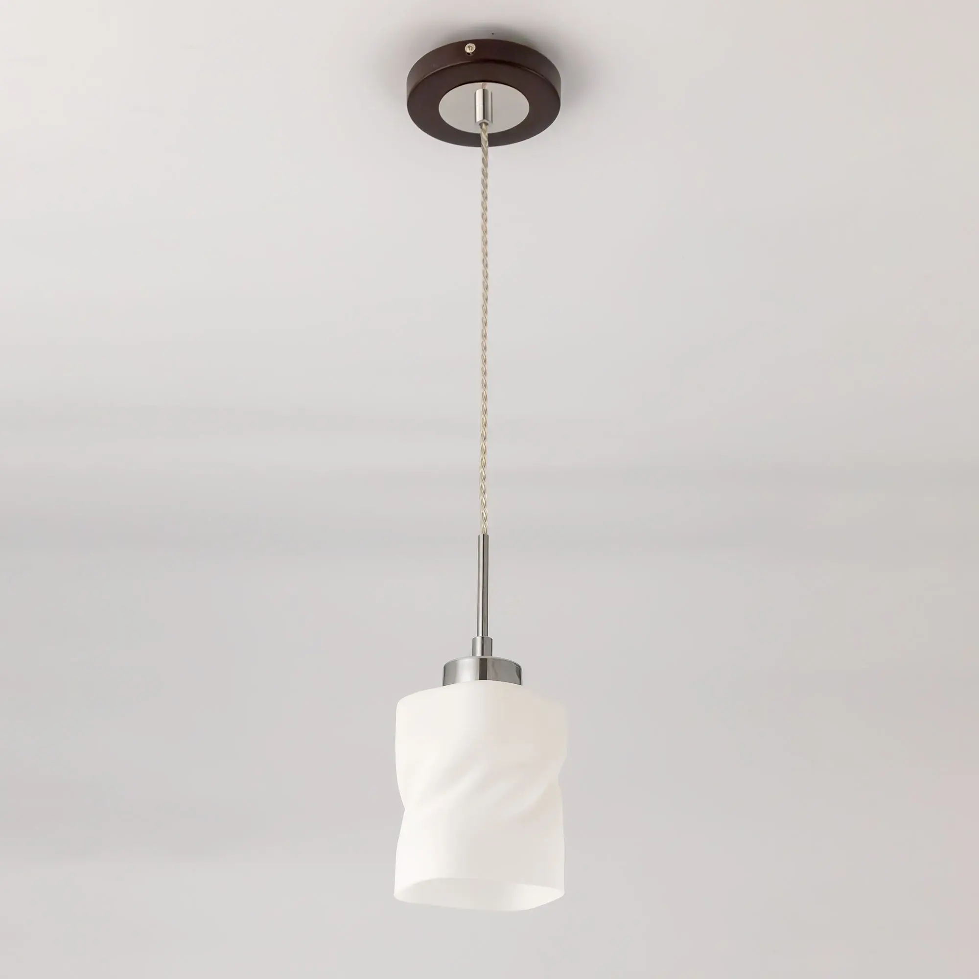 Подвес из обновлённой серии «Берта» будет хорошо смотреться на потолке небольшого помещения, оформленного как в современном, так и классическом стиле. Основная суть обновления заключается в редизайне плафонов, которые теперь гораздо более качественные, лучше пропускают свет, чем в светильниках предыдущего поколения, а также гораздо интересней смотрятся с дизайнерской точки зрения. Такой светильник с прямоугольным, слегка закрученным в центральной части плафоном осветит помещение площадью до 4 квадратных метров. За счёт такой яркости модель можно использовать в качестве самостоятельно светильника в помещениях небольшого размера. Особенно хорошо смотрятся, если применять в количествах. Идеально подойдет для локальной подсветки рабочей зоны или, к примеру, кухонного стола. Конструкция продумана таким образом, что есть возможность регулировать высоту монтажа от 45 до 105 сантиметров. Допускается применение любого типа ламп с цоколем E27 и потребляемой мощностью не более 75 ватт. При производстве светильника использовались такие материалы, как матовое стекло и металл. Основным цветом является венге (тёмно-коричневый) и хром.