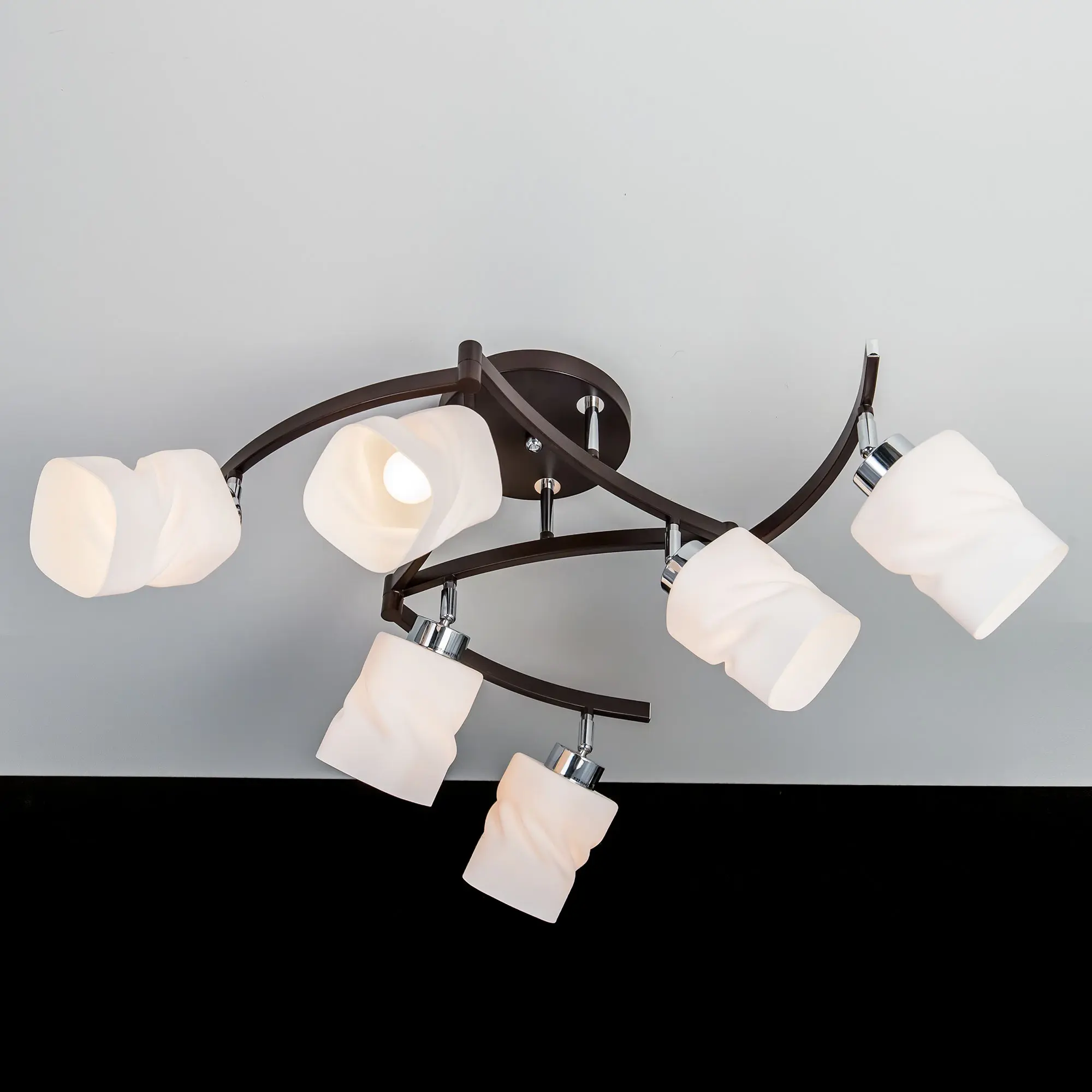 Потолочные светильники серии «Берта» оснащены уникальной возможность менять внешний вид. В конструкции используются поворотные рожки и плафоны. С помощью шарнирных механизмов основания люстры можно не только изменить диаметр светильника от компактно сложённого, до развёрнутого на максимум, а также и его дизайн, чтобы люстра идеально подошла на квадратуру комнаты и гармонично вписалась в общий интерьер вашего помещения. Обновлённая серии «Берта» будет хорошо смотреться в помещениях, оформленных как в современном, так и классическом стиле. Основная суть обновления заключается в редизайне плафонов, которые теперь гораздо более качественные, лучше пропускают свет, чем в светильниках предыдущего поколения, а также гораздо интересней смотрятся с дизайнерской точки зрения. Вращающиеся вокруг своей оси плафоны дают возможность максимально комфортно настроить освещение в помещении. Плафоны по дизайнерской задумке не строго квадратные, а с лёгким поворотом вокруг своей оси, что добавляет им изящества и шарма. Арматура люстры с завода в упаковке собрана и скоммутирована на двойной выключатель. Разводка очень необычная – с одной клавиши включаются три центральных плафона, со второй три крайних, что очень удобно с точки зрения распределения освещения в комнате. Цвет арматуры – венге, тёмно-коричневый. Такой вариант окраски позволяет с лёгкостью идеально привязаться по цветовой гамме к тёмной мебели или тёмным элементам интерьера. Если же в интерьере нет тёмных элементов, светильник сразу превращается в арт объект, который на контрасте на белом потолке начинает играть роль главной скрипки в вашем дизайне. В моделях данной серии можно использовать очень яркие, мощные лампочки, так как в светильниках используются качественные, термостойкие патроны, которые выдерживают лампы накаливания до 75 Ватт включительно, а размеры плафона дают возможность установить мощные светодиодные или энергосберегающие лампочки больших габаритов, тем самым обеспечивая наилучший уровень освещённости. Шести рожковый светильник полноценно осветит комнату площадью до 21 квадратного метра.