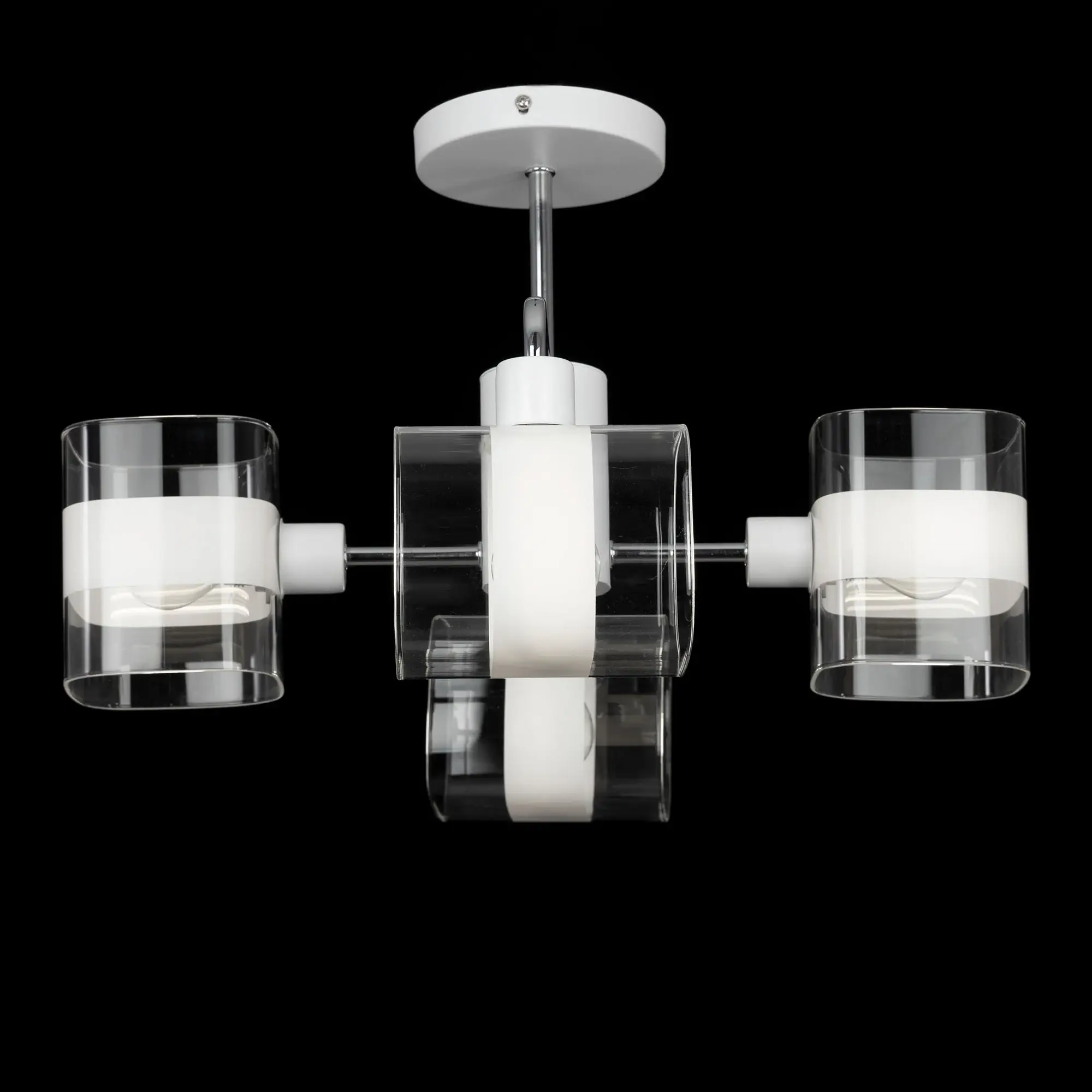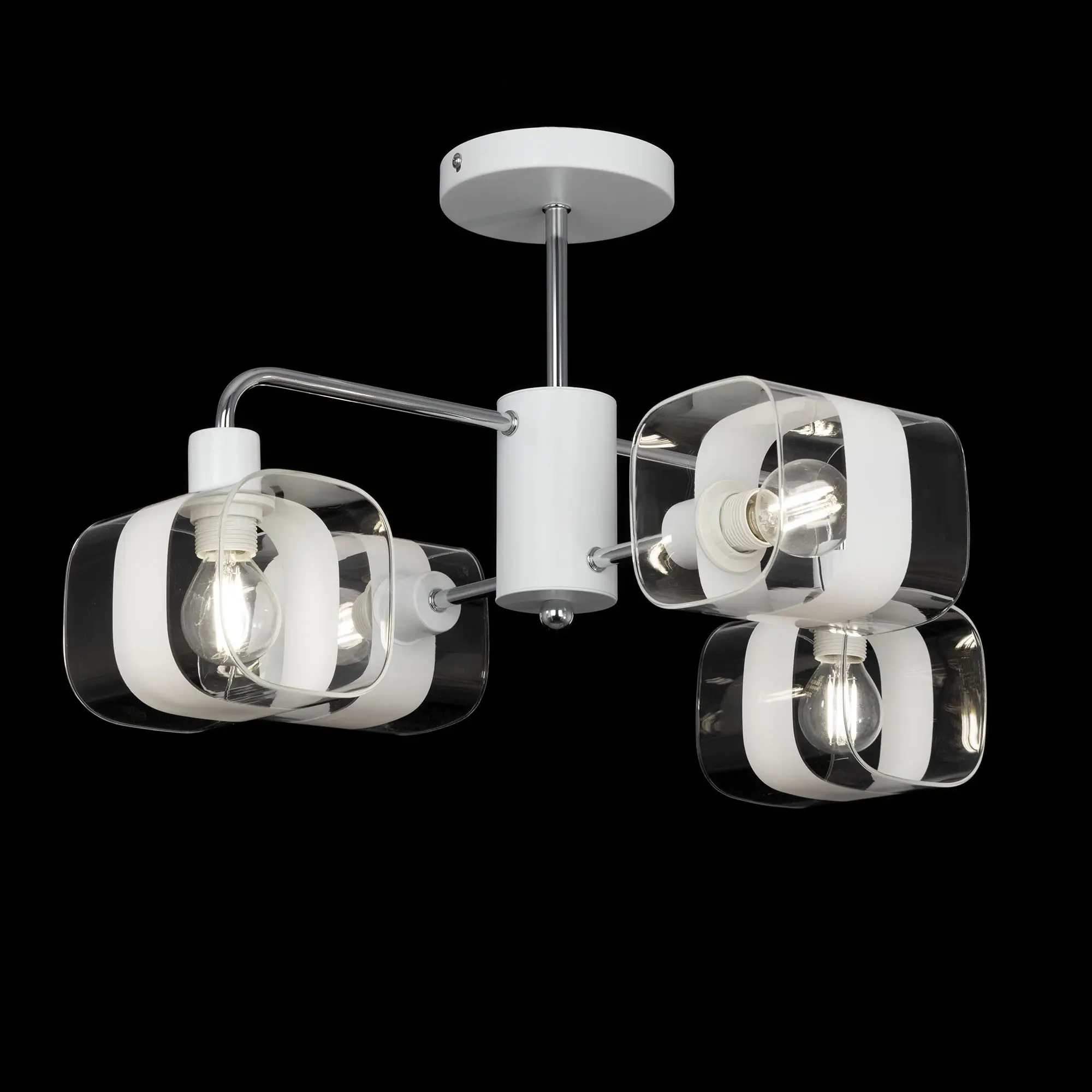 Потолочная люстра Citilux Бертон CL140140 в современном стиле. Корпус металлический, белого цвета, с декоративными хромированными элементами. Плафоны стеклянные, прозрачные, с декоративной белой полосой. В изделии используются 4 лампы с цоколем Е14, максимальной мощностью для ламп накаливания 60Вт (В комплект не входит приобретается отдельно). Светильник можно использовать как с одноклавишным, так и с двухклавишным выключателем. Подходит для всех типов потолков, в том числе натяжных, тип крепления – планка. Люстра четырёхрожковая, размер 49х45см, высота 30,5см.,