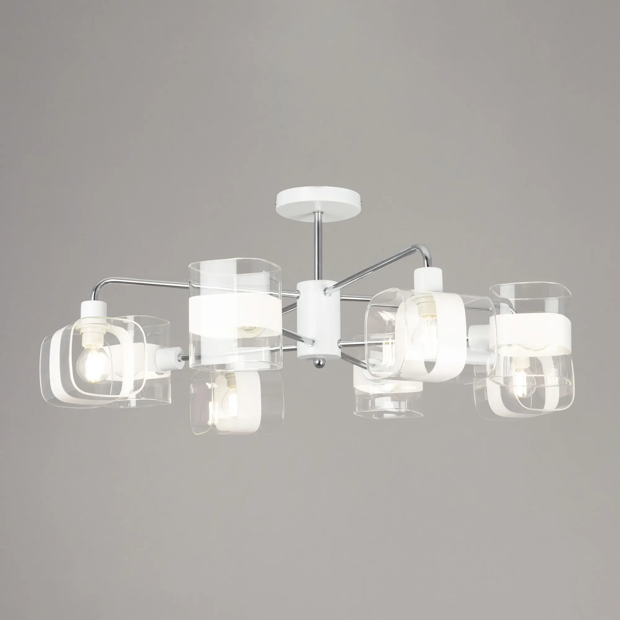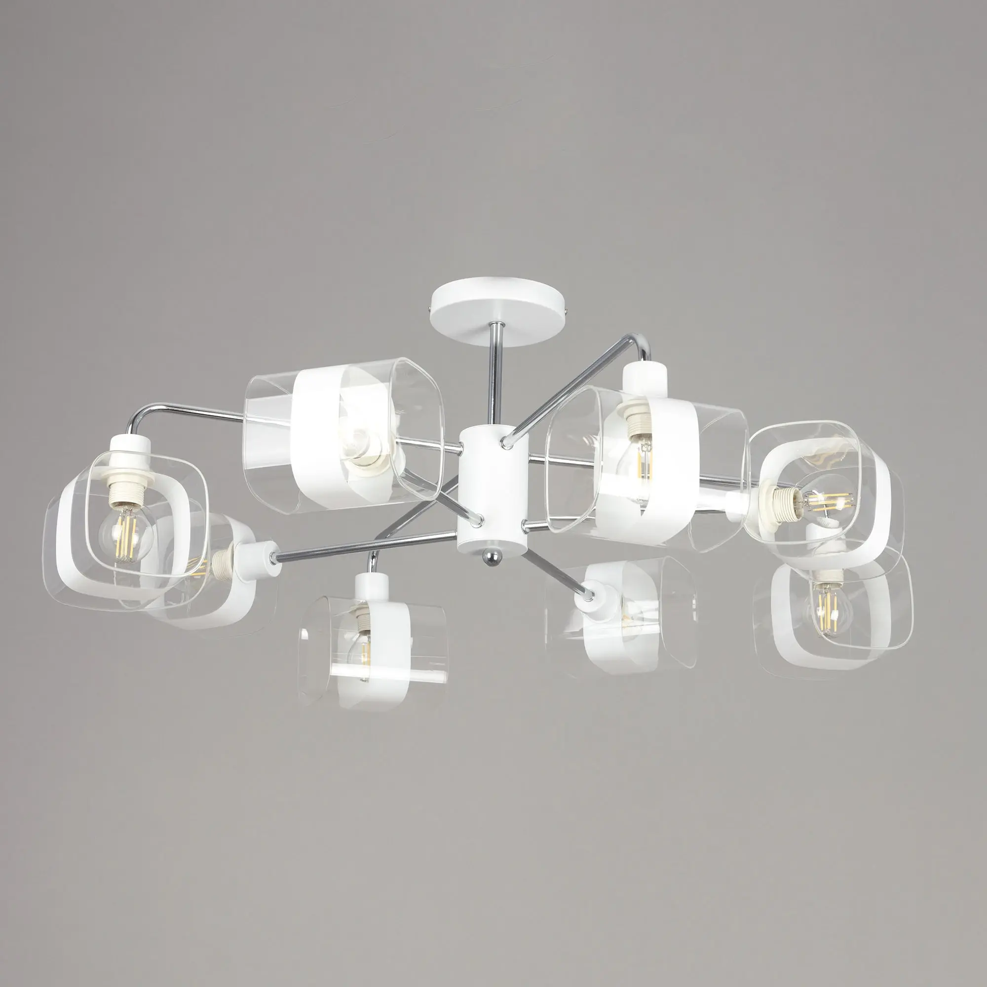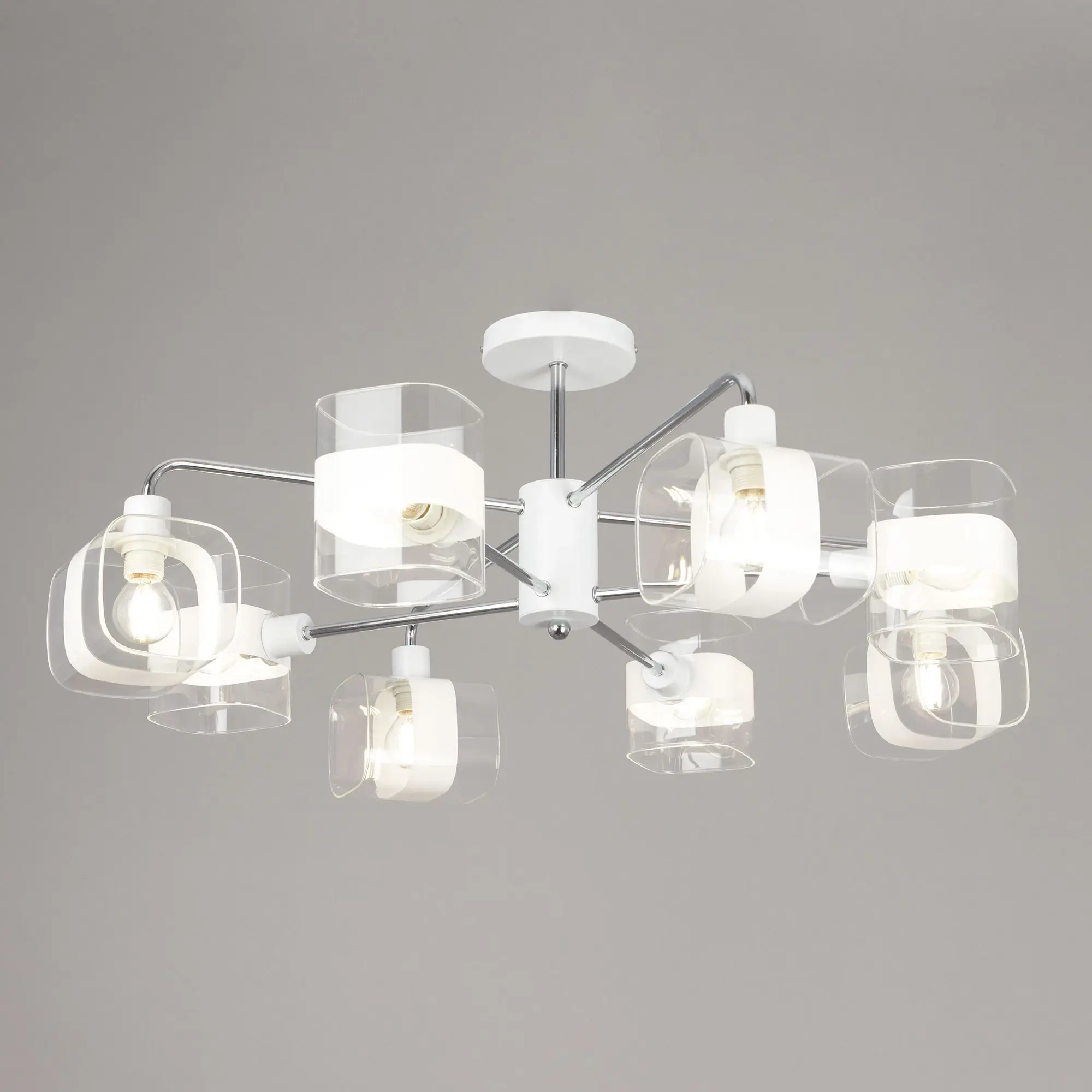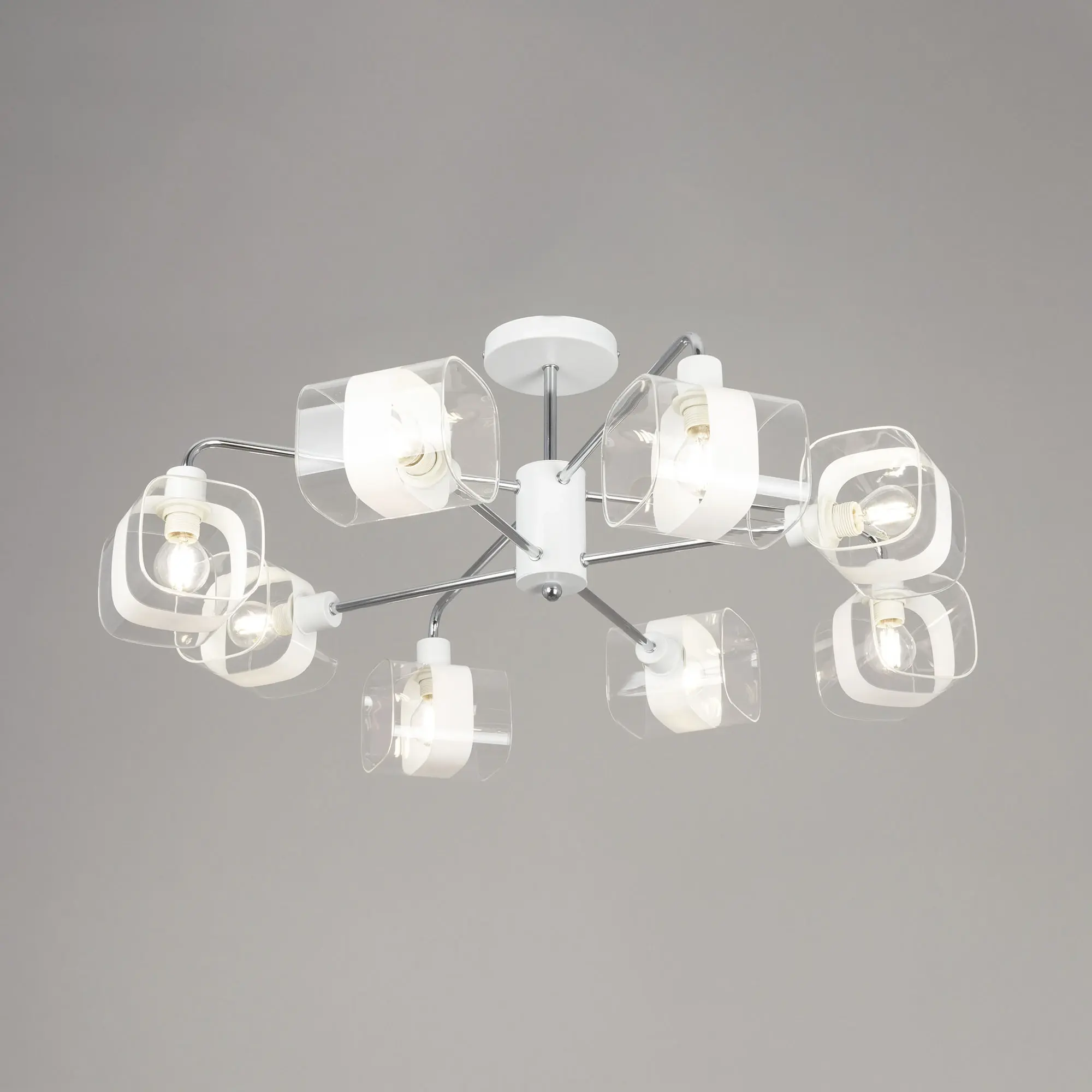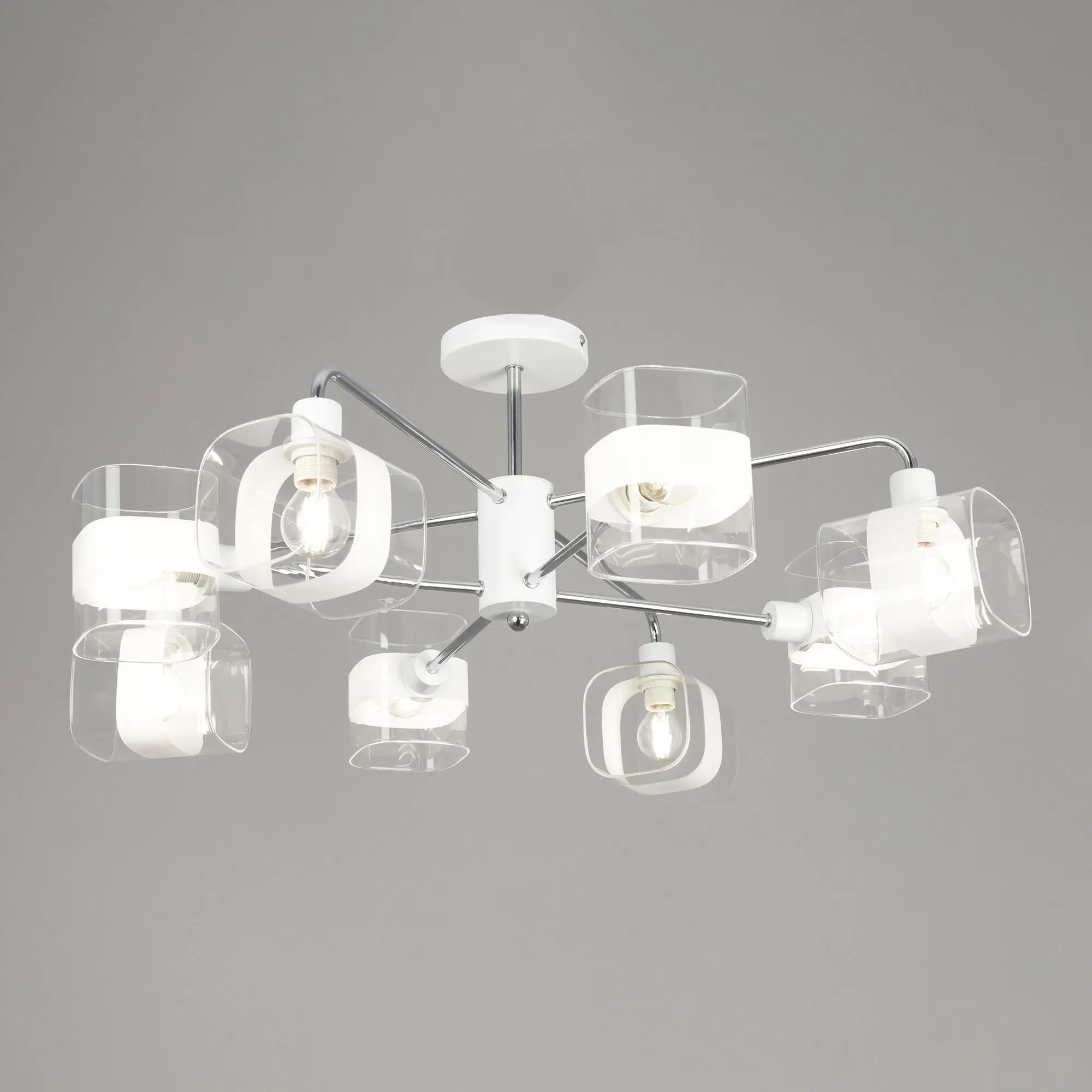Потолочная люстра Citilux Бертон CL140180 в современном стиле. Корпус металлический, белого цвета, с декоративными хромированными элементами. Плафоны стеклянные, прозрачные, с декоративной белой полосой. В изделии используются 8 ламп с цоколем Е14, максимальной мощностью для ламп накаливания 60Вт (В комплект не входит приобретается отдельно). Светильник можно использовать как с одноклавишным, так и с двухклавишным выключателем. Подходит для всех типов потолков, в том числе натяжных, тип крепления – планка. Люстра восьмирожковая, размер 76х76см, высота 30,5см.