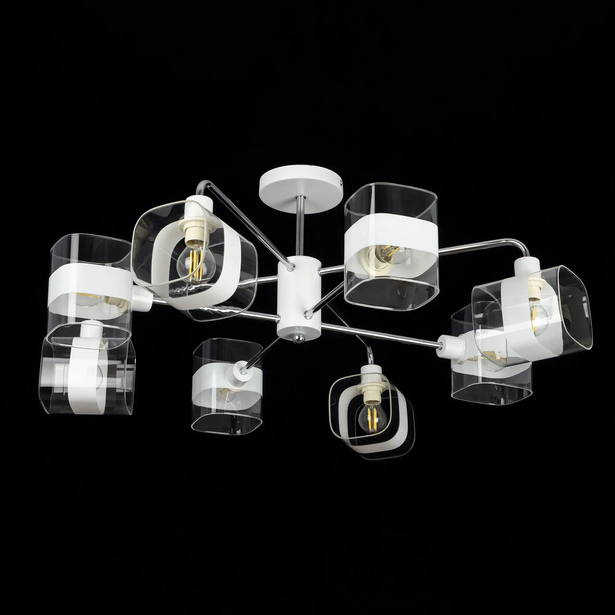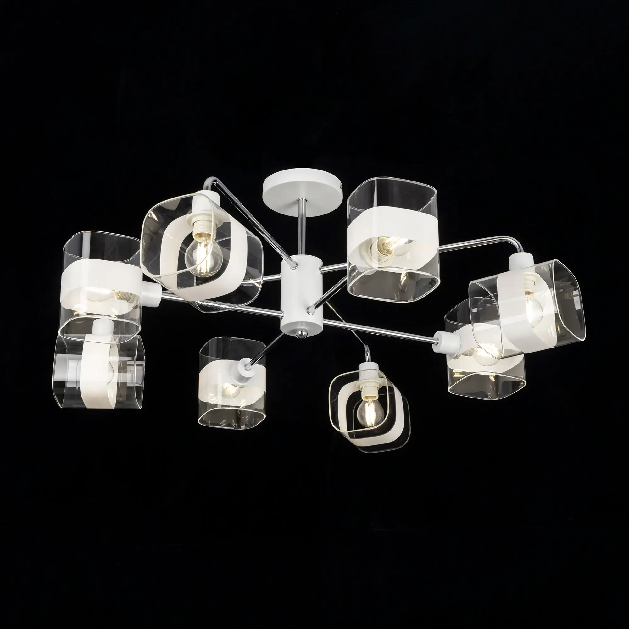 Потолочная люстра Citilux Бертон CL140180 в современном стиле. Корпус металлический, белого цвета, с декоративными хромированными элементами. Плафоны стеклянные, прозрачные, с декоративной белой полосой. В изделии используются 8 ламп с цоколем Е14, максимальной мощностью для ламп накаливания 60Вт (В комплект не входит приобретается отдельно). Светильник можно использовать как с одноклавишным, так и с двухклавишным выключателем. Подходит для всех типов потолков, в том числе натяжных, тип крепления – планка. Люстра восьмирожковая, размер 76х76см, высота 30,5см.,