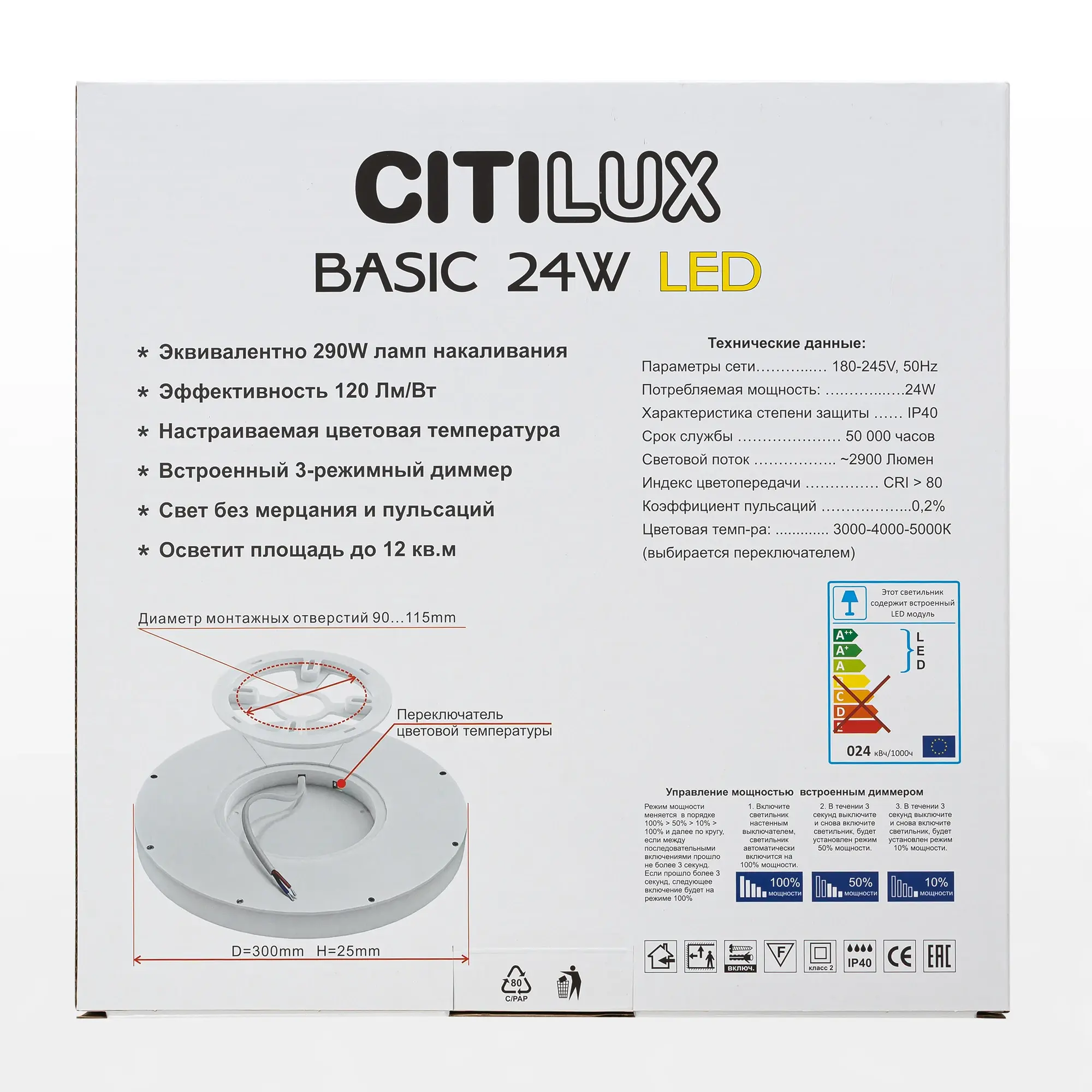 Изделие мощностью 24В оснащено встроенным 3-х ступенчатым диммером 100-50-10% яркости, управляется настенным выключателем. Индекс цветопередачи CRI >80. Модель имеет ступенчатую регулировку цветовой температуры 3000К-4000К-5000К, для этого перед монтажом, на тыльной стороне светильника, переключателем устанавливается выбранный вариант свечения. Свет безопасный для глаз, без мерцания и пульсаций.