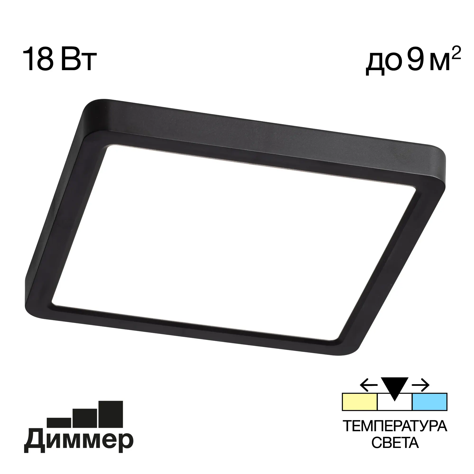 Изделие мощностью 18Вт обладает высокой энергоэффективностью – 120Лм/Вт, оснащено встроенным 3-х ступенчатым диммером 100-50-10% яркости, управляется настенным выключателем. Модель имеет ступенчатую регулировку цветовой температуры 3000К, 4000К, 5000К. Для этого перед монтажом, на тыльной стороне светильника, переключателем устанавливается выбранный вариант свечения. Свет безопасный для глаз, без мерцания и пульсаций.