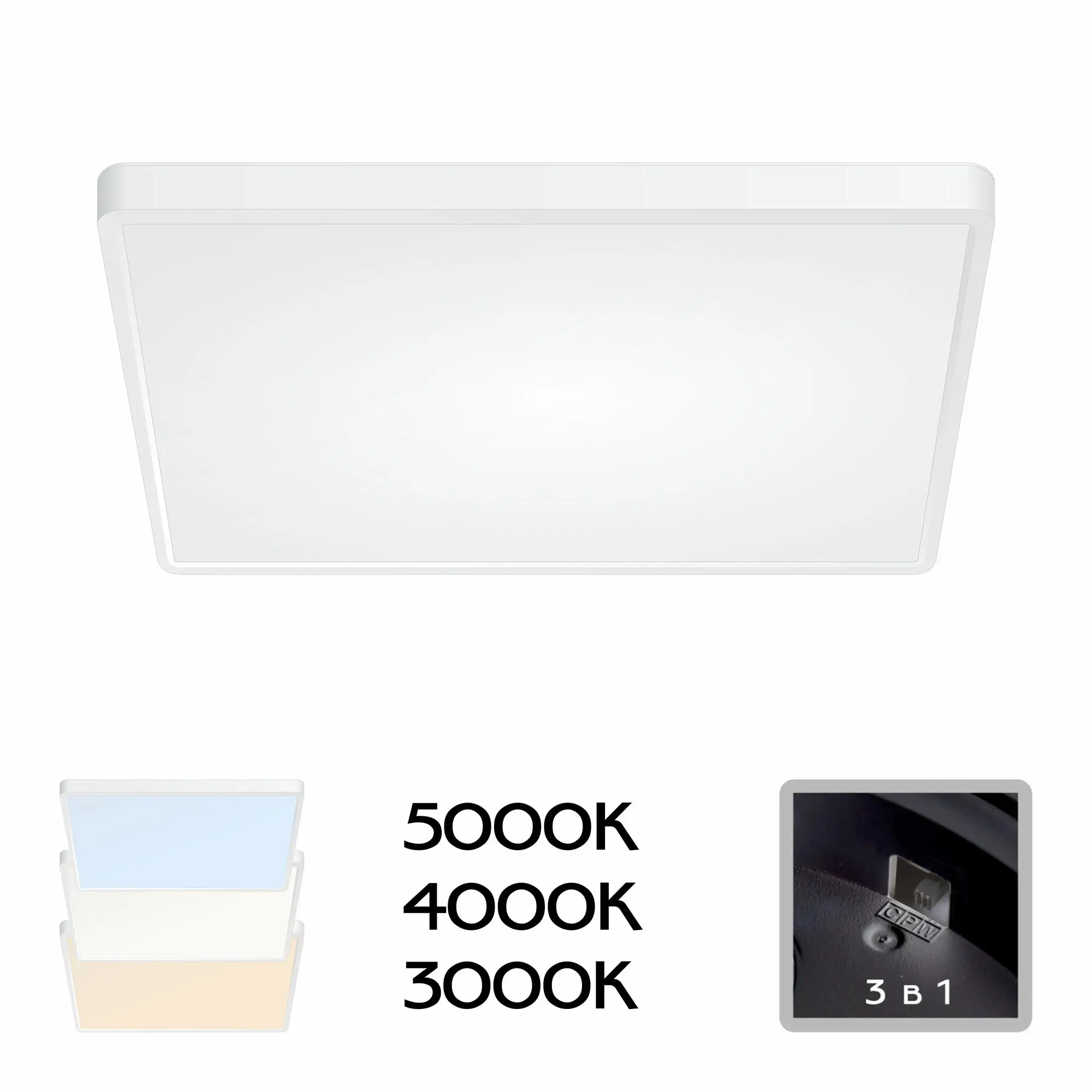 Накладной светодиодный светильник Citilux Бейсик CL738K500V белого цвета, мощностью 50Вт. Квадратный корпус модели изготовлен из ударопрочного полимера, рассеиватель матовый из оптического полимера. Светильник обладает высокой энергоэффективностью – 120Лм/Вт, оснащен встроенным 3-х ступенчатым диммером 100-50-10% яркости, управляется настенным выключателем. Модель имеет ступенчатую регулировку цветовой температуры 3000К-4000К-5000К, для этого перед монтажом, на тыльной стороне светильника, переключателем устанавливается выбранный вариант свечения. Свет без мерцаний и пульсаций. Высота корпуса всего 25мм, тип крепления – удобная монтажная платформа,