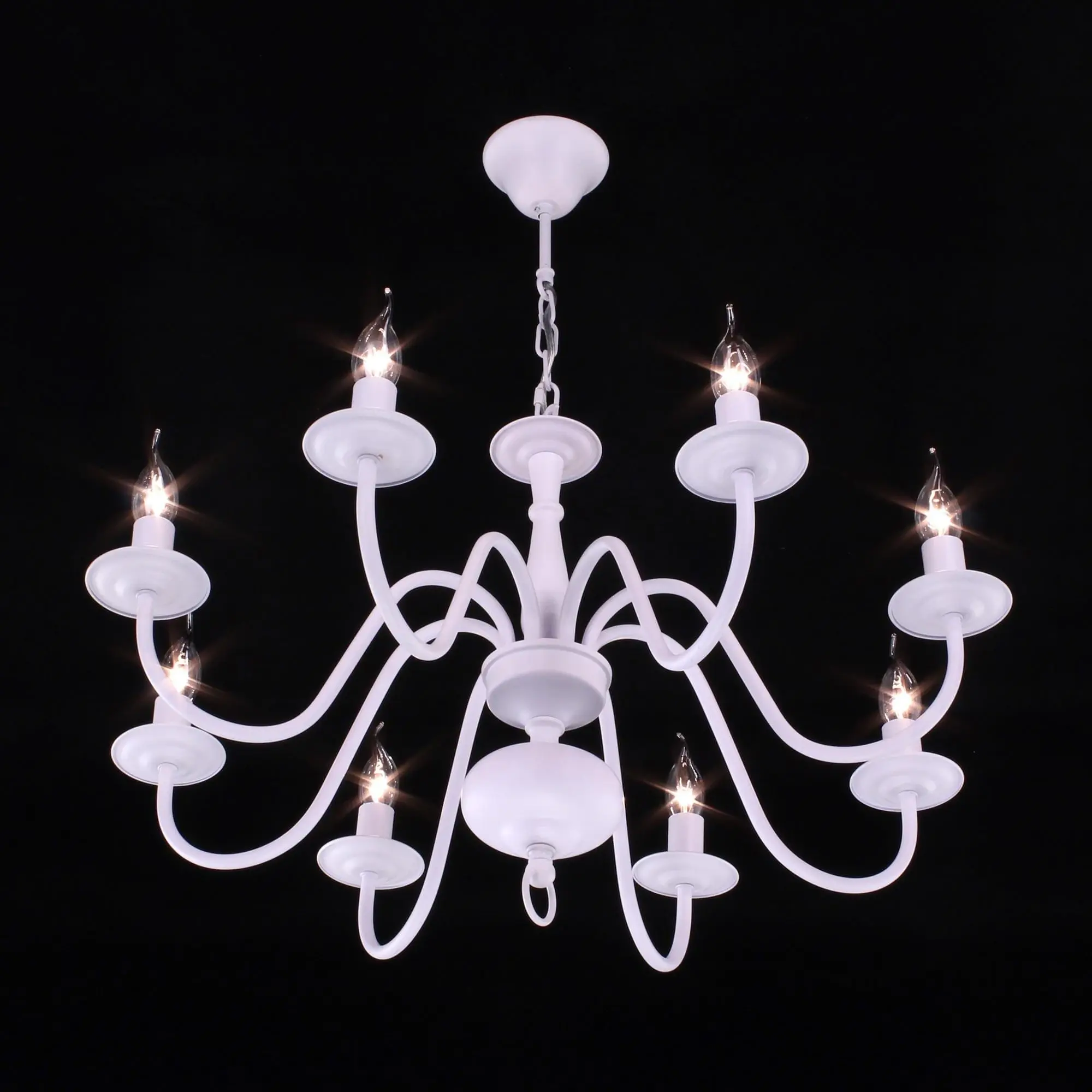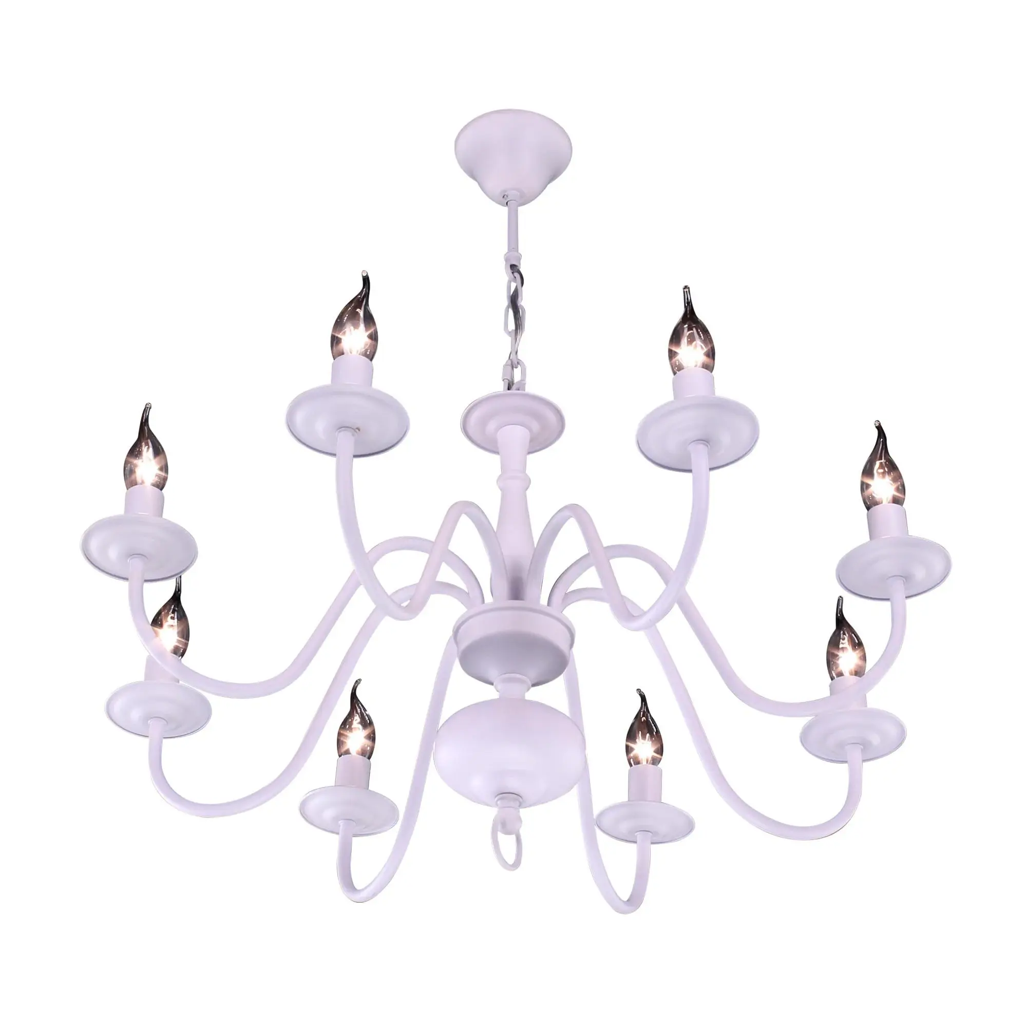 Корпус люстры — металлический, окрашен стильной белой краской с перламутровым отливом. Восемь рожков с открытыми лампами напоминают старинный классический светильник со свечками.
