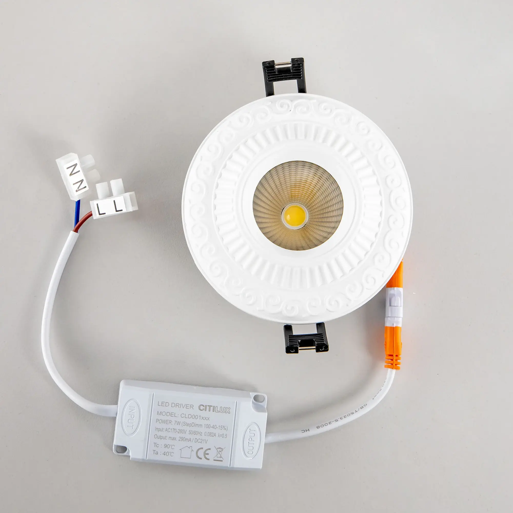 Встраиваемый светодиодный светильник Citilux Боска CLD041NW0 в классическом стиле. Корпус из прочного полимера, с текстурным узором, цвет белый. Изделие оснащено ярким светодиодом с мощным радиатором охлаждения. Мощность 7Вт, цветовая температура 3500К – нейтральный свет. Встроенный ступенчатый диммер 100-40-15% управляется обычным настенным выключателем. Свет безопасный для глаз, без мерцаний и пульсаций во всех режимах работы. Модель подходит для всех типов навесных и натяжных потолков,