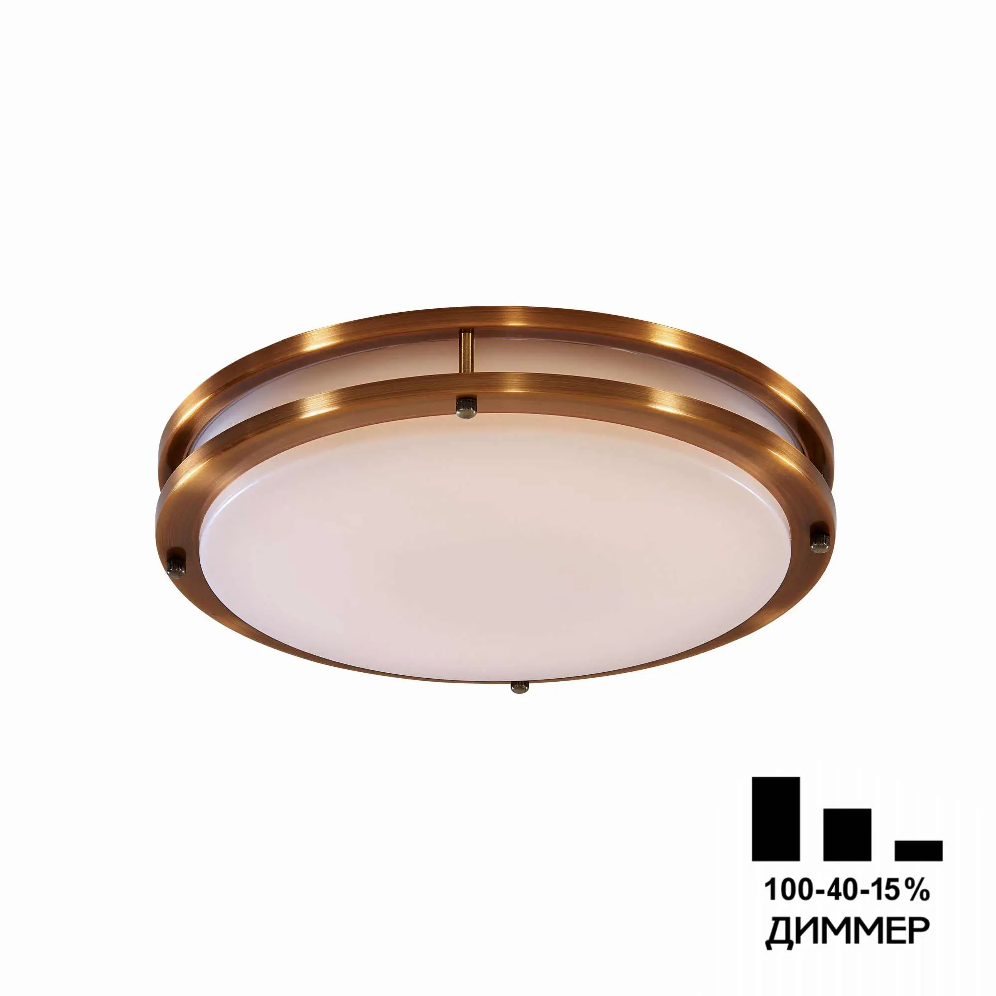 Светодиодный светильник Citilux Бостон CL709323N выполнен в современном стиле. Основание металлическое, круглой формы с декоративным внешним кольцом, цвет бронза. Плафон белый матовый из оптического полимера, прекрасно рассеивает яркий свет. Такие плоские светильники ещё называют светильник – таблетка. Изделие оснащено встроенным трехступенчатым диммером 100-40-15%, управляется обычным настенным выключателем. Диаметр 35,5см, высота 7,5см. Мощность 32Вт, цветовая температура 4000К – нейтральный белый свет, класс защиты IP44. Освети около 8м². Свет без мерцаний и пульсаций, что благотворно отразится на здоровье глаз. Данный настенно – потолочный светильник крепится к поверхности через основание. Крепёж в комплекте. Подходит для всех типов потолков, в том числе натяжных,