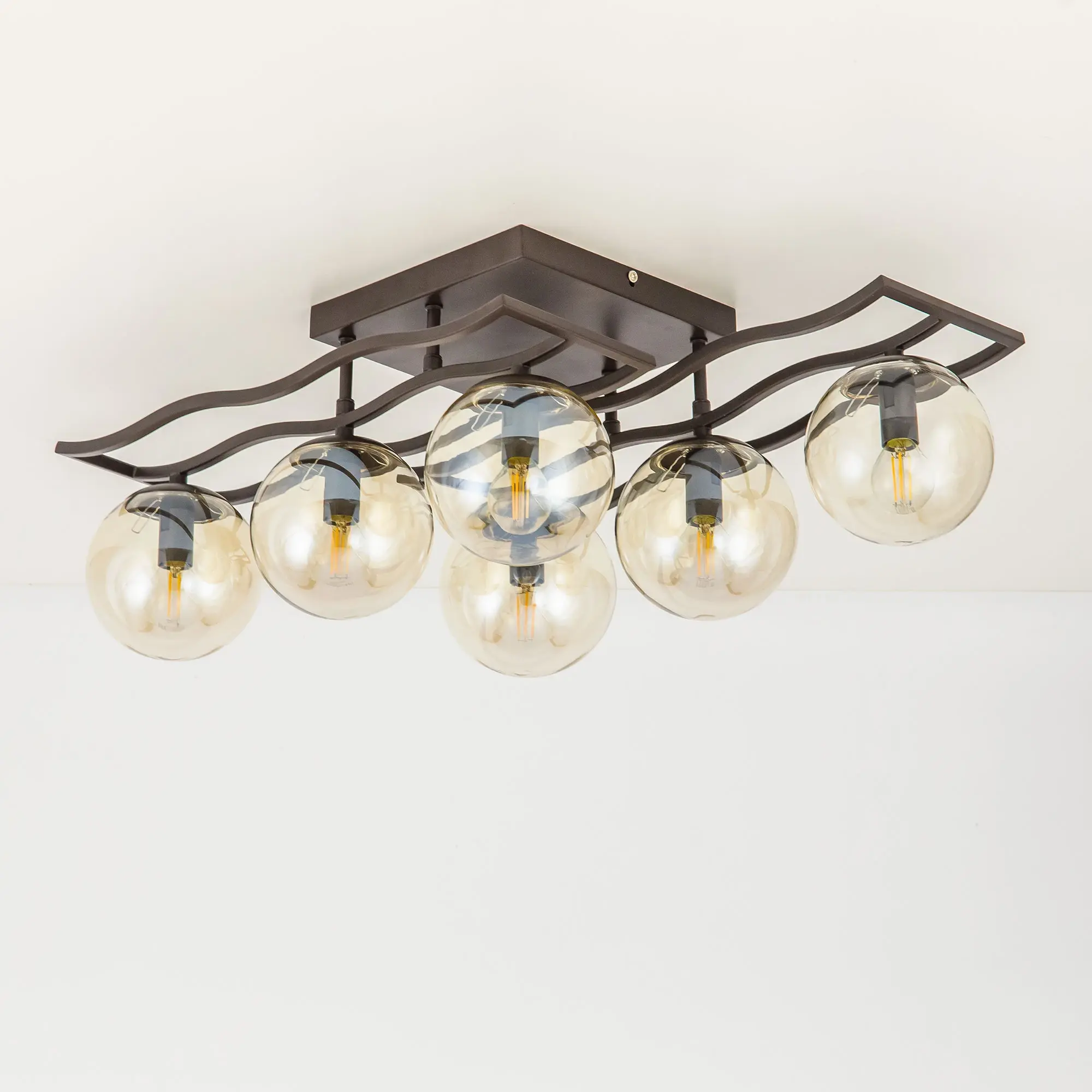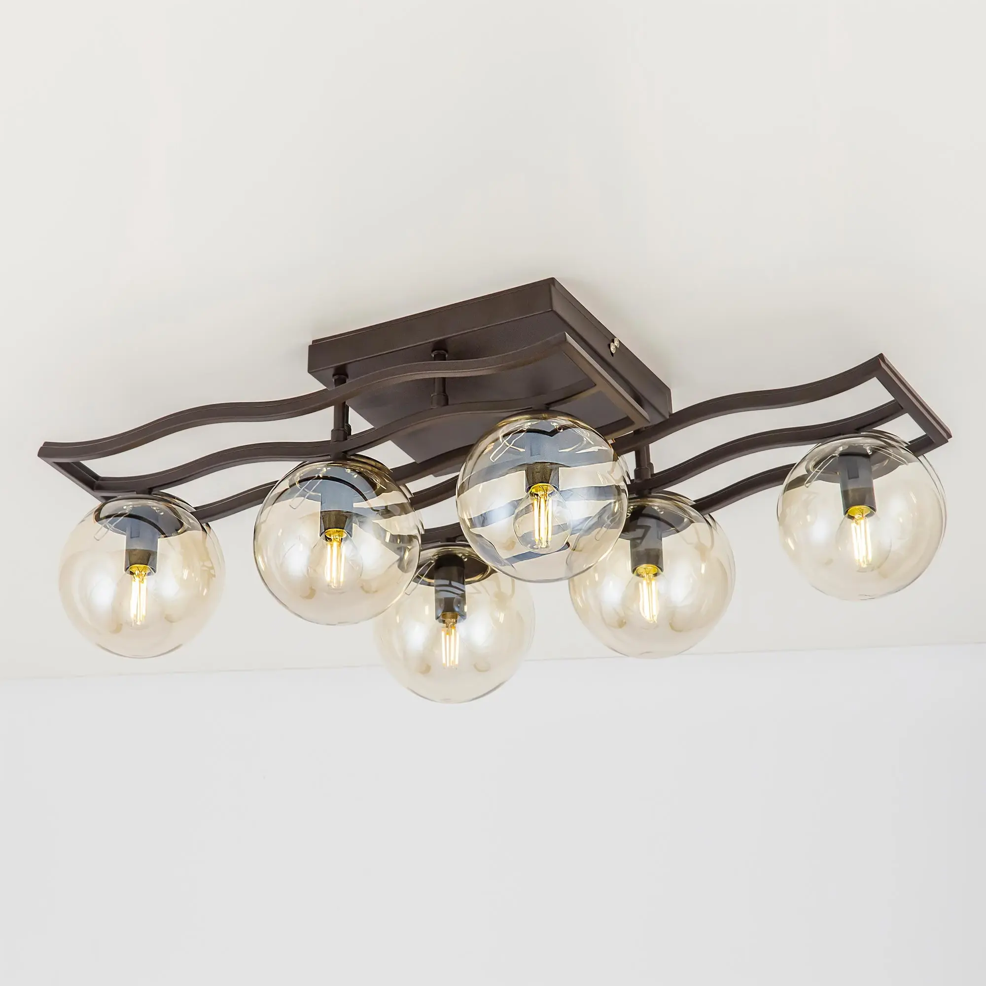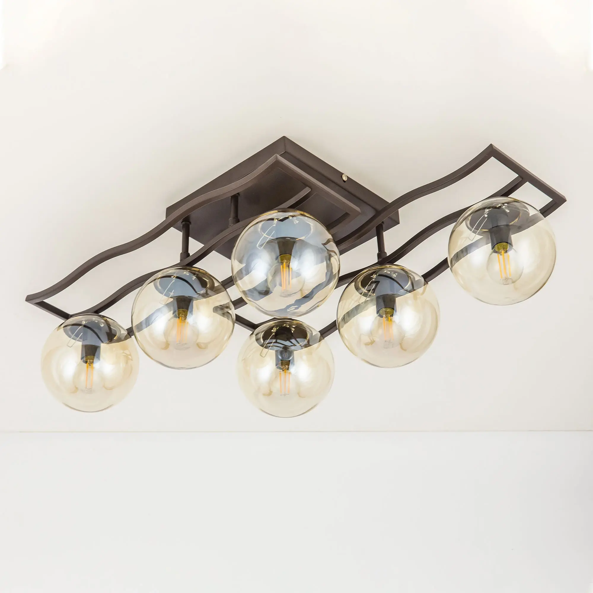 Люстра потолочная Citilux Бриз CL106265 с шестью плафонами. Корпус светильника металлический, каркас изогнутый, основание квадратной формы. Цвет модели коричневый матовый. Плафоны стеклянные прозрачные, модного оттенка шампань. Форма плафонов – шар. Тип крепления светильника к потолку – планка. Комплект поставки предусматривает использование люстры с одноклавишным выключателем. При необходимости, модель легко собирается специалистом для работы с двухклавишным выключателем. В модели используются шесть лампы с цоколем Е14 и максимальной мощностью для ламп накаливания 60Вт, суммарная мощность 360Вт. Светодиодные лампы можно использовать большей яркости. Площадь освещения около 21 кв. метров. Модель отлично подойдет для дизайнерских интерьеров, оформленных в современном стиле или в стиле лофт