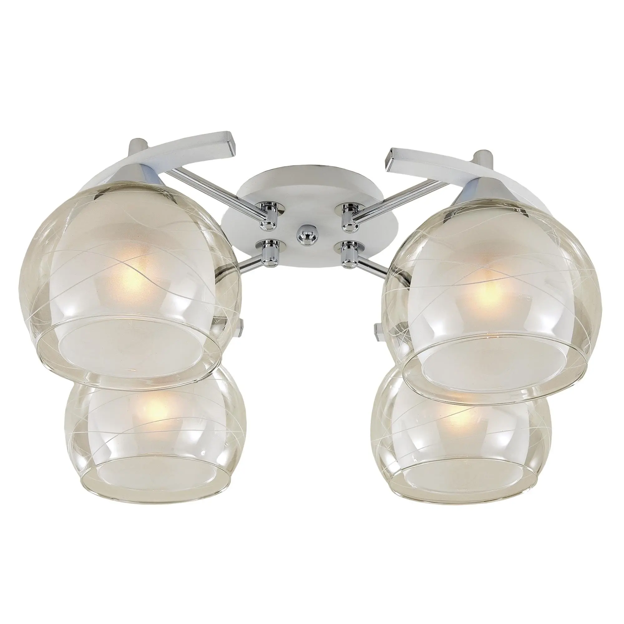 Потолочные светильники серии «Буги» выделяется интересным дизайном в стиле модерн. Люстры сделаны из легкого метала и интересными стеклянными двойными плафонами. Внешняя сторона плафона прозрачная с дизайнерским узором, а внутренняя полупрозрачная. За счёт полупрозрачного плафона свет в помещении получается очень яркий, равномерно рассеянный, но вместе с тем мягкий, приятный для зрения. Арматура модели на четыре рожка с завода в упаковке собрана и скоммутирована на двойной выключатель. Деление осуществлено пополам, с одной клавиши будет включаться два плафона, со второй ещё два. Подключение произведено через один плафон. Люстры производятся в двух цветах: белый плюс хром, идеальное решение для нежных и светлых интерьеров, и алюминий плюс хром, который лучше сочетается с современными дизайнами. Крепятся люстры под потолком тем самым они не занимают место и прекрасно подходят к помещениям с небольшой высотой потолка. Патроны выполнены из термостойких материалов, выдерживают лампы накаливания до 75 ватт включительно, а энергосберегающие, или светодиодные лампы можно использовать любой яркости, что позволит вам осветить большие площади. Площадь освещения моделей на четыре рожка до 14 квадратных метров.