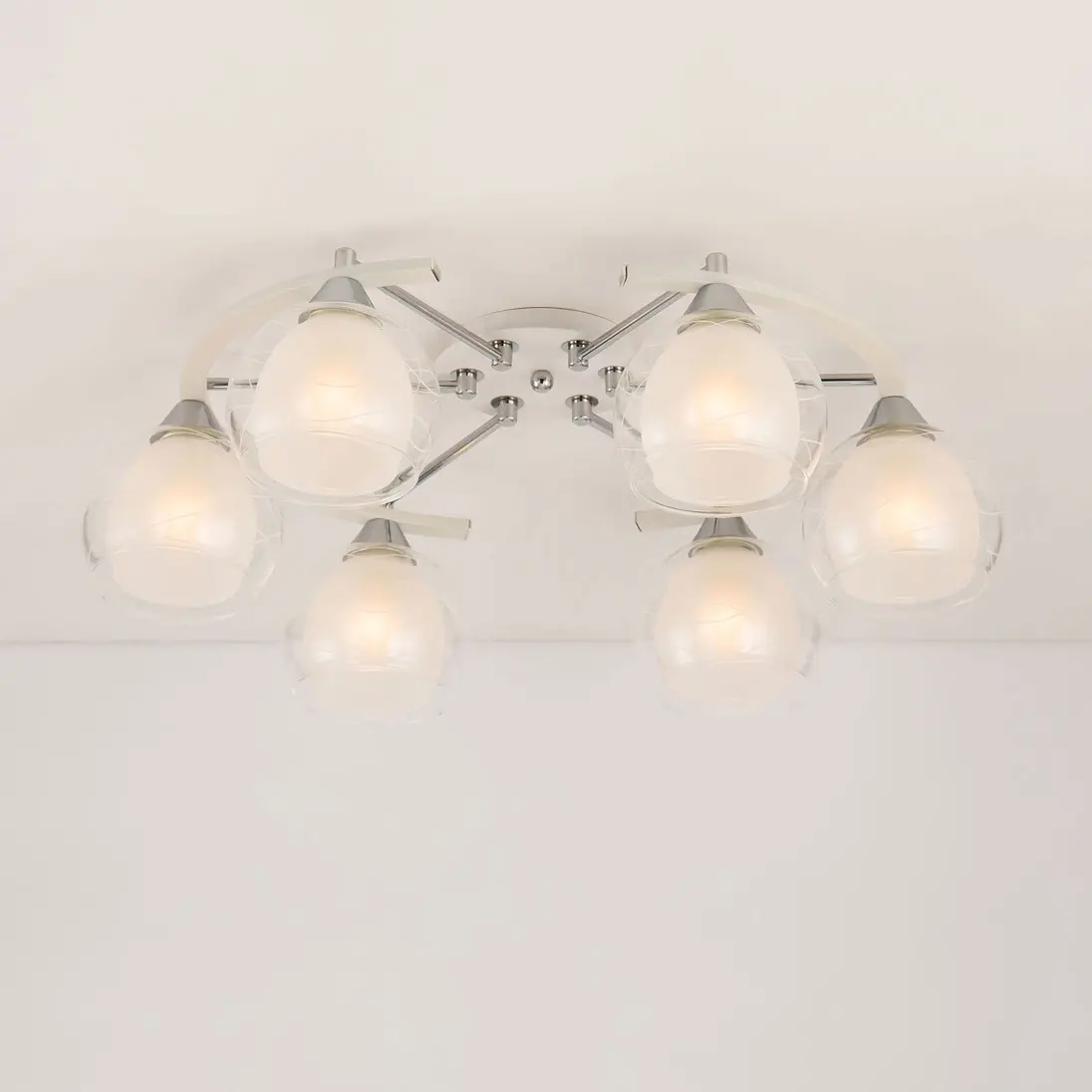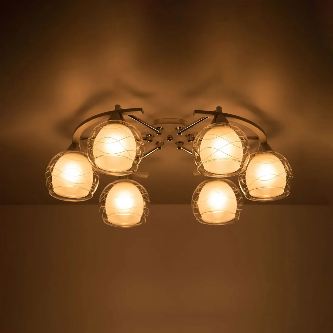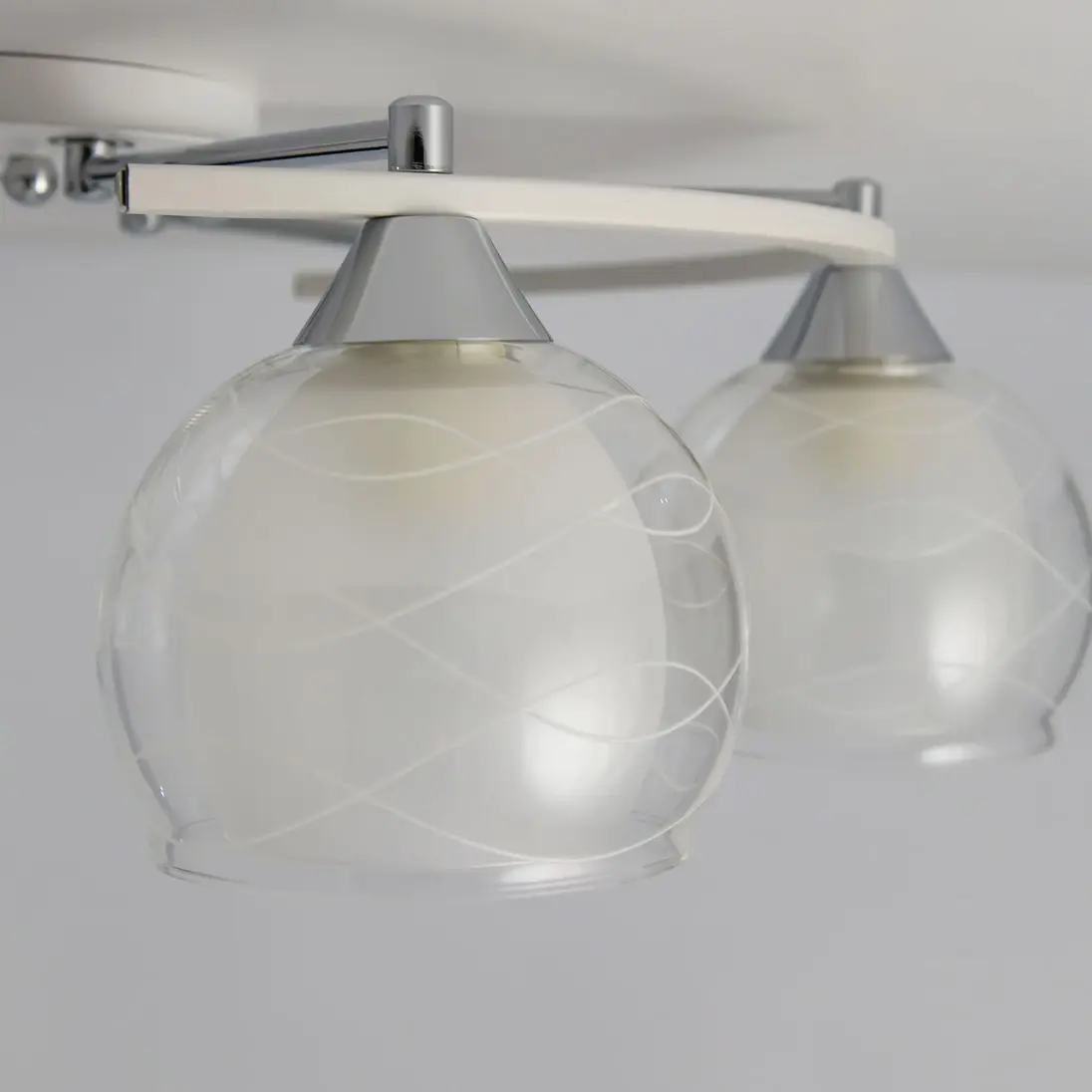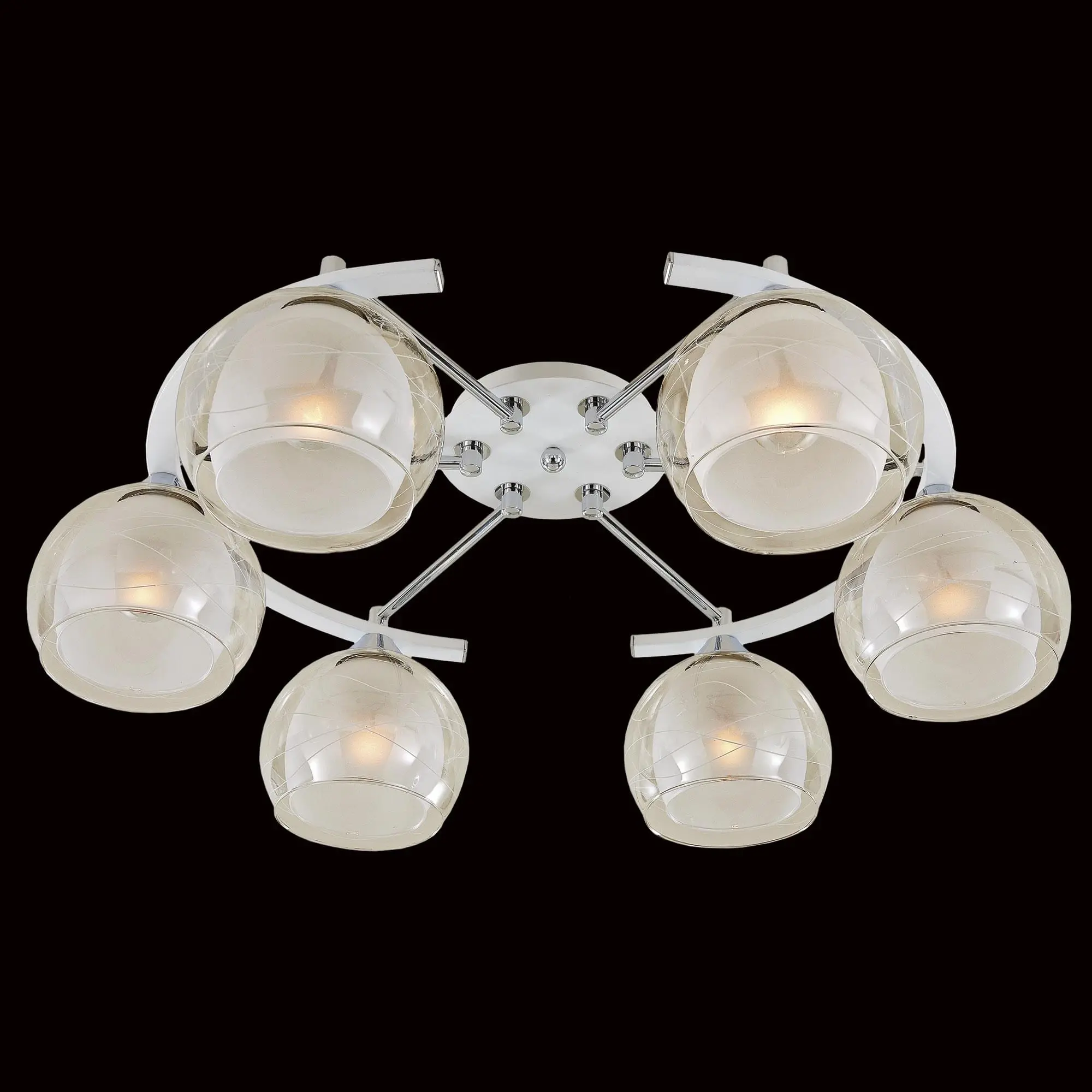 Потолочные светильники серии «Буги» выделяется интересным дизайном в стиле модерн. Люстры сделаны из легкого метала и интересными стеклянными двойными плафонами. Внешняя сторона плафона прозрачная с дизайнерским узором, а внутренняя полупрозрачная. За счёт полупрозрачного плафона свет в помещении получается очень яркий, равномерно рассеянный, но вместе с тем мягкий, приятный для зрения. Арматура модели на шесть рожков с завода в упаковке собрана и скоммутирована на двойной выключатель. Деление осуществлено 4х2, с одной клавиши будет включаться четыре плафона, со второй ещё два. Подключение произведено через один плафон. Люстры производятся в двух цветах: белый плюс хром, идеальное решение для нежных и светлых интерьеров, и алюминий плюс хром, который лучше сочетается с современными дизайнами. Арматура слегка вытянута, не идеальный круг. Такое конструктивное решение позволяет достигать хороших показателей освещённости по углам комнаты. Крепятся люстры под потолком тем самым они не занимают место и прекрасно подходят к помещениям с небольшой высотой потолка. Патроны выполнены из термостойких материалов, выдерживают лампы накаливания до 75 ватт включительно, а энергосберегающие, или светодиодные лампы можно использовать любой яркости, что позволит вам осветить большие площади. Площадь освещения моделей на четыре рожка до 21 квадратного метра.