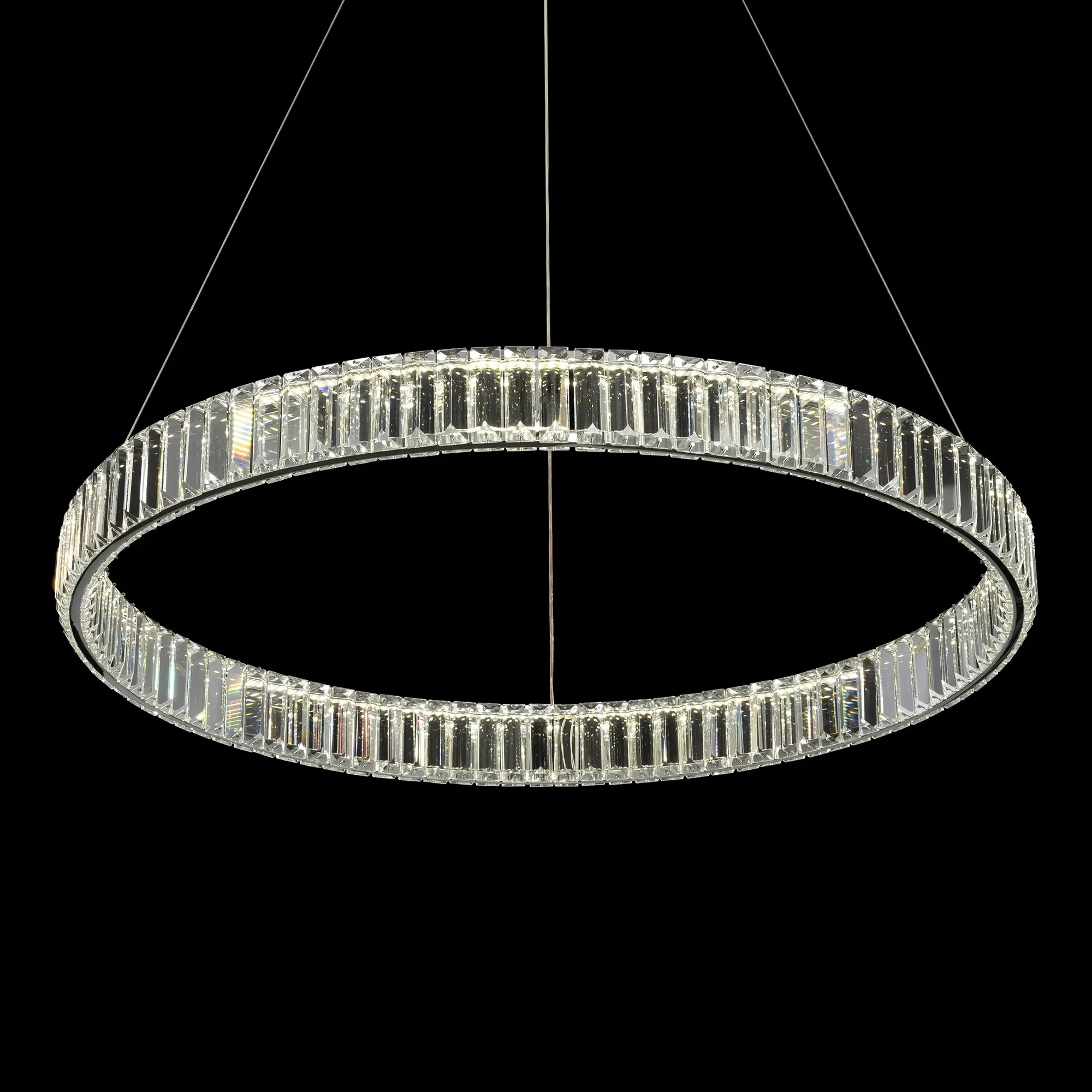 Высота подвесной модели легко регулируется в диапазоне от 40см до 1,5м, что делает ее идеальным решением для помещений с высокими, стандартными и низкими потолками. Диаметр кольца 800мм. Мощность изделия 70Вт, что позволяет ей осветить площадь до 23м², создавая при этом яркое и равномерное освещение.