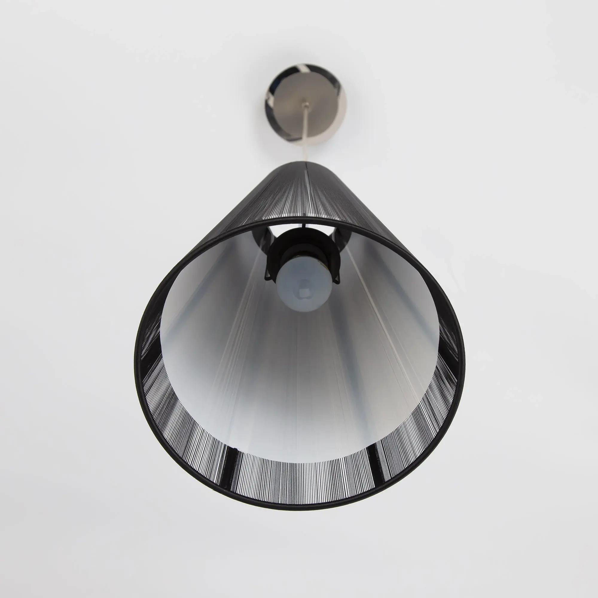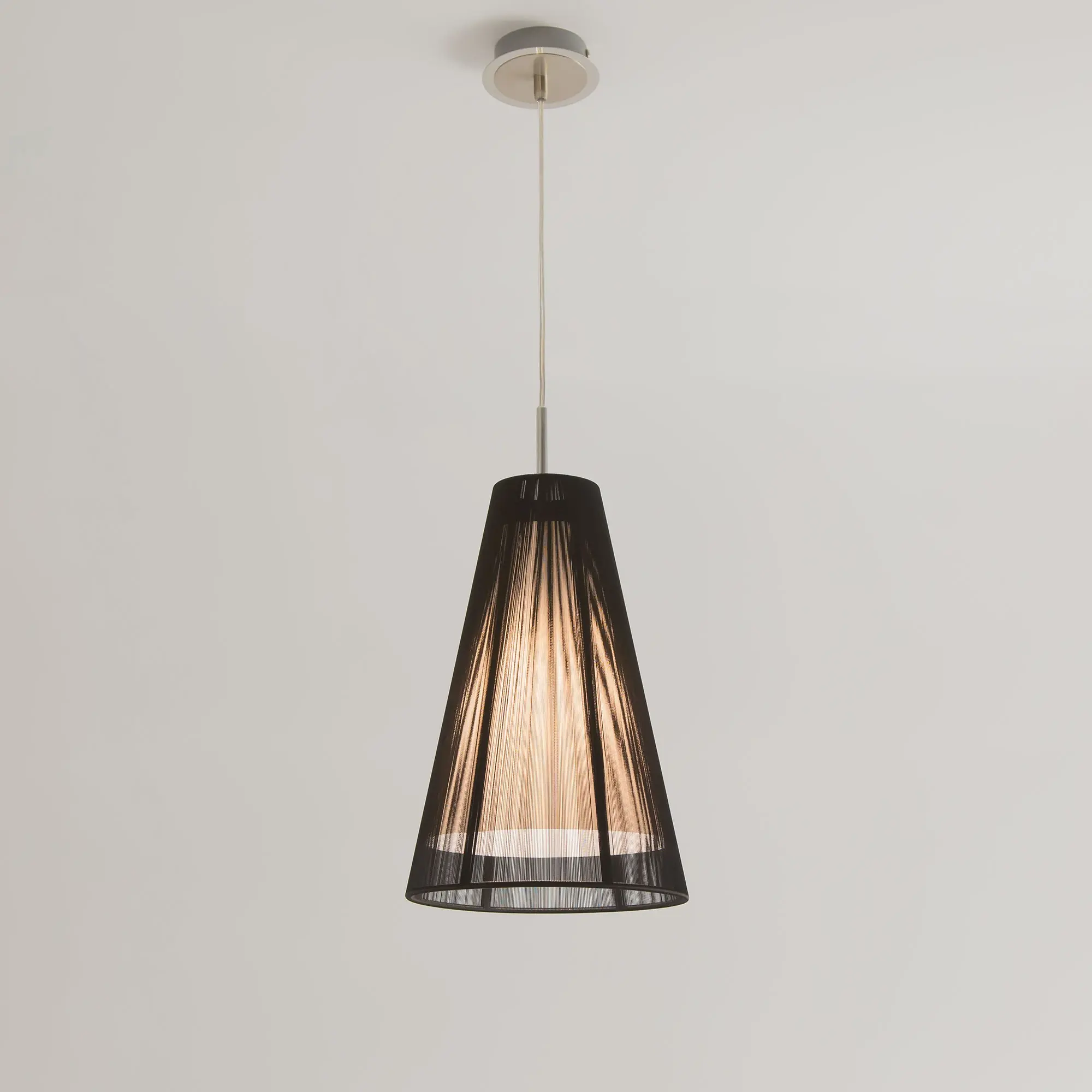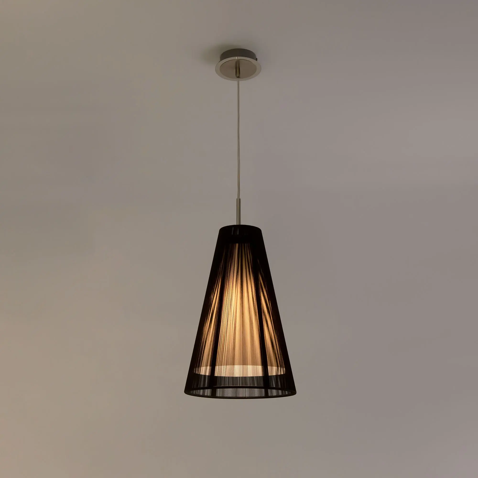 Утончённый подвесной светильник Citilux LOUIS CL936008 выполнен в современном стиле. Основание изготовлено из металла с хромированным покрытием, где блестящие поверхности эффектно сочетаются с матовыми, создавая игру текстур. Абажур, выполненный в форме усеченного конуса, обтянут тонкими чёрными нитями, для добавления акцентов и глубины. Внутри абажура скрыт матовой акриловой рассеиватель, обеспечивающий равномерное свечение без резких бликов.