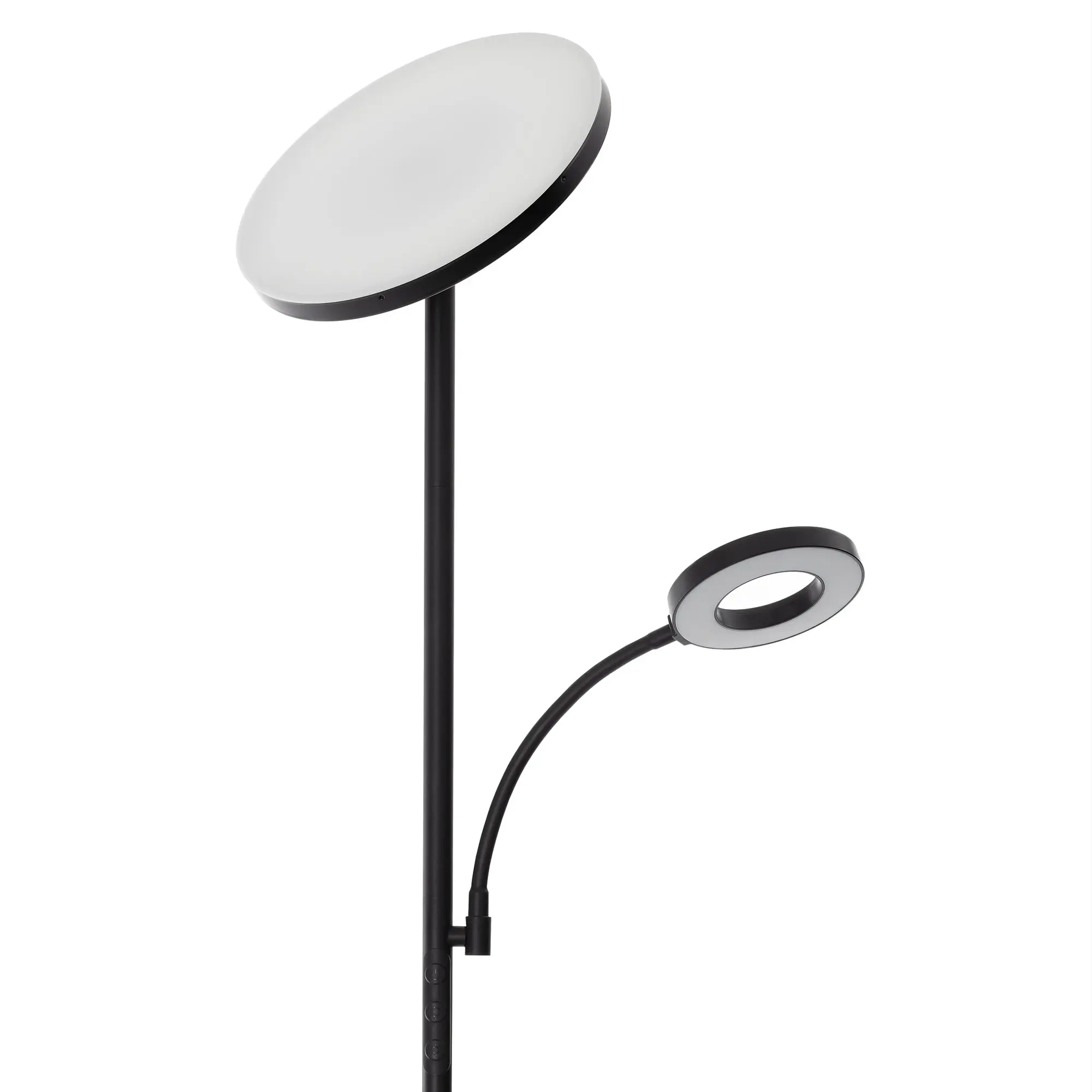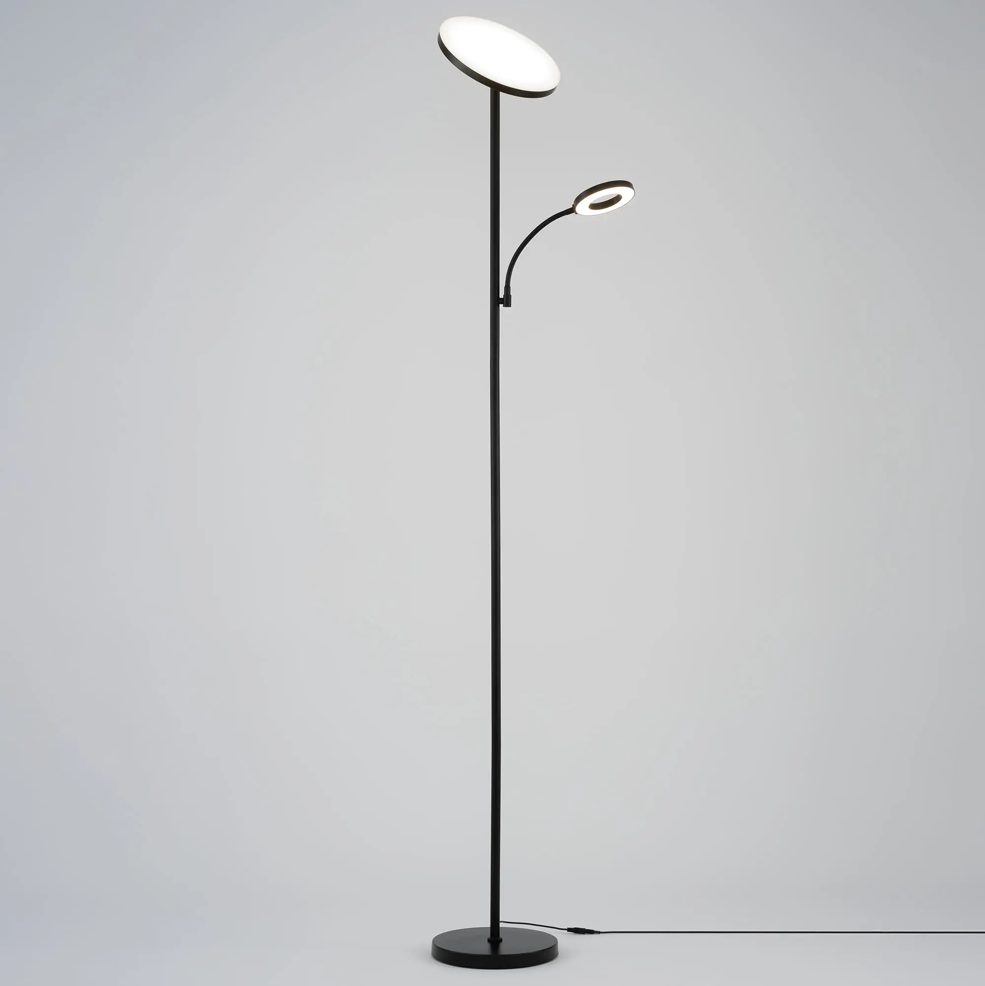 Светодиодный напольный светильник Citilux Click CL810011 с сенсорным управлением выполнен в современном стиле. Корпус металлический, цвет чёрный матовый. Торшер имеет два светодиодных модуля-плафона круглой формы. Верхний плафон поворотный, для общего освещения, мощность 35Вт. Нижний плафон для чтения, на гибкой ножке, мощность 7Вт.