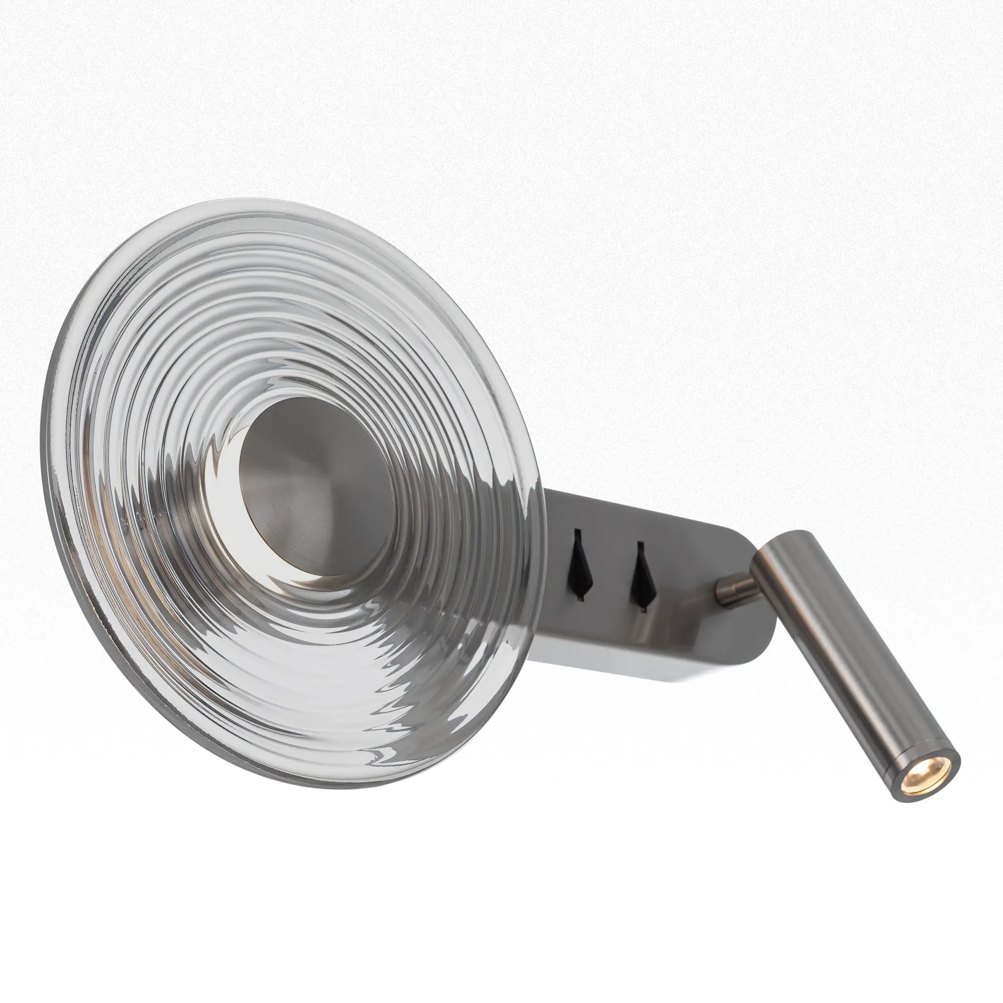 Дополнительный модуль для чтения закреплен на поворотном креплении, которое позволяет менять направление светового луча. Модуль включается независимо от основного света, два выключателя располагаются прямо на корпусе. Общая мощность светильника — 10Вт.