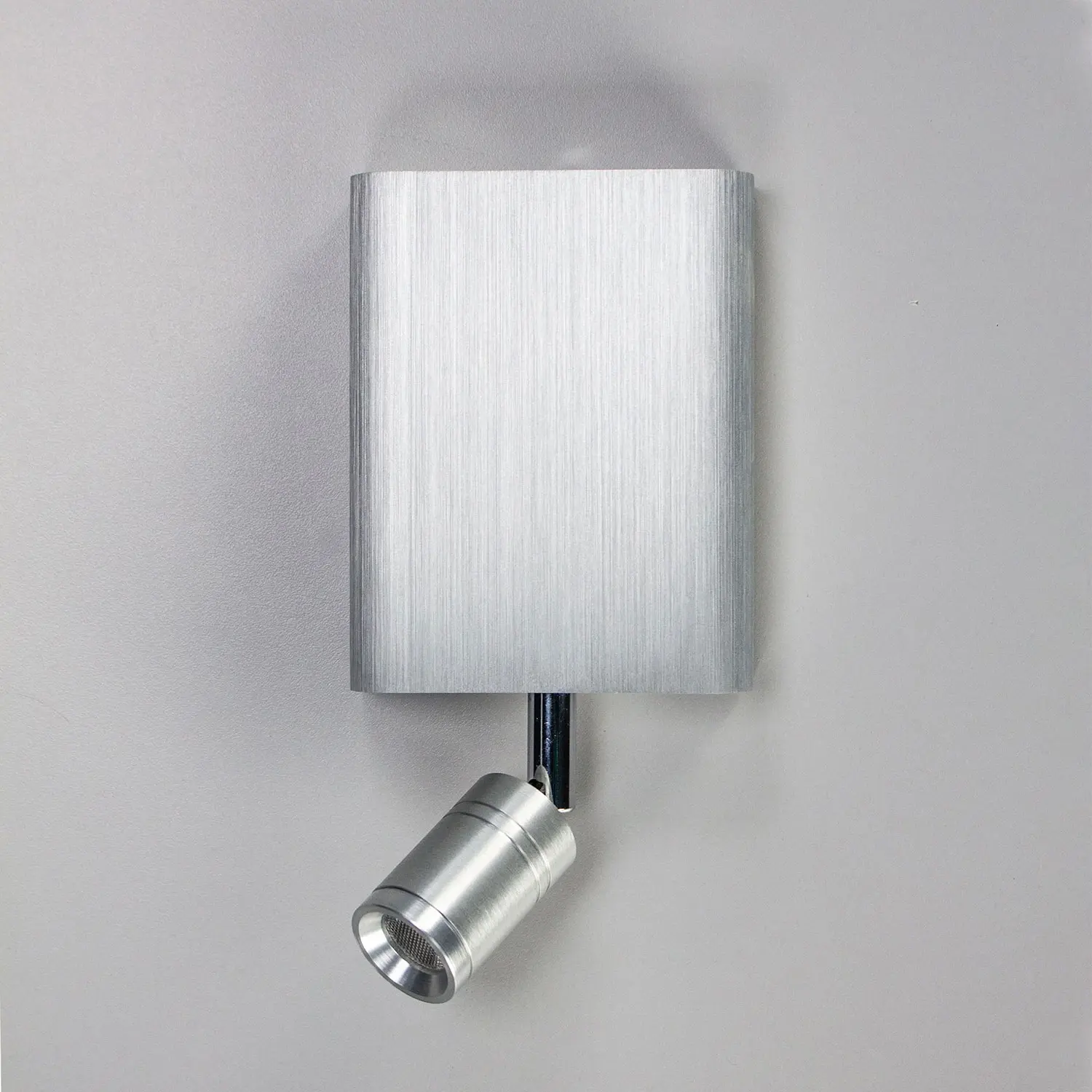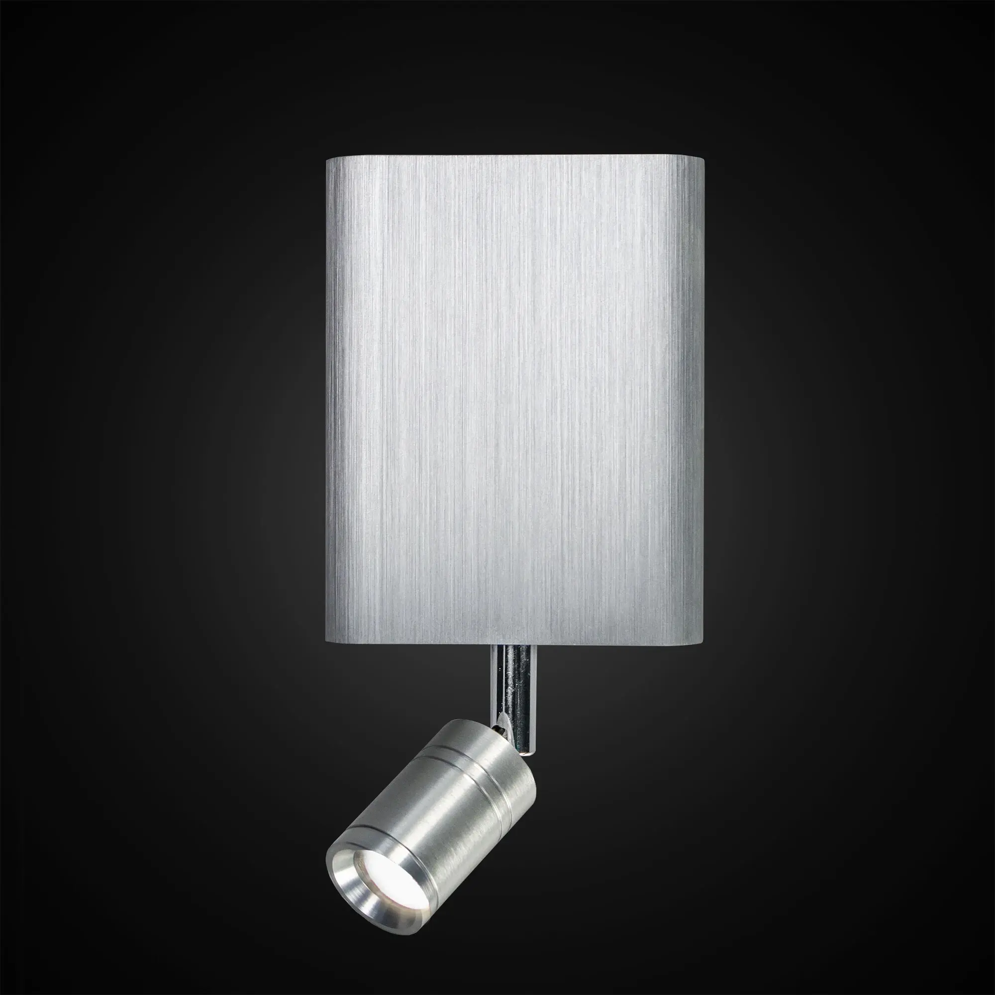 Корпус изделия металлический, цвет шлифованный алюминий. Модель компактная – высота 15,5см, ширина 9см. Светодиоды мощностью по 3Вт, расположенные сверху и снизу, обеспечивают мягкое и равномерное освещение. Цветовая температура 3000К – тёплый свет, безопасный для глаз, без мерцания и пульсаций.