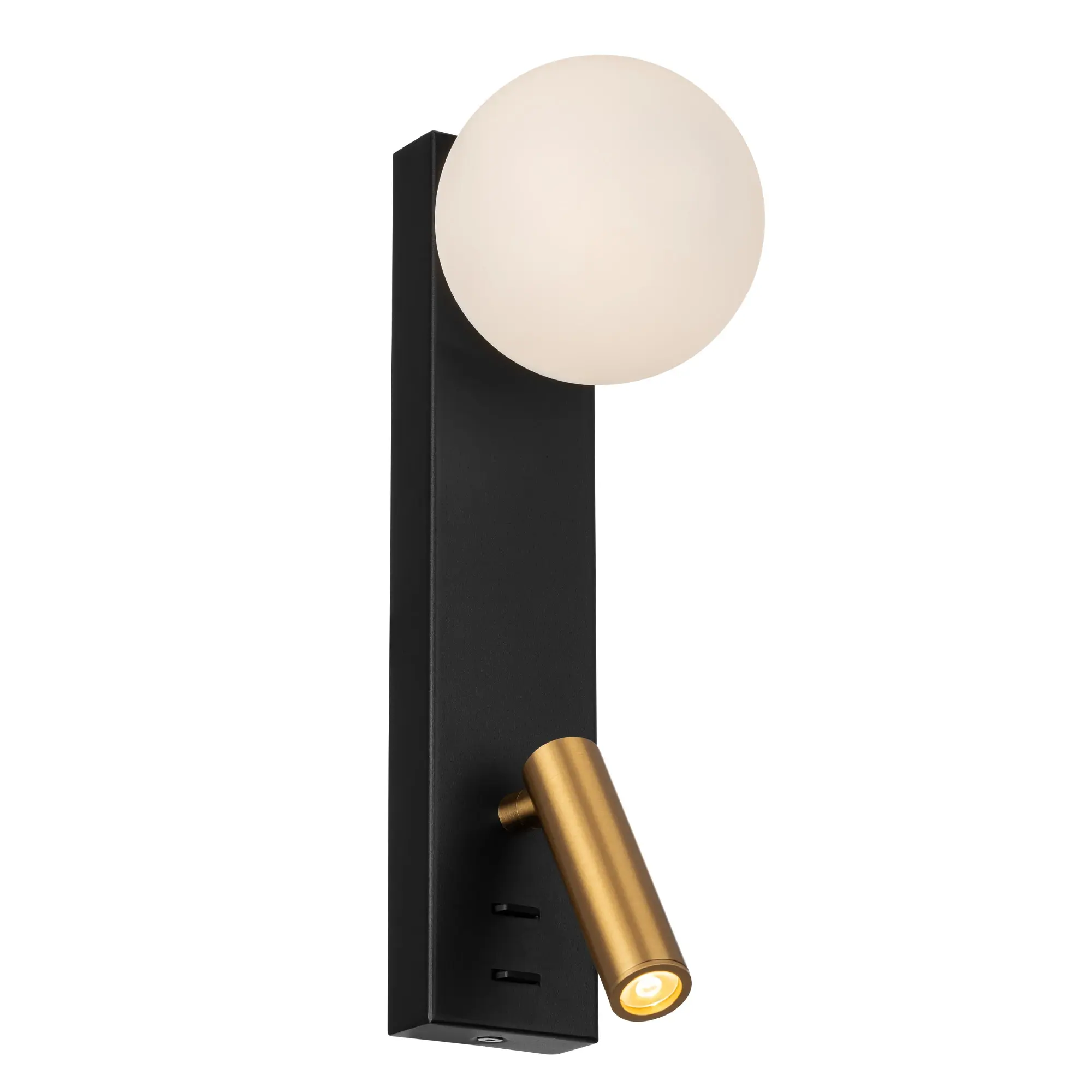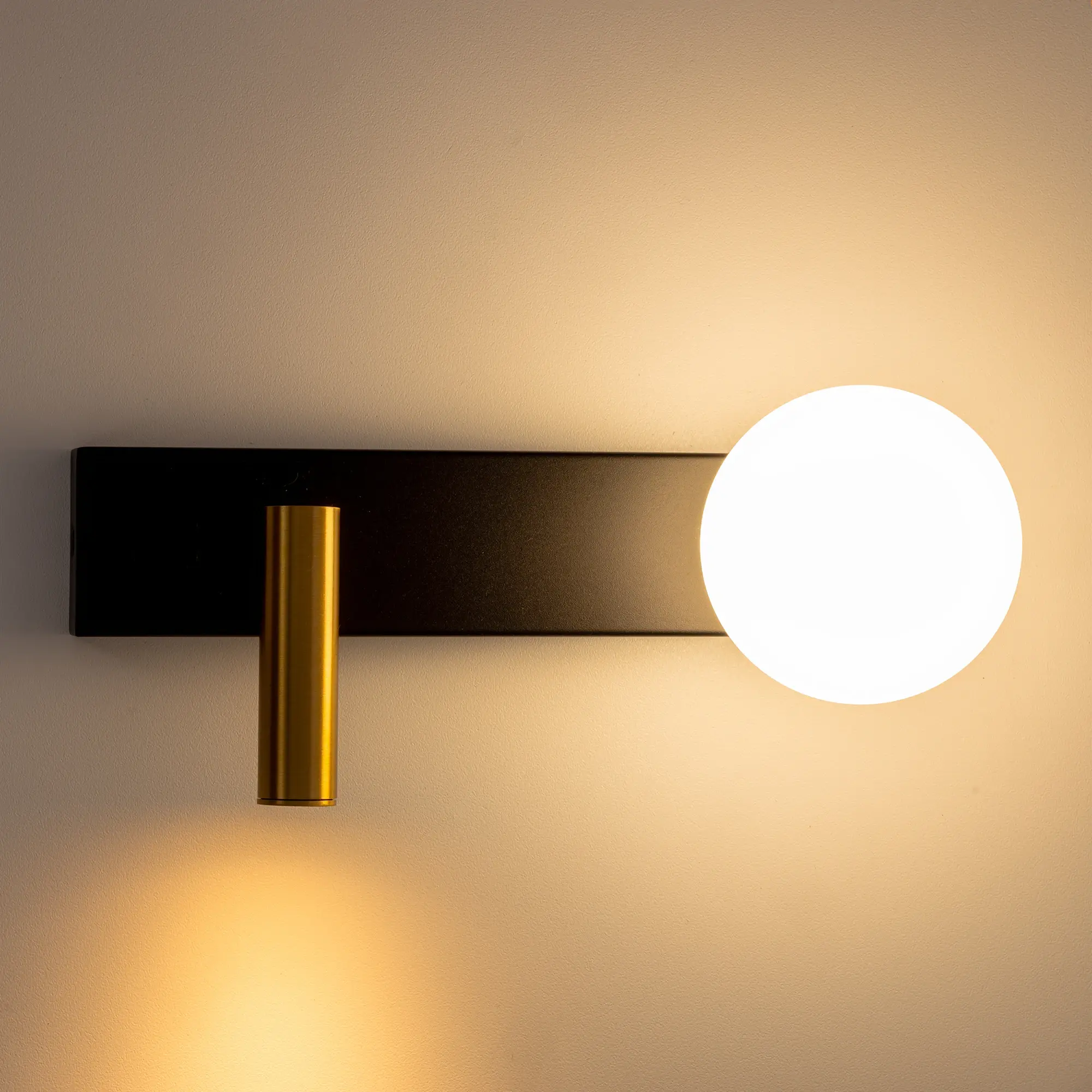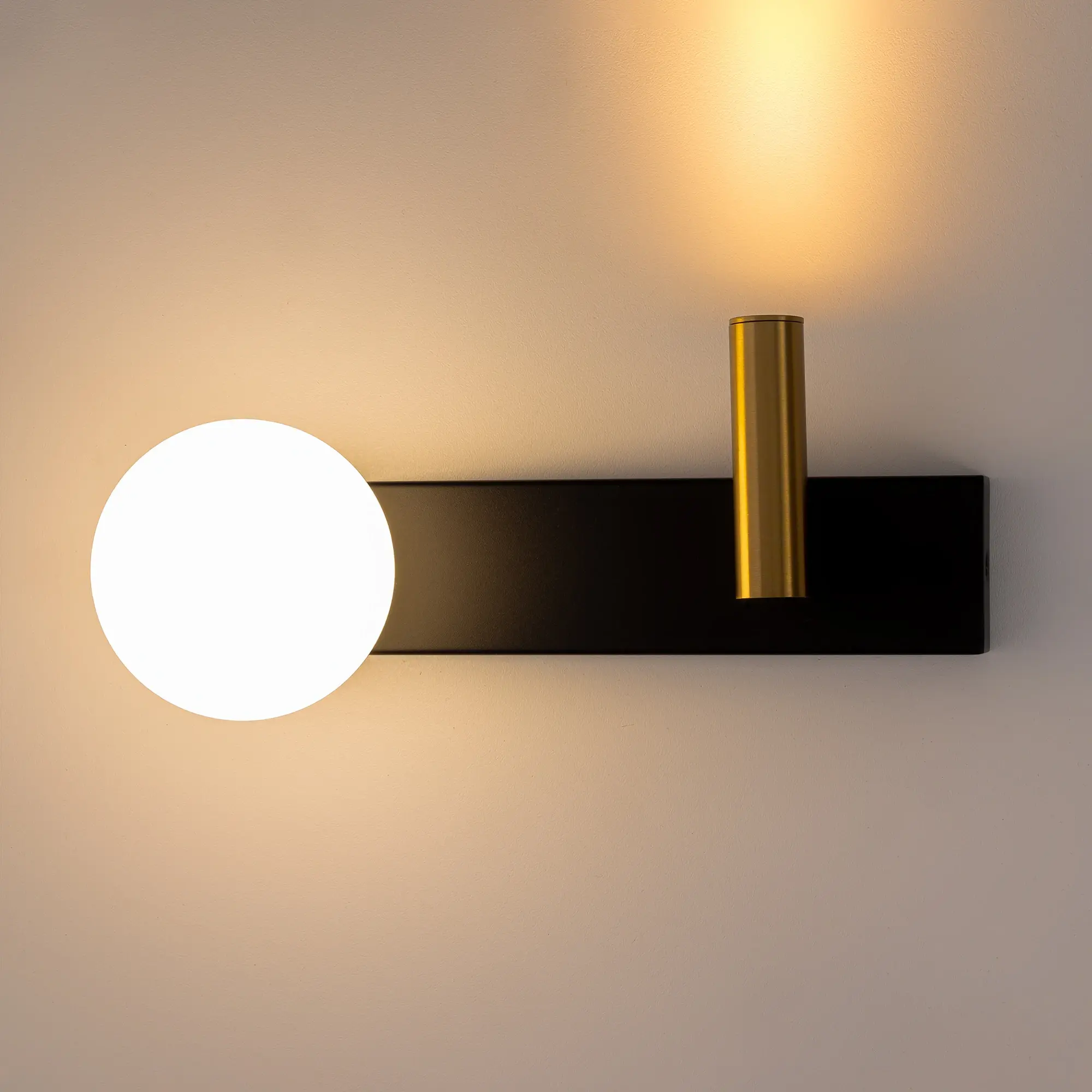 Светильник оснащен двумя источниками света: плафон в форме шара, из матового оптического полимера, для мягкого общего освещения и поворотный светодиодный модуль бронзового цвета для направленного акцентного света.