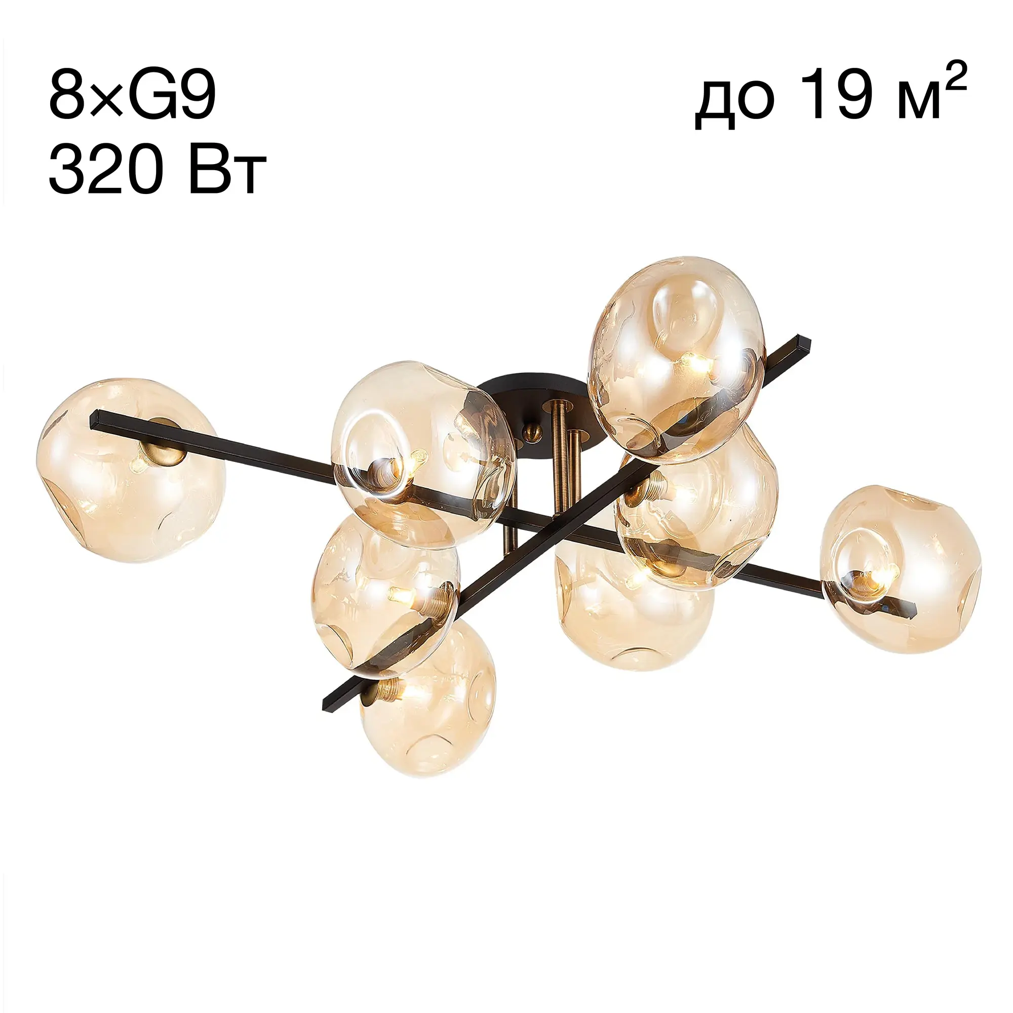 Люстра потолочная Citilux Девис CL201181. Корпус светильника металлический, коричневого цвета, с декоративными бронзовыми элементами. Основание круглой формы, рожки-штанги расположены друг к другу под прямым углом. Стеклянные прозрачные плафоны необычной формы модного оттенка шампань. В люстре восемь ламп с цоколем G9 и максимальной мощностью для галогеновых ламп 40Вт. Светодиодные лампы можно использовать более яркие. Модель подходит для всех типов потолков, в том числе натяжных. Тип крепления – планка. Площадь освещения около 19 кв. метров.,